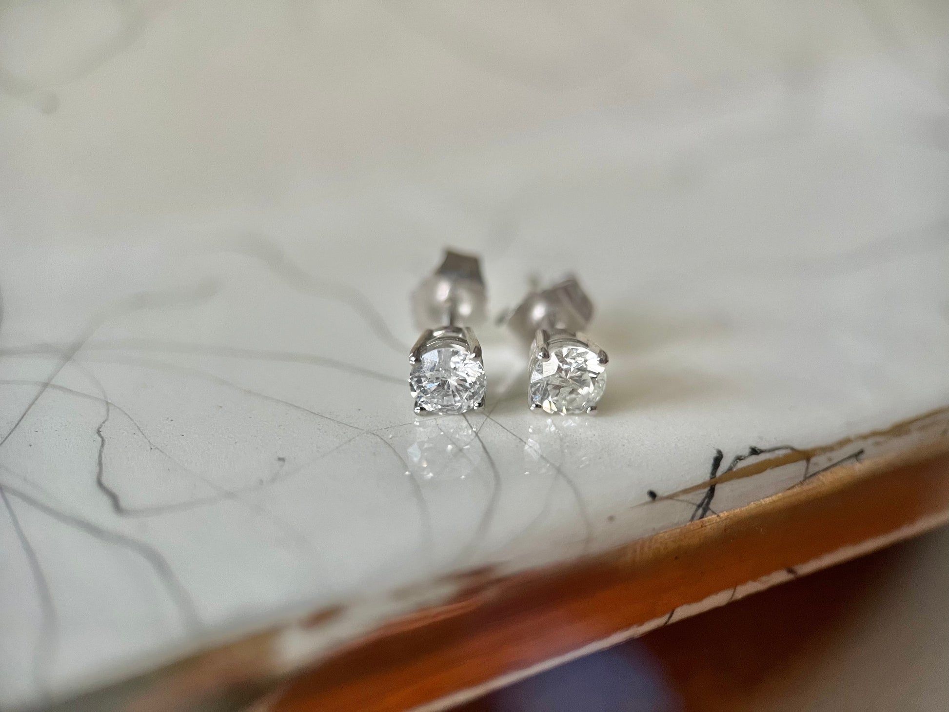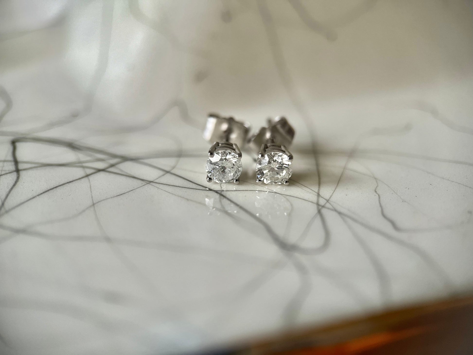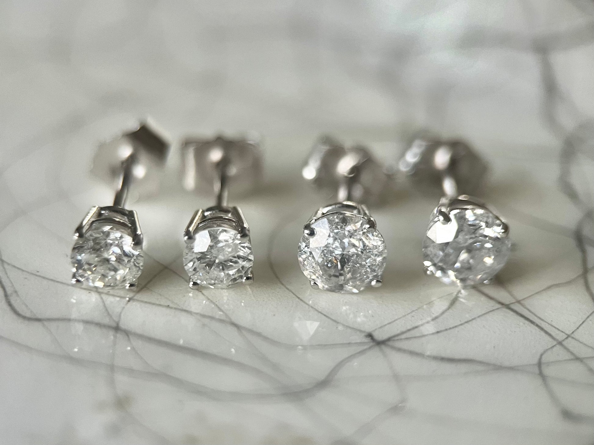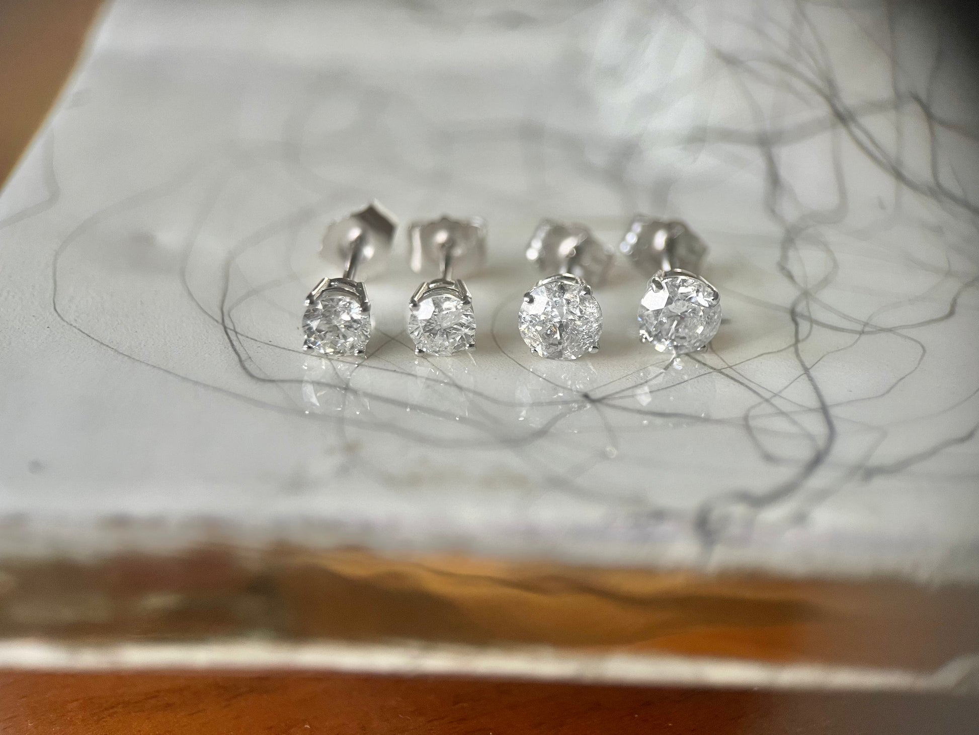 Looking for a simple diamond stud? We have two pairs of natural diamond stud earrings, set in four prong basket settings, made of 14k white gold and come with push backs. Both pairs are made with H-I color, I2 clarity diamonds. Please review photos to see how they look on the ear. We currently have one pair of each size. We have access to all sizes up to 2 carats total weight, feel free to message us to find what you are looking for.