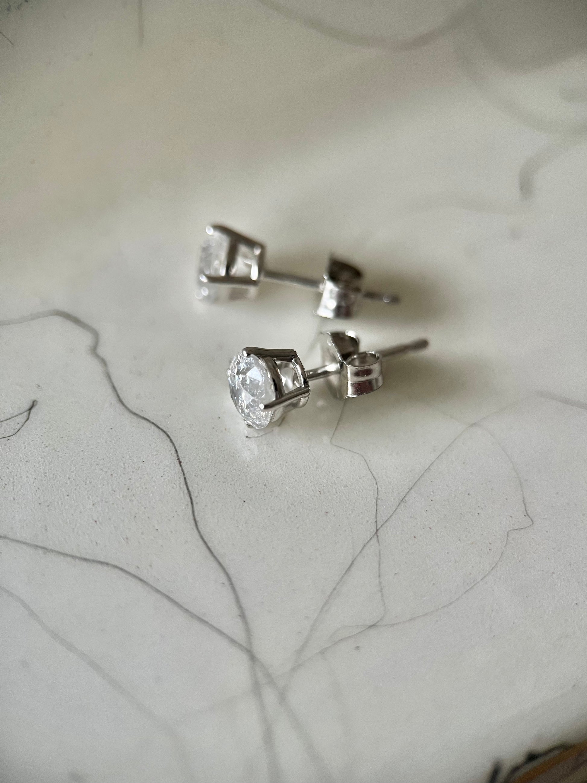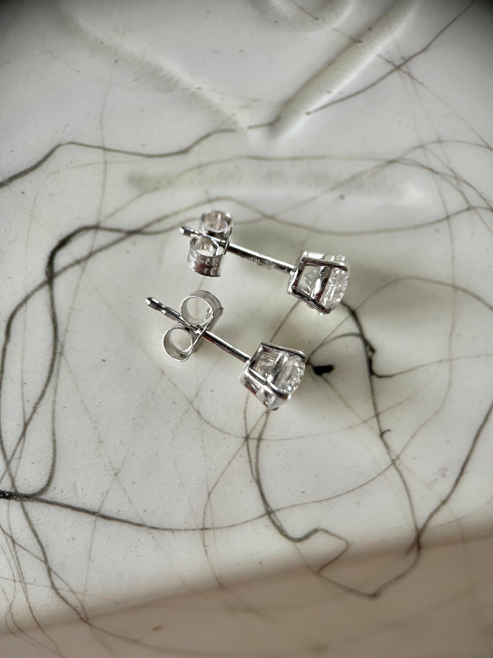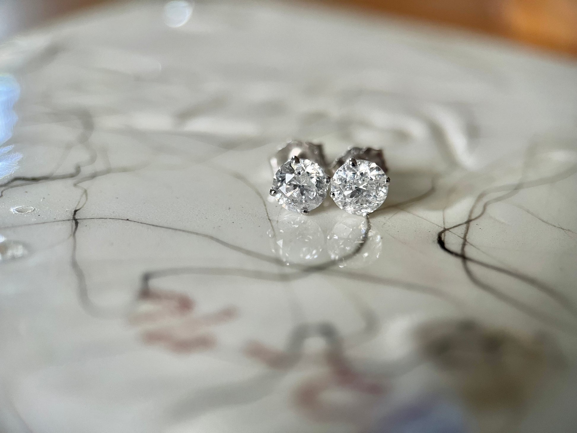 Looking for a simple diamond stud? We have two pairs of natural diamond stud earrings, set in four prong basket settings, made of 14k white gold and come with push backs. Both pairs are made with H-I color, I2 clarity diamonds. Please review photos to see how they look on the ear. We currently have one pair of each size. We have access to all sizes up to 2 carats total weight, feel free to message us to find what you are looking for.