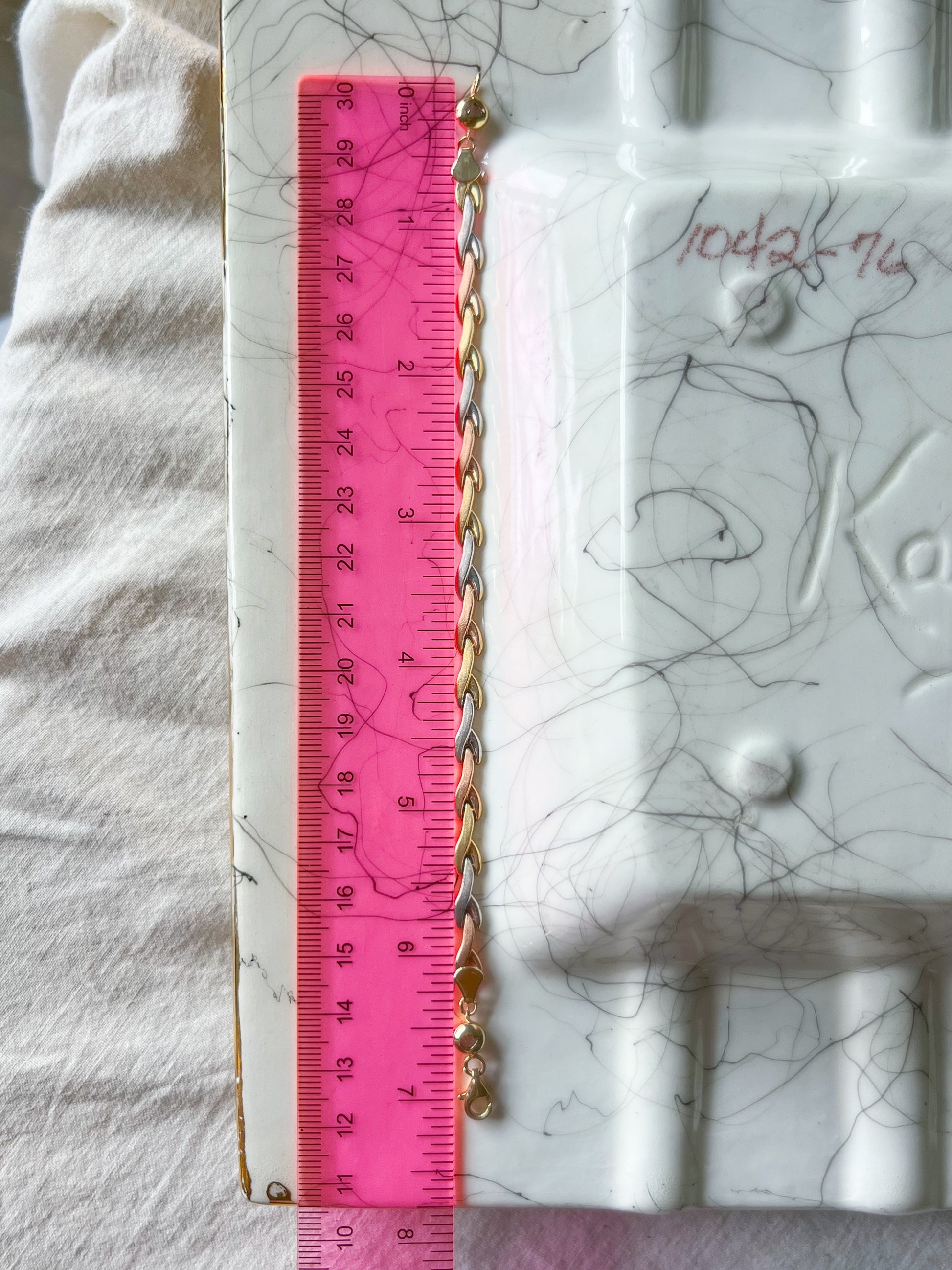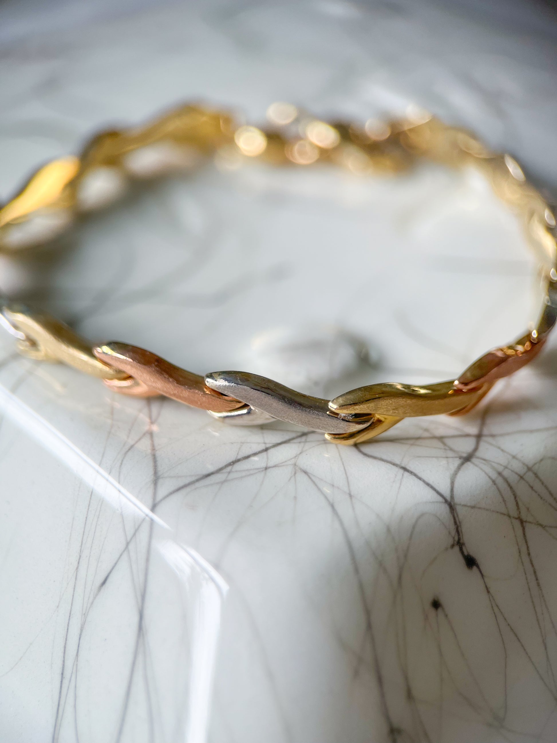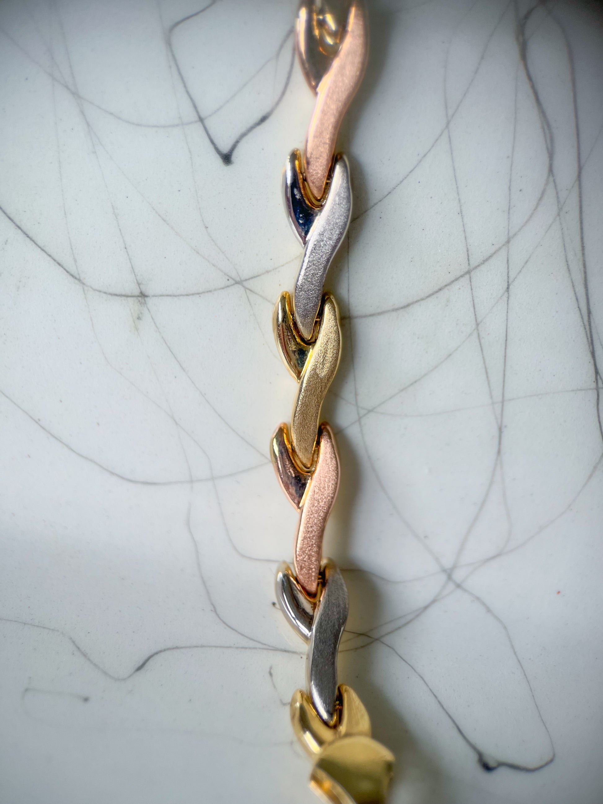 Perfect for those who wear all gold colors! This 14k yellow, white and rose gold bracelet is 7 inches long and weighs over 4 grams.