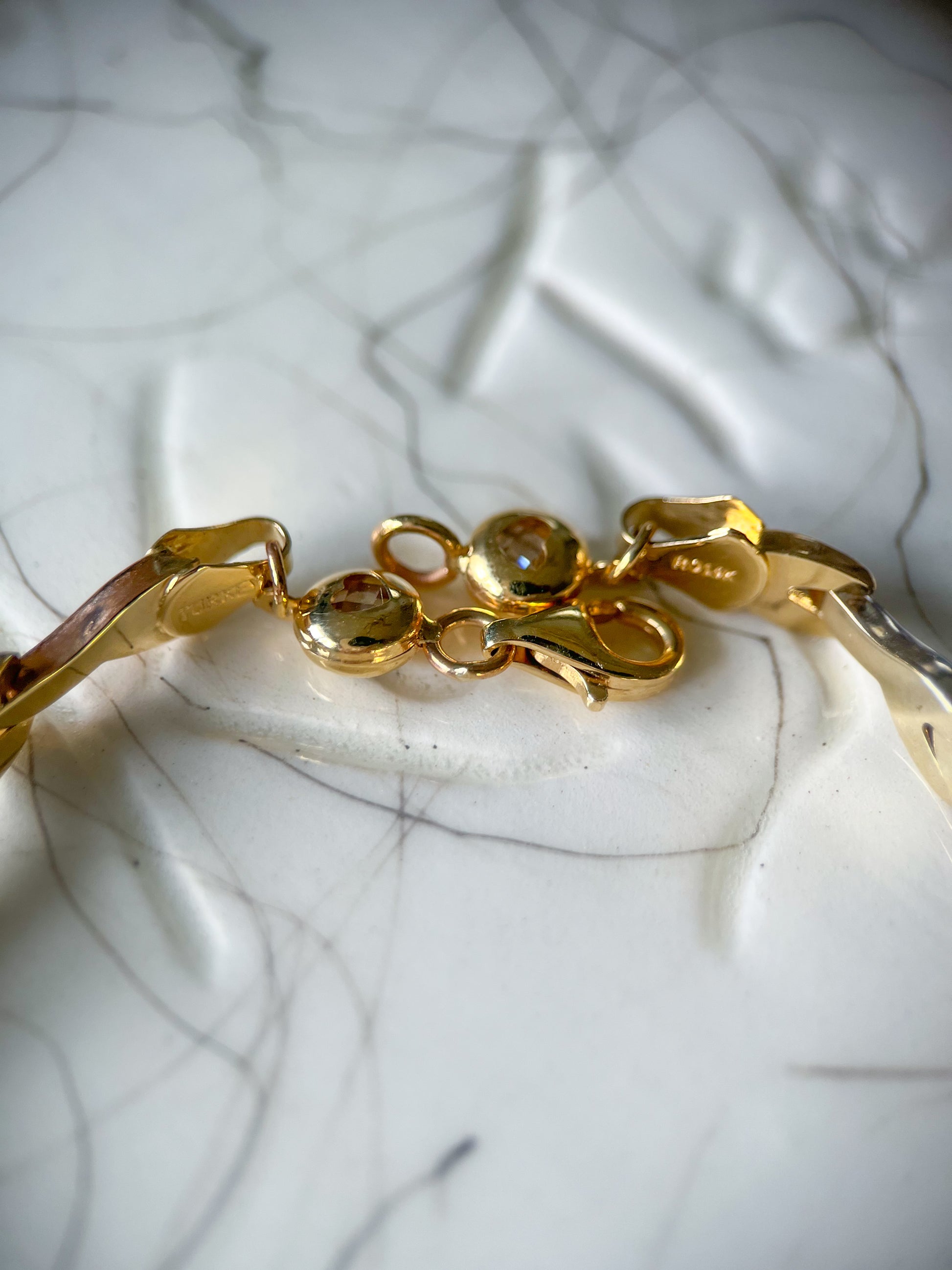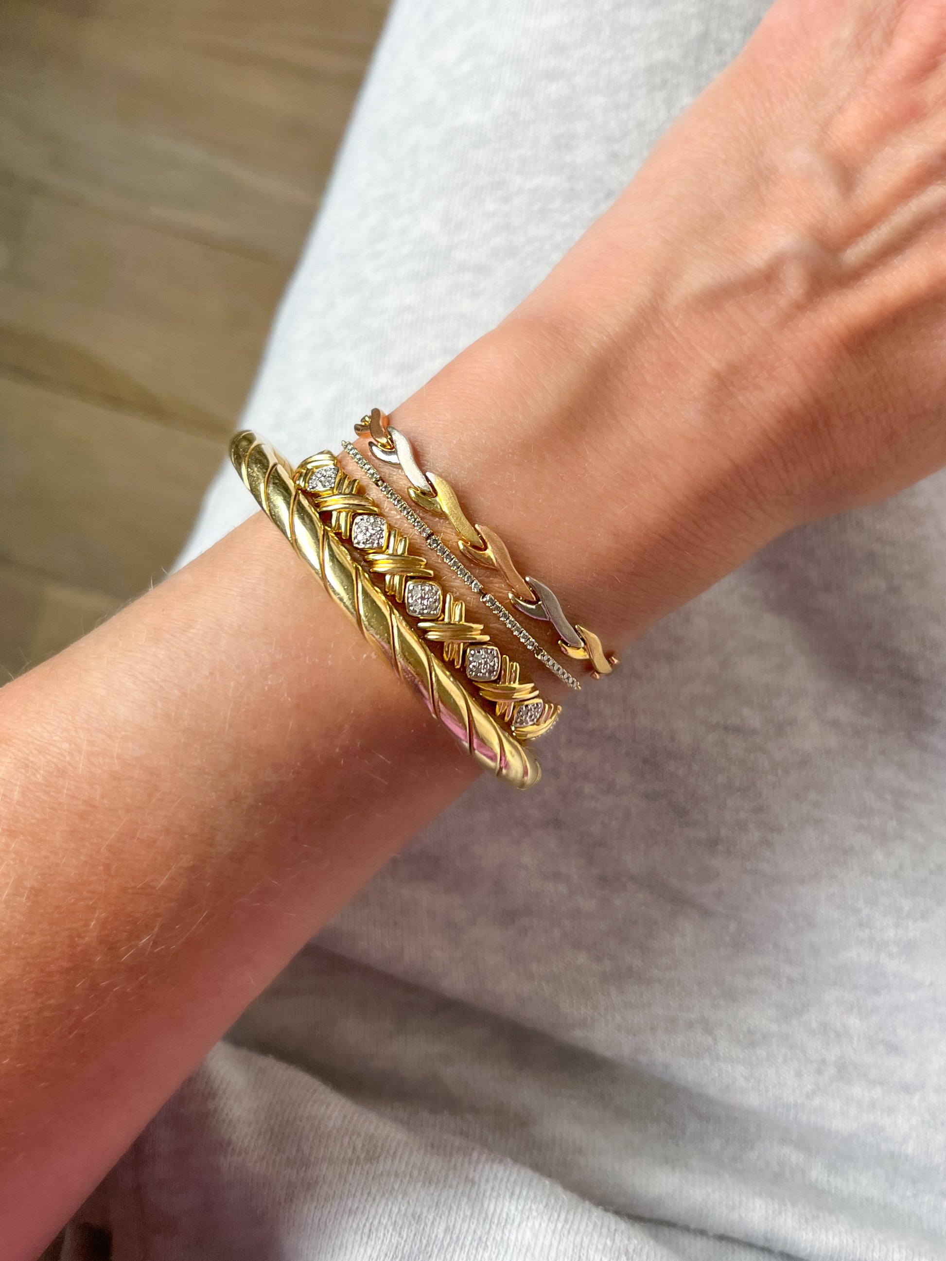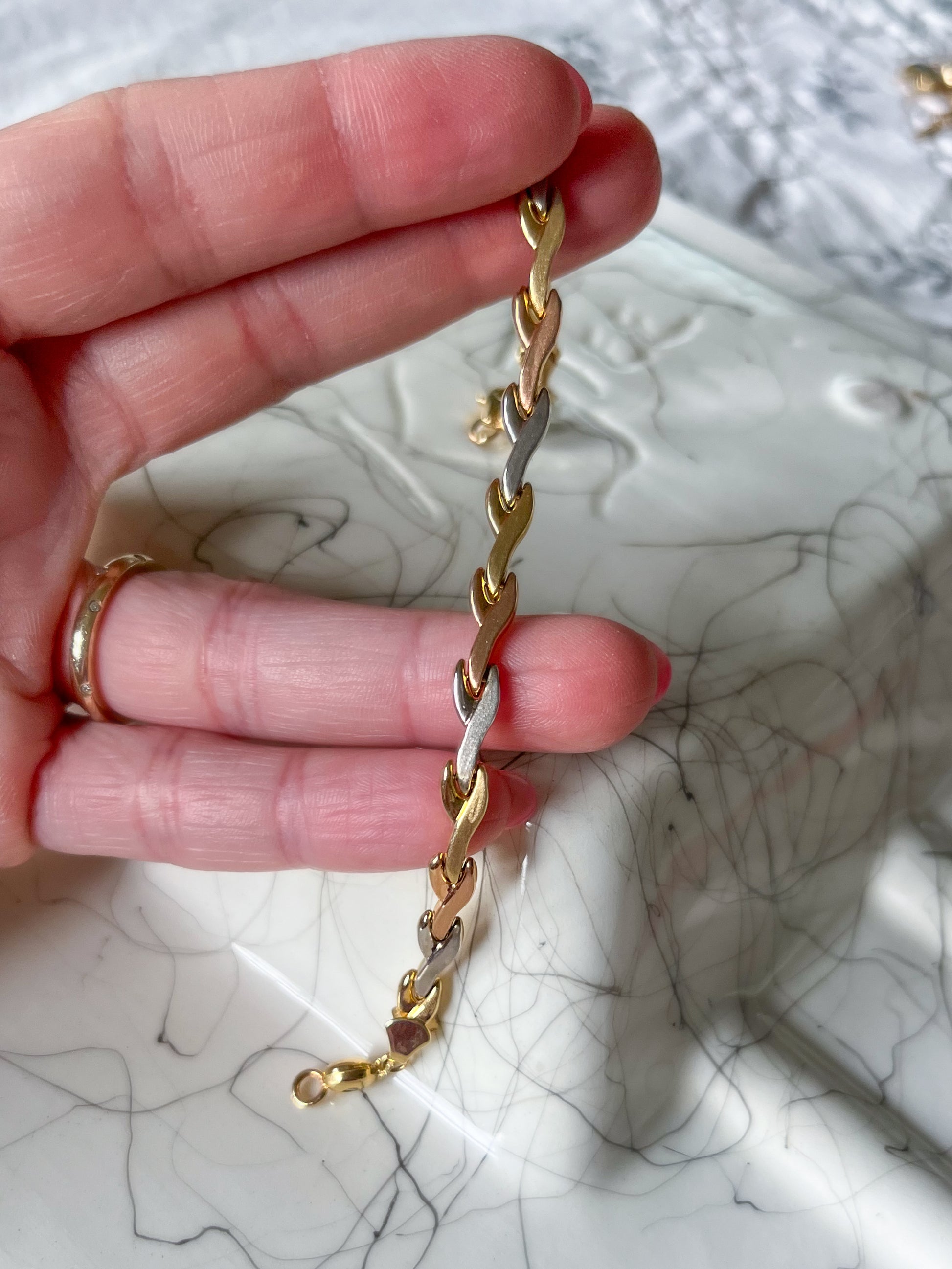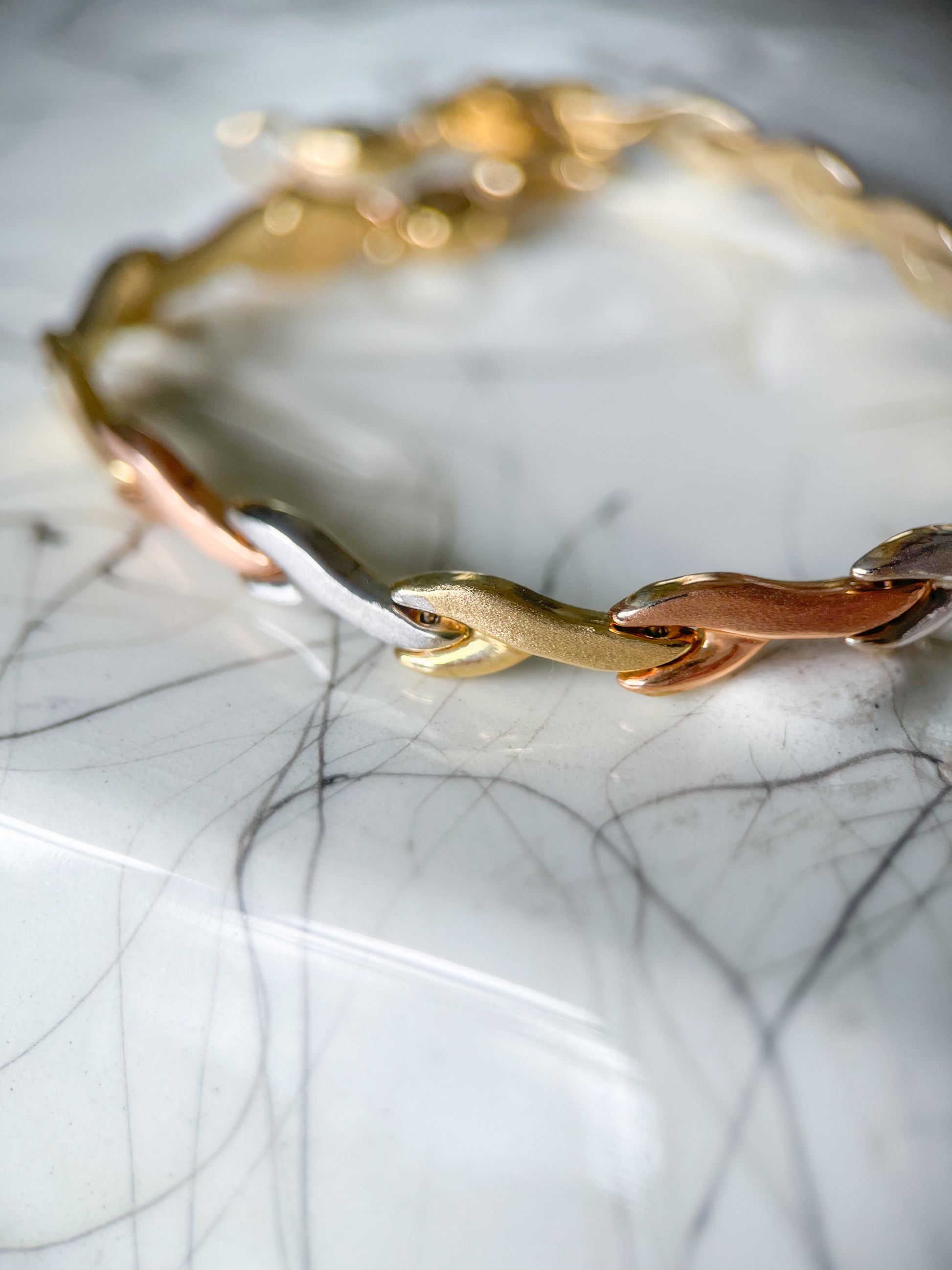Perfect for those who wear all gold colors! This 14k yellow, white and rose gold bracelet is 7 inches long and weighs over 4 grams.