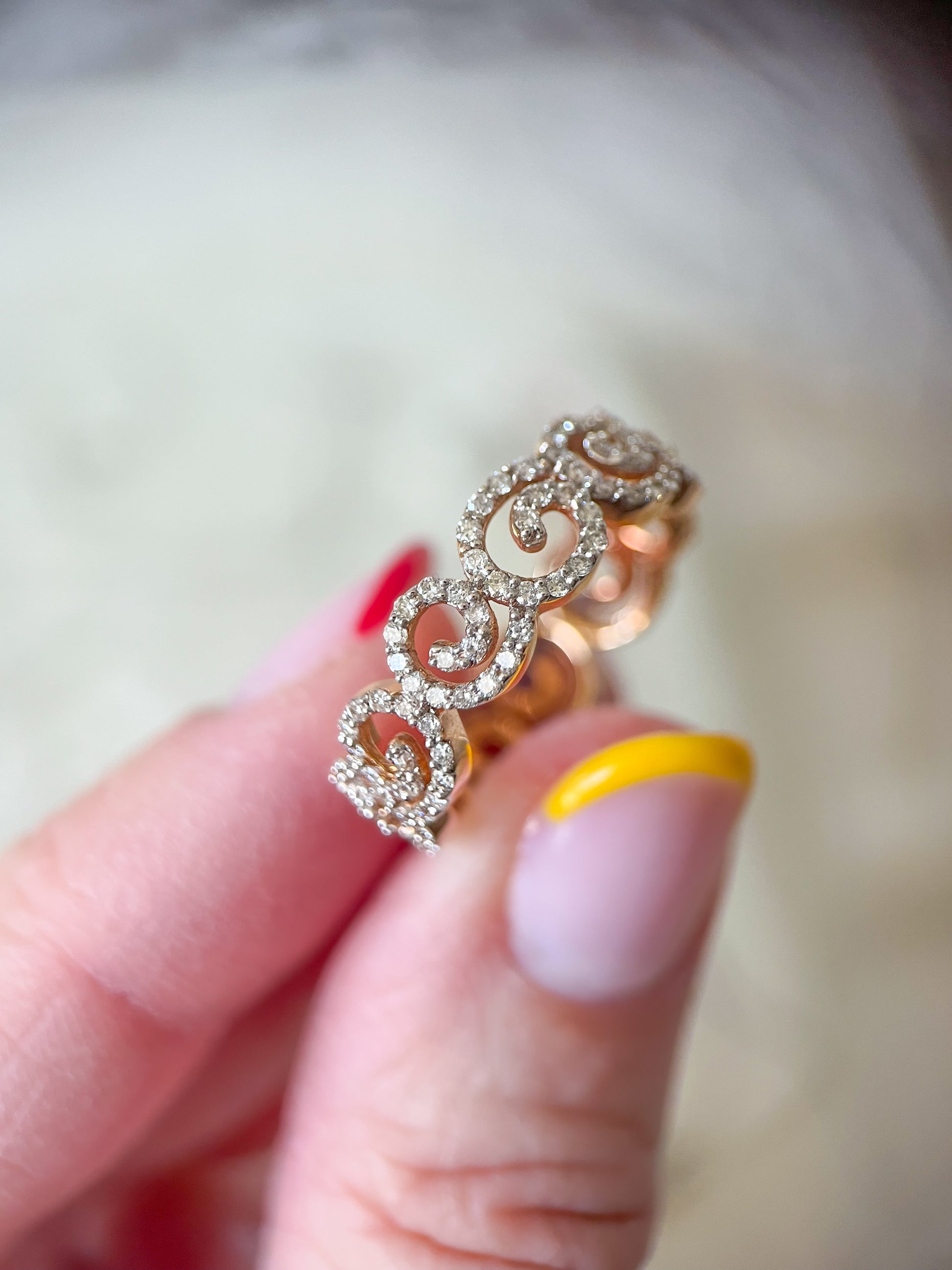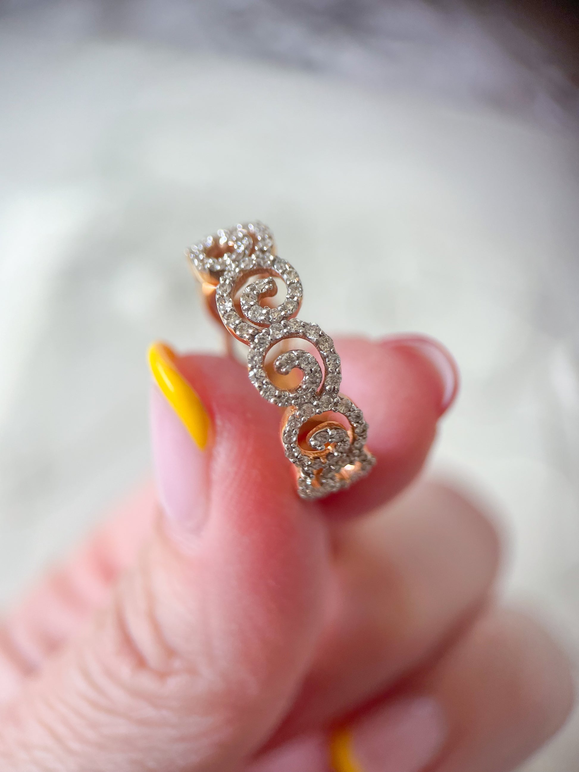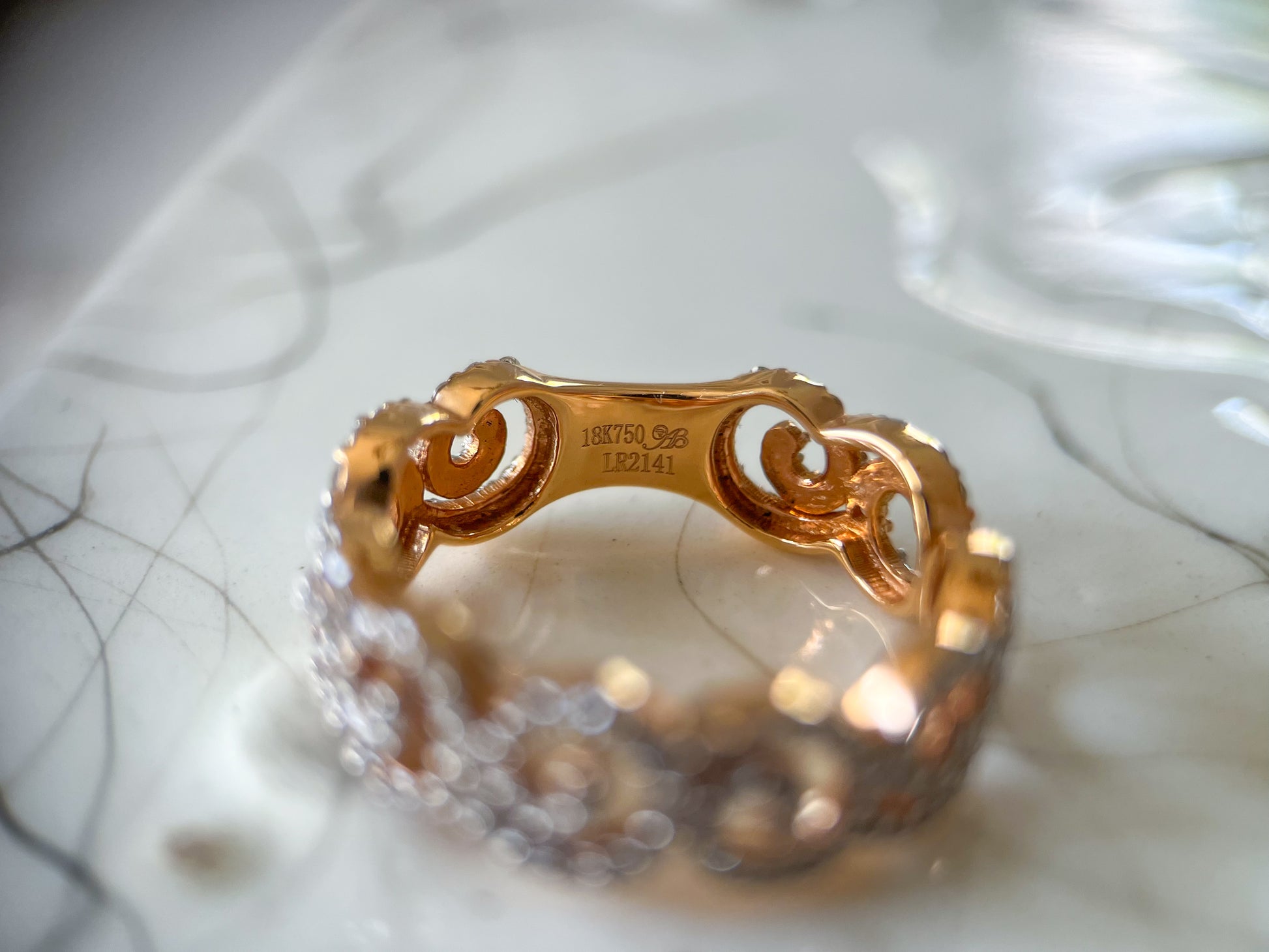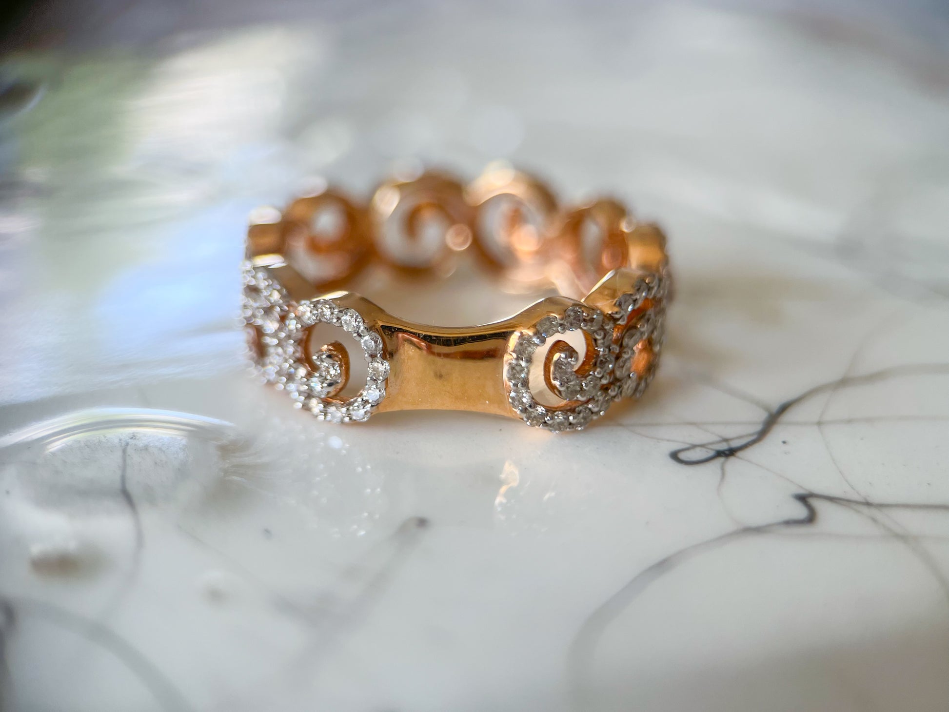 Stunning, 18k rose gold band featuring natural round diamonds. This band is able to be resized at your local jeweler. This ring is not vintage.