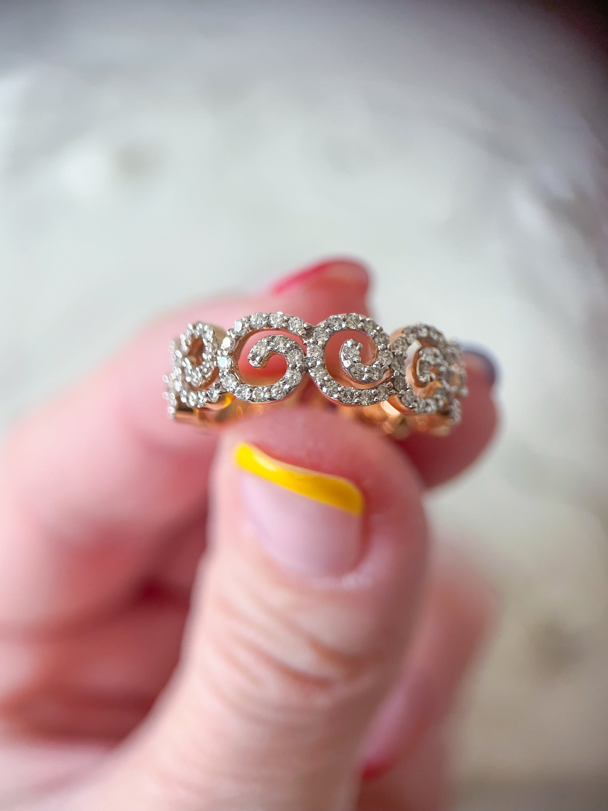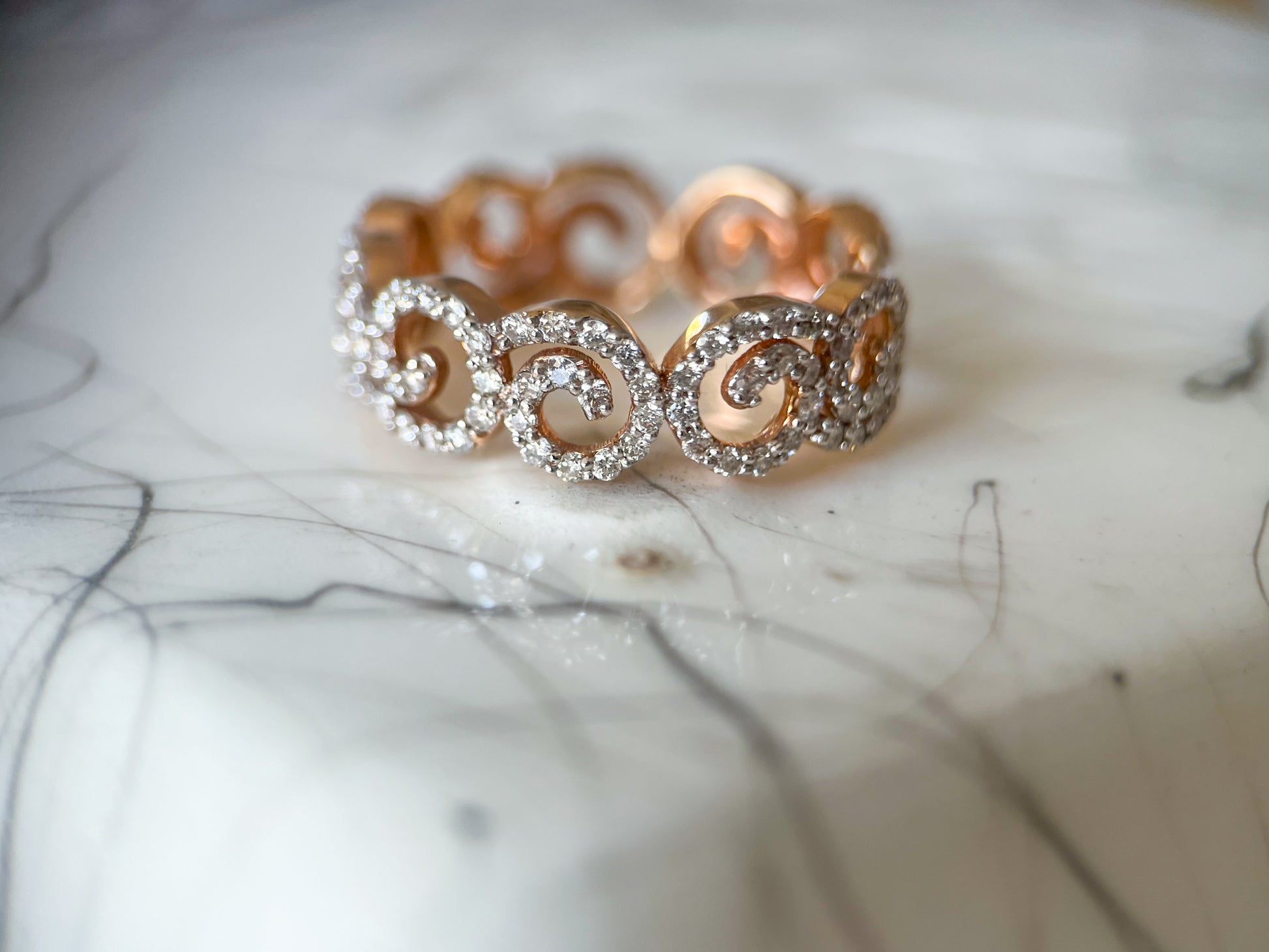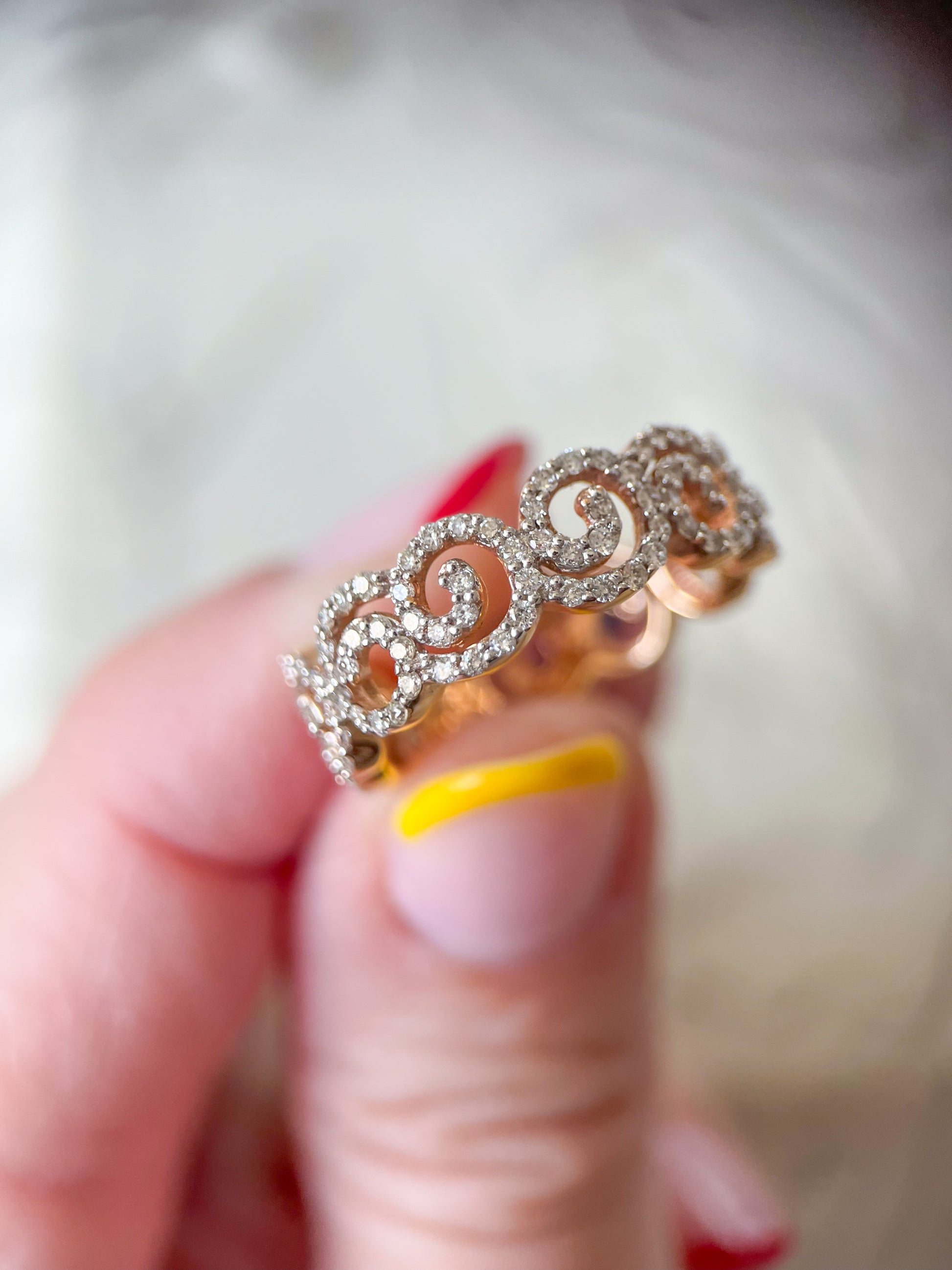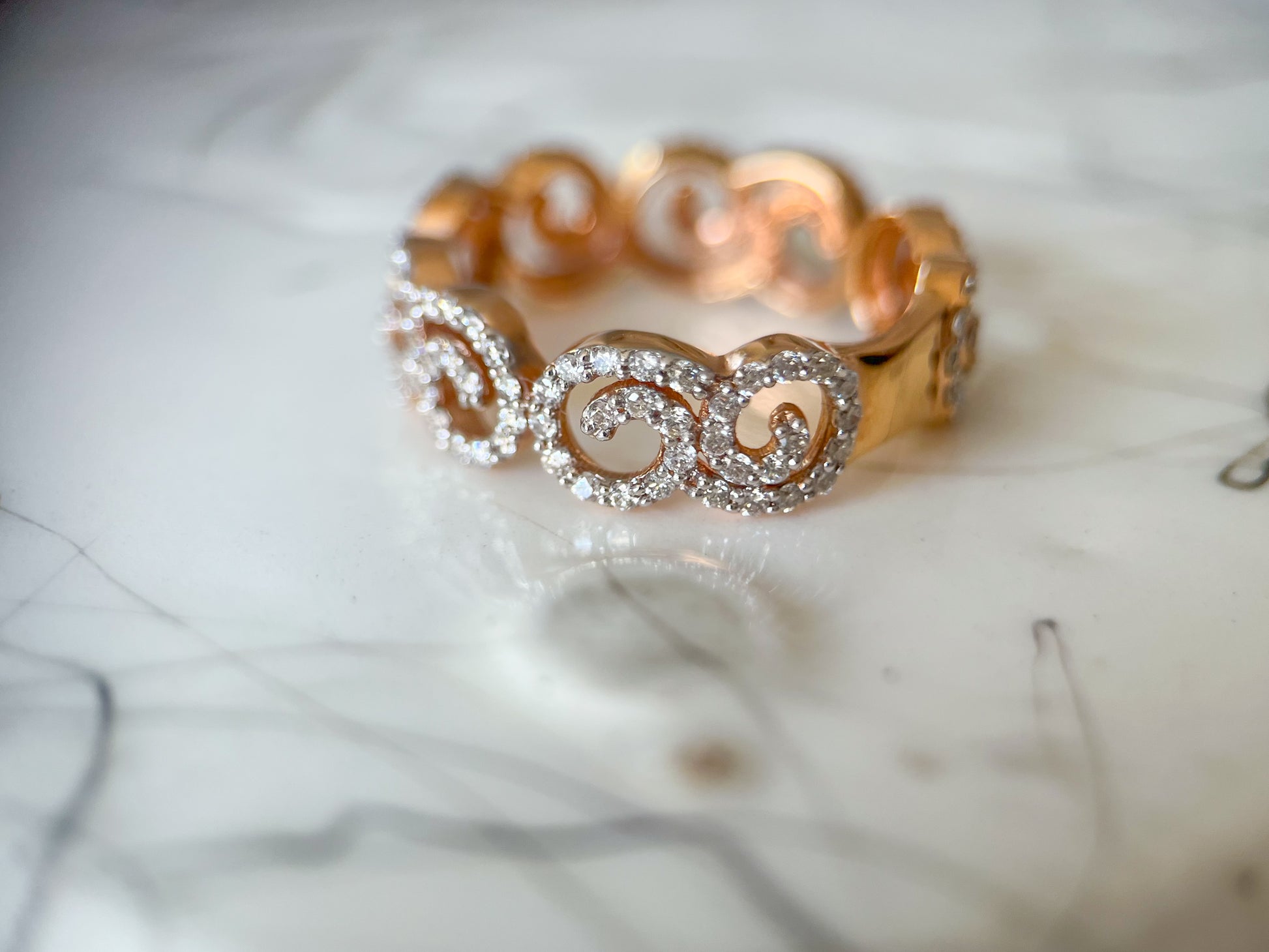 Stunning, 18k rose gold band featuring natural round diamonds. This band is able to be resized at your local jeweler. This ring is not vintage.