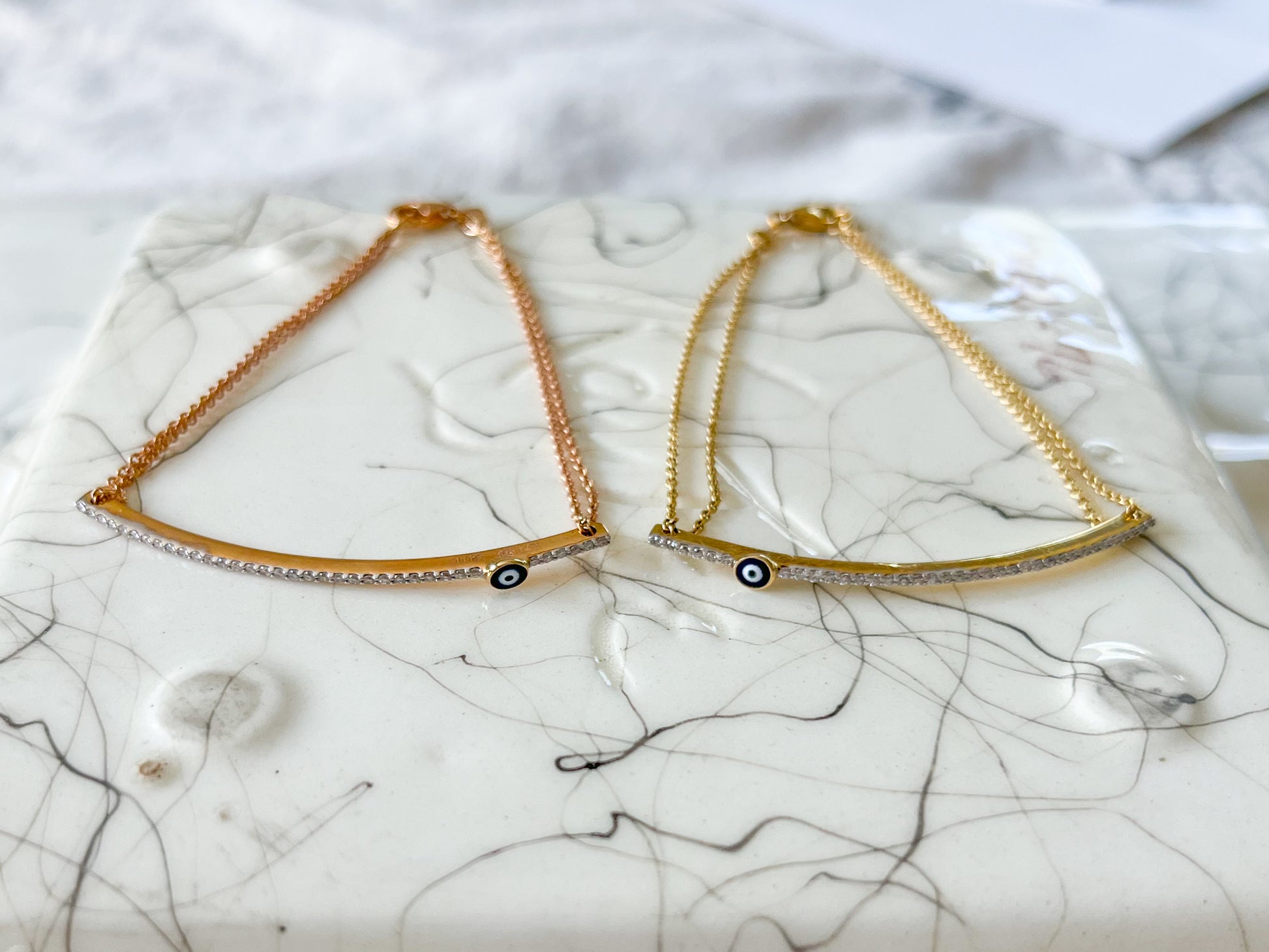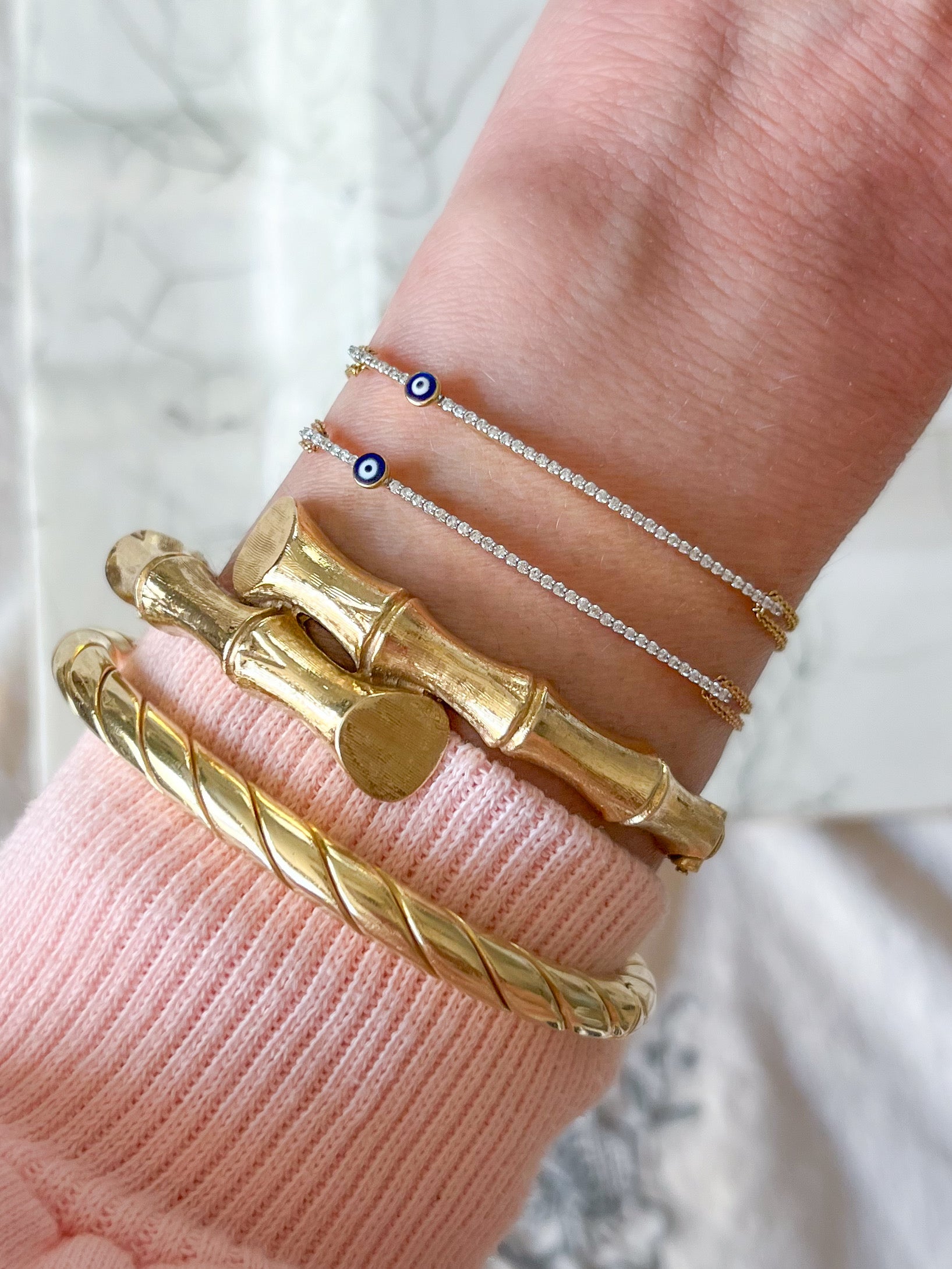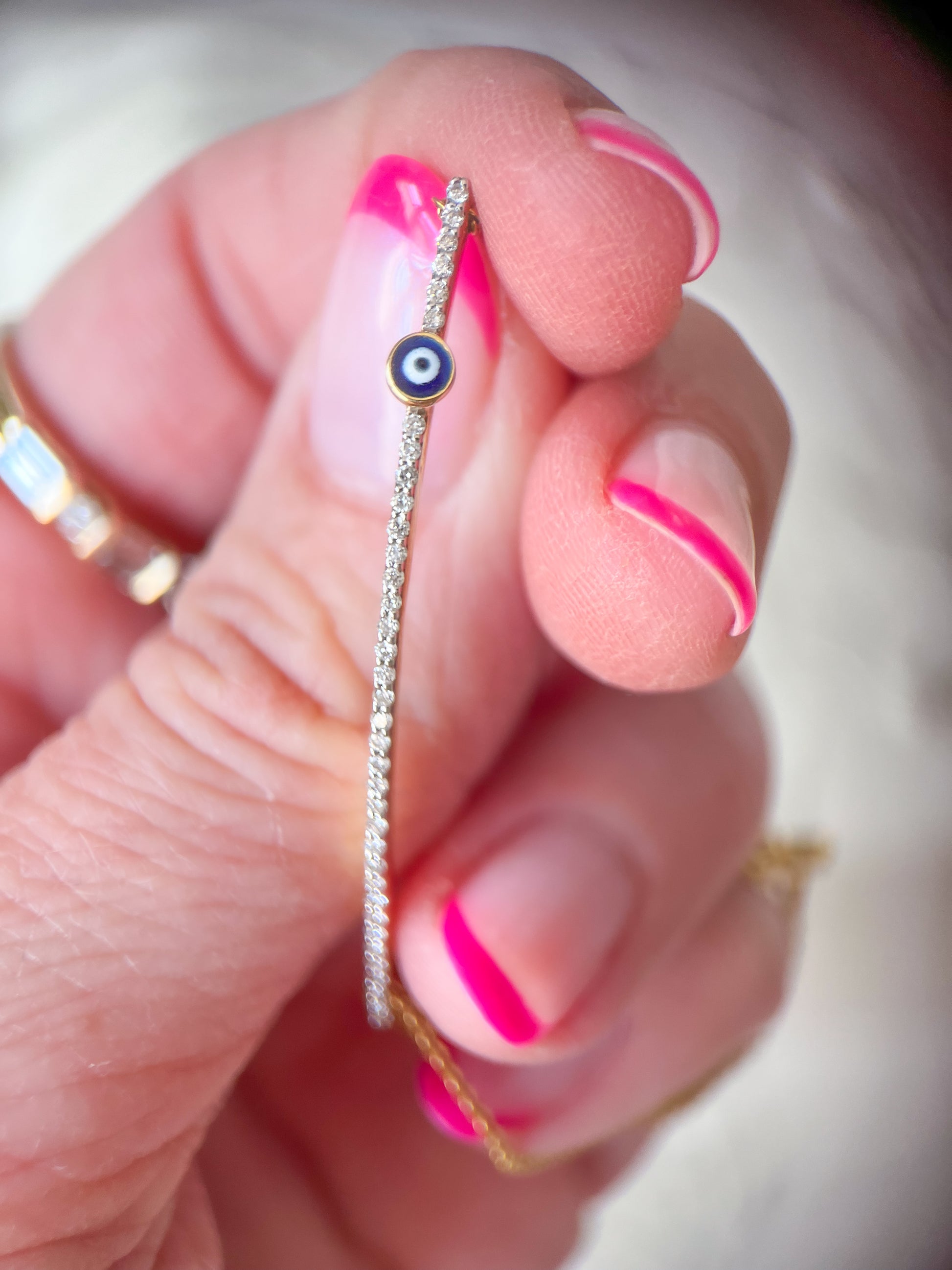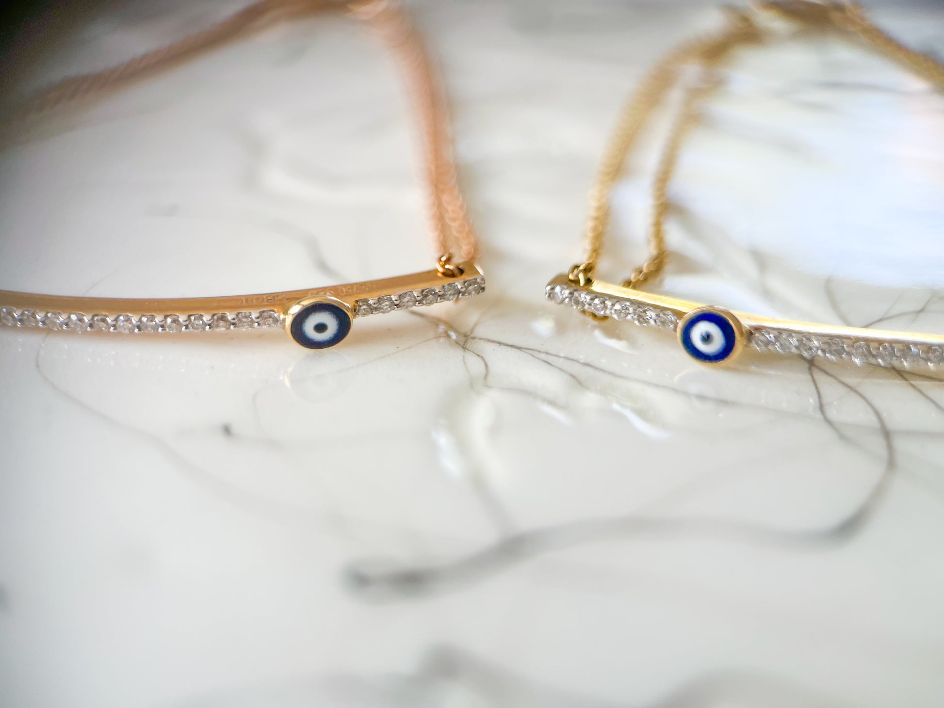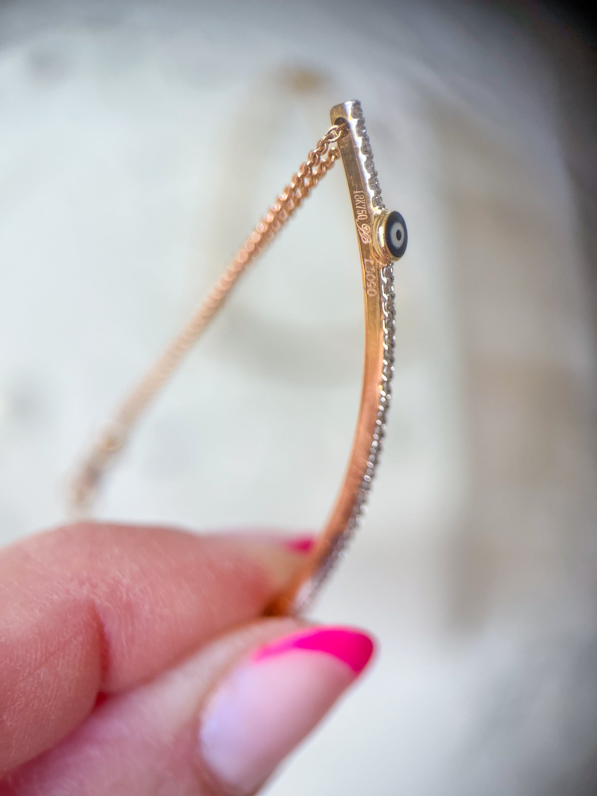 Super cool, 18k rose and yellow gold natural diamond and evil eye bracelets. These bracelets are not vintage.