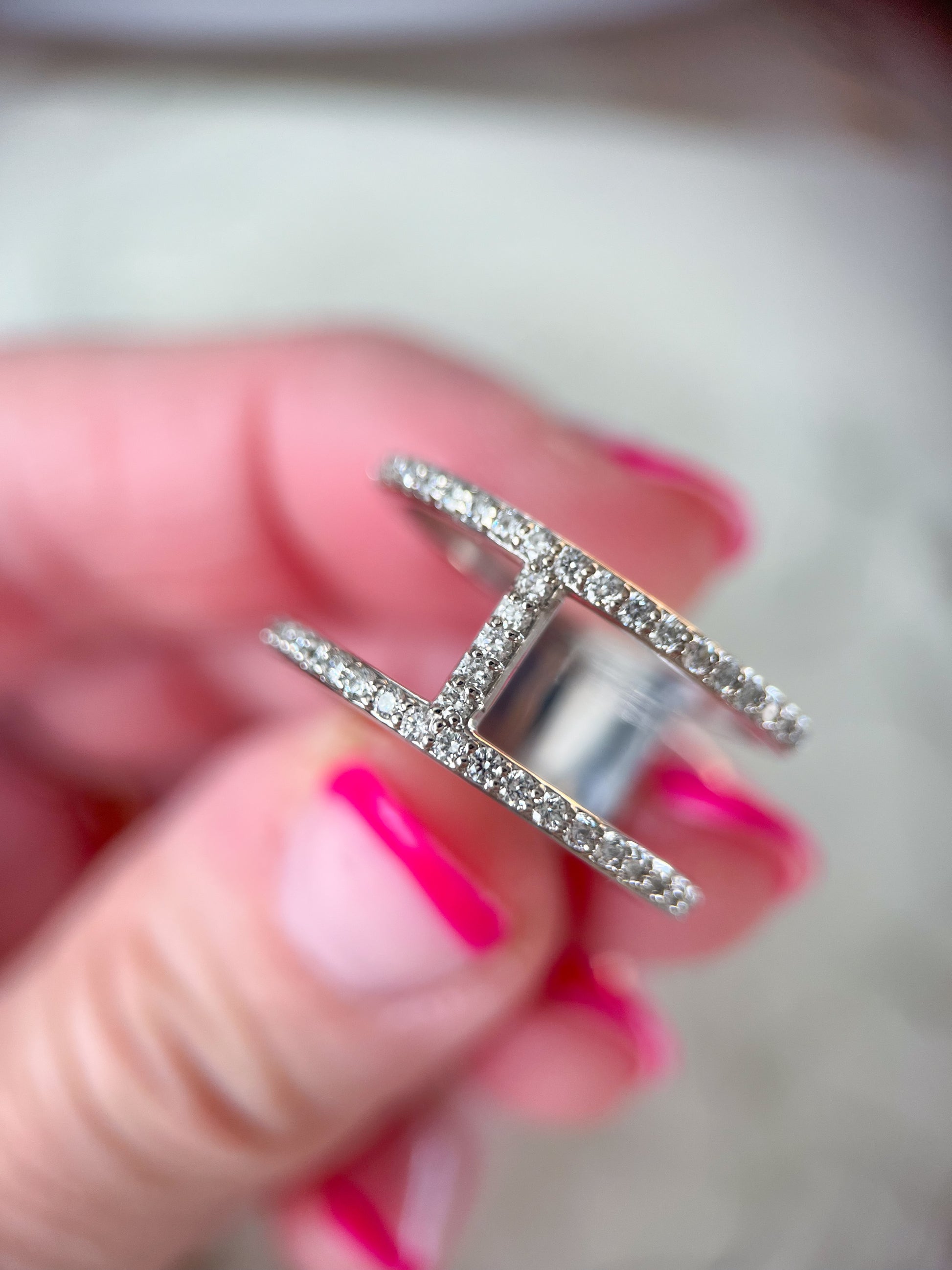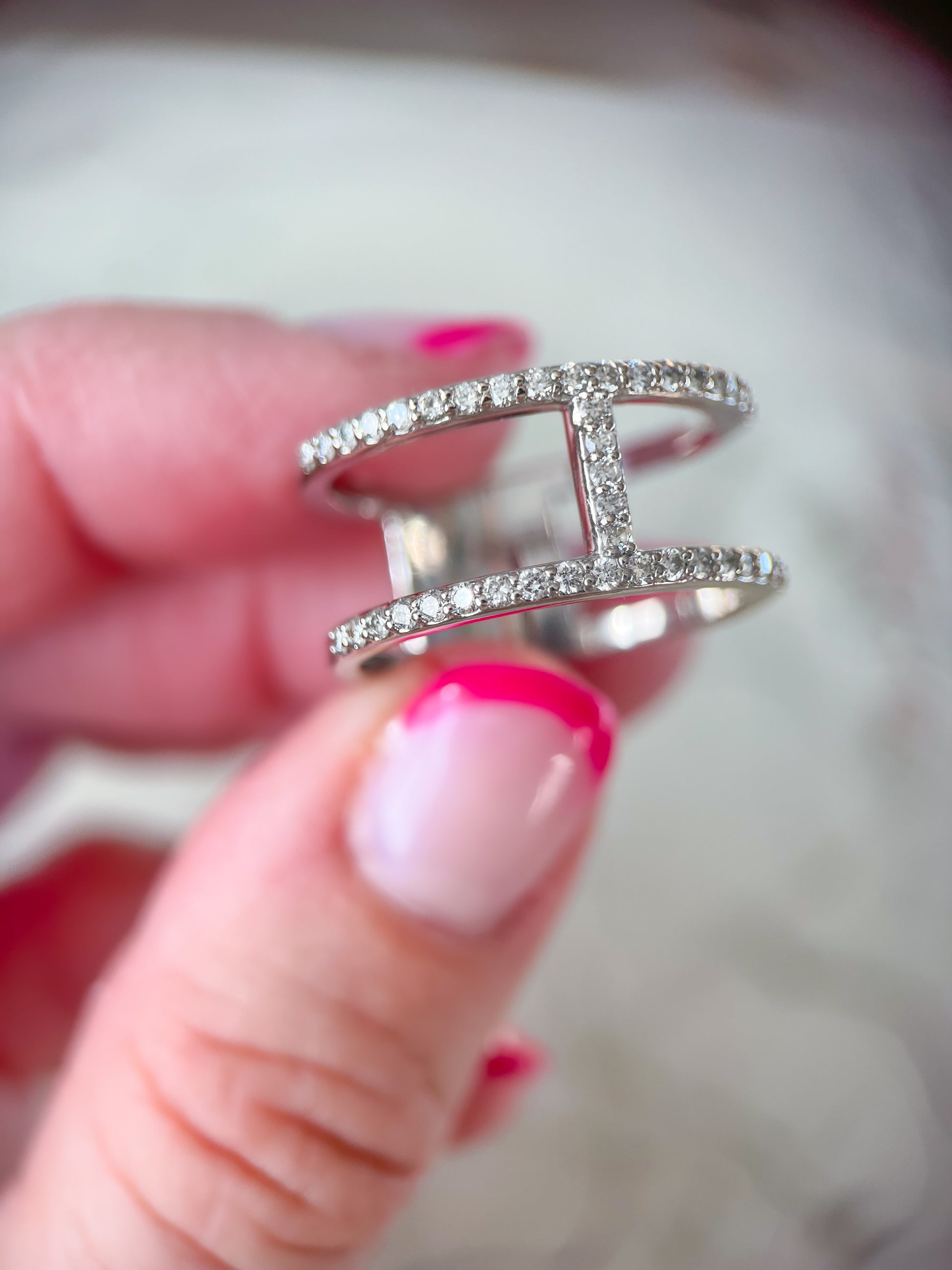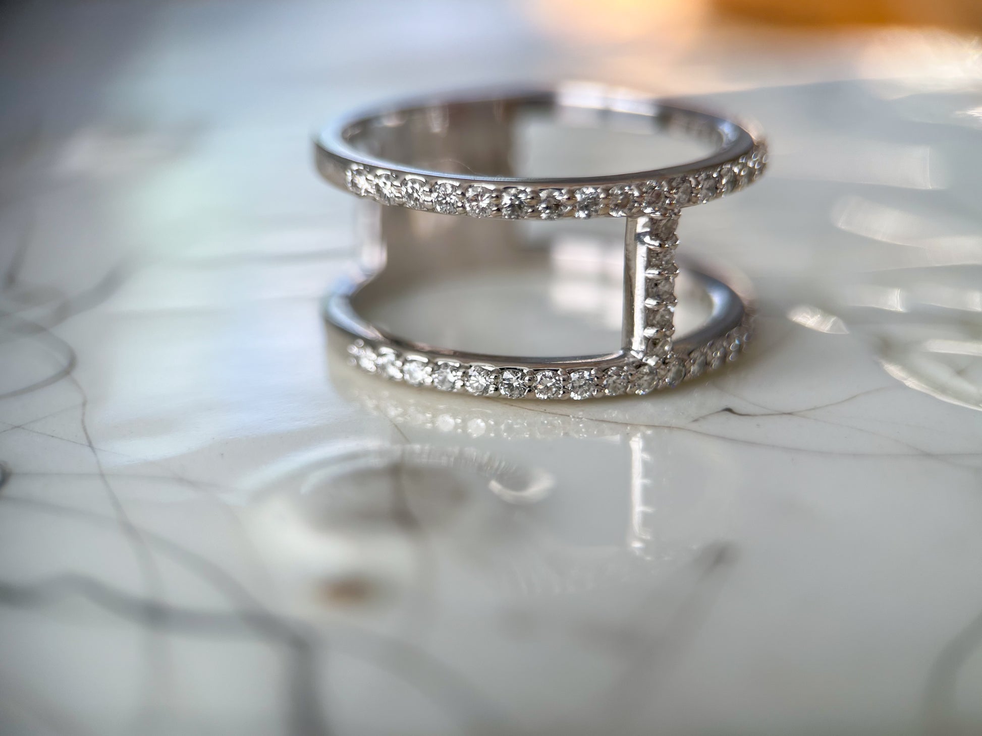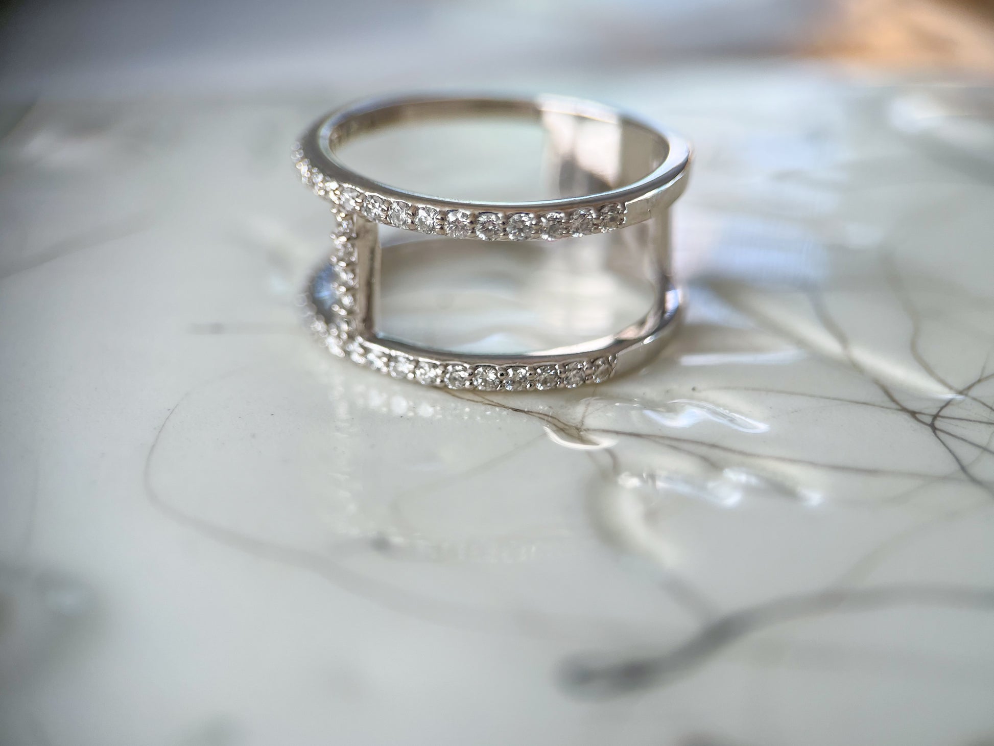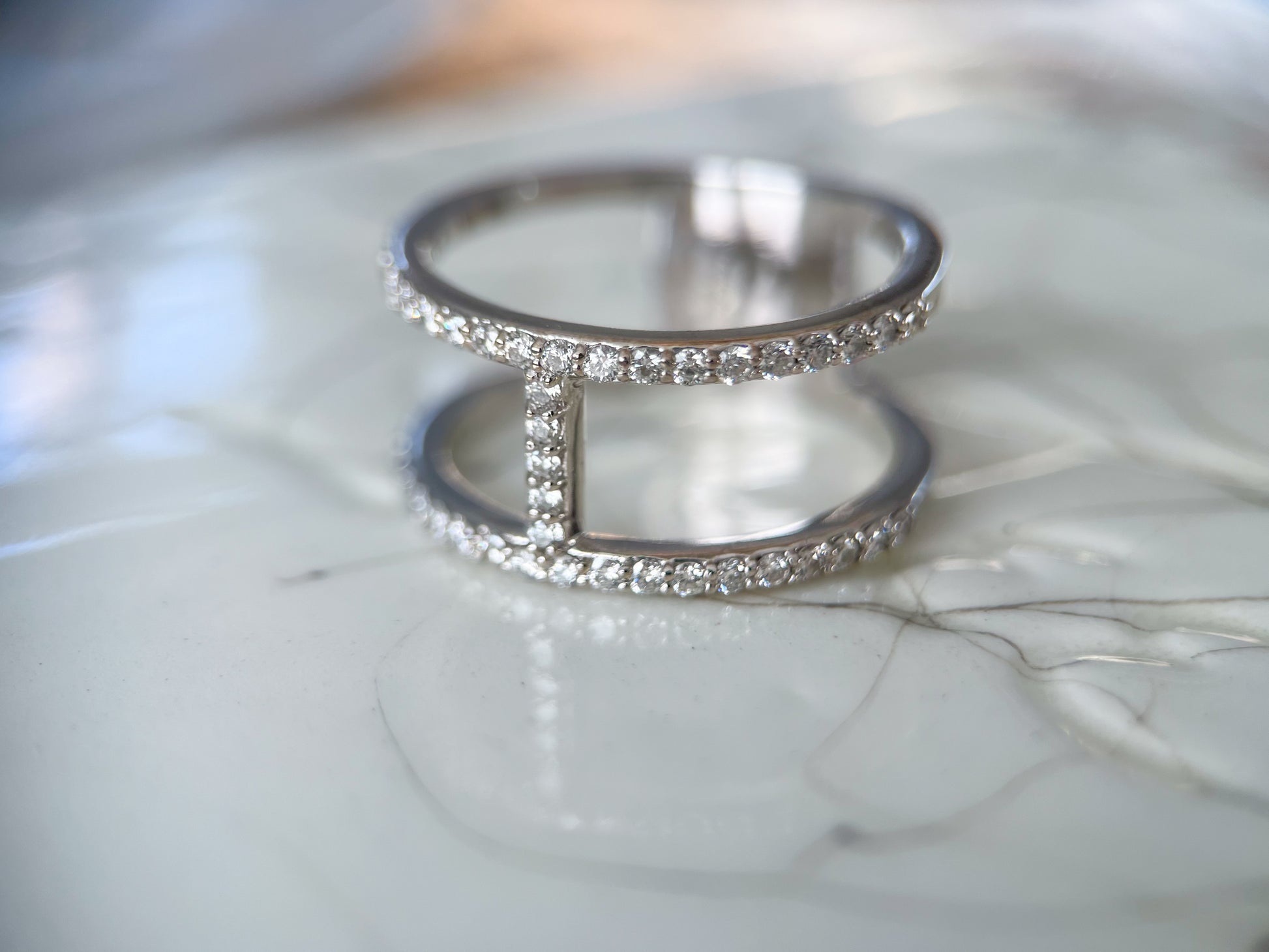 Beautiful, simple, yet stunning, 14k white gold and natural diamond double band ring. This ring is not vintage.