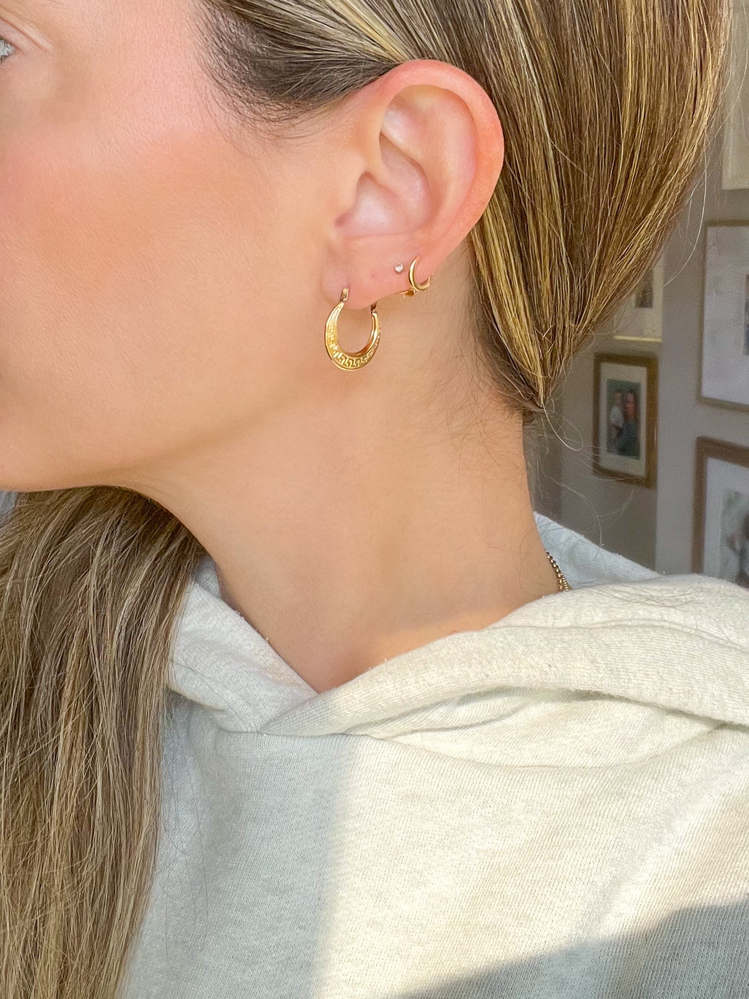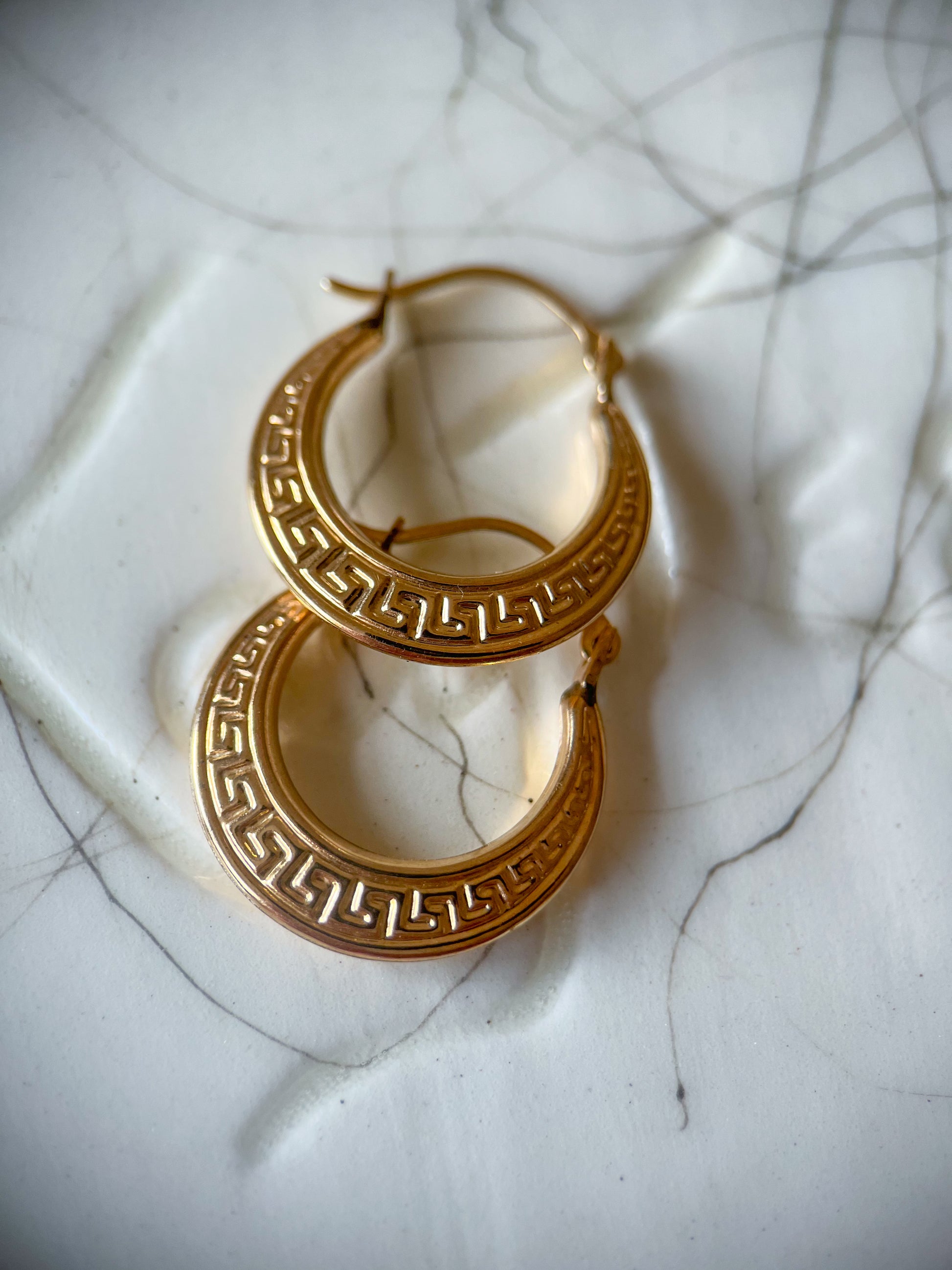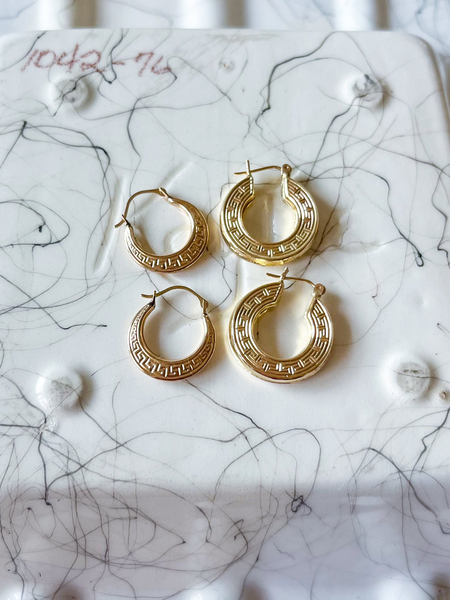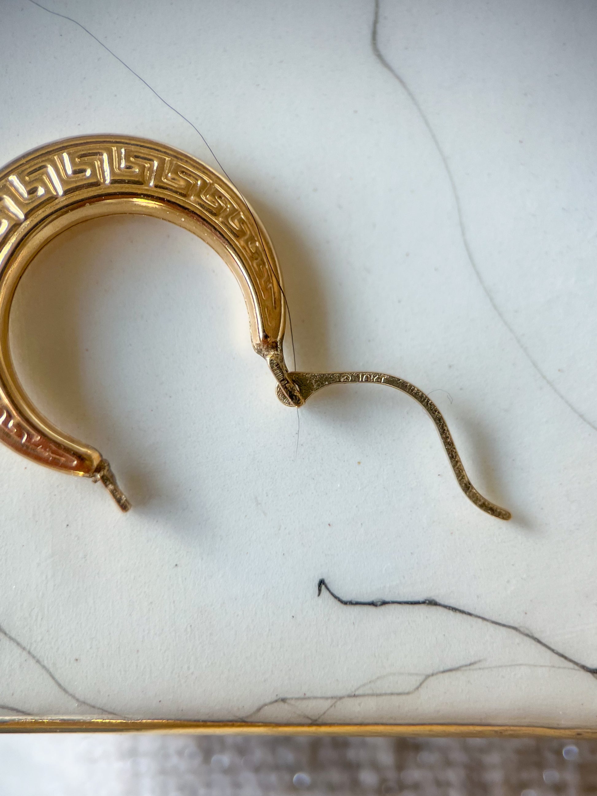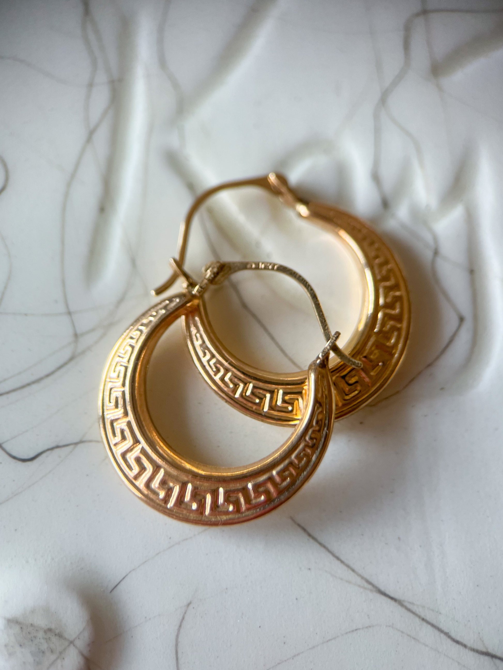 An awesome pair of 10k yellow gold greek style hoops. Thin and perfect for every day! These hoops are not vintage.