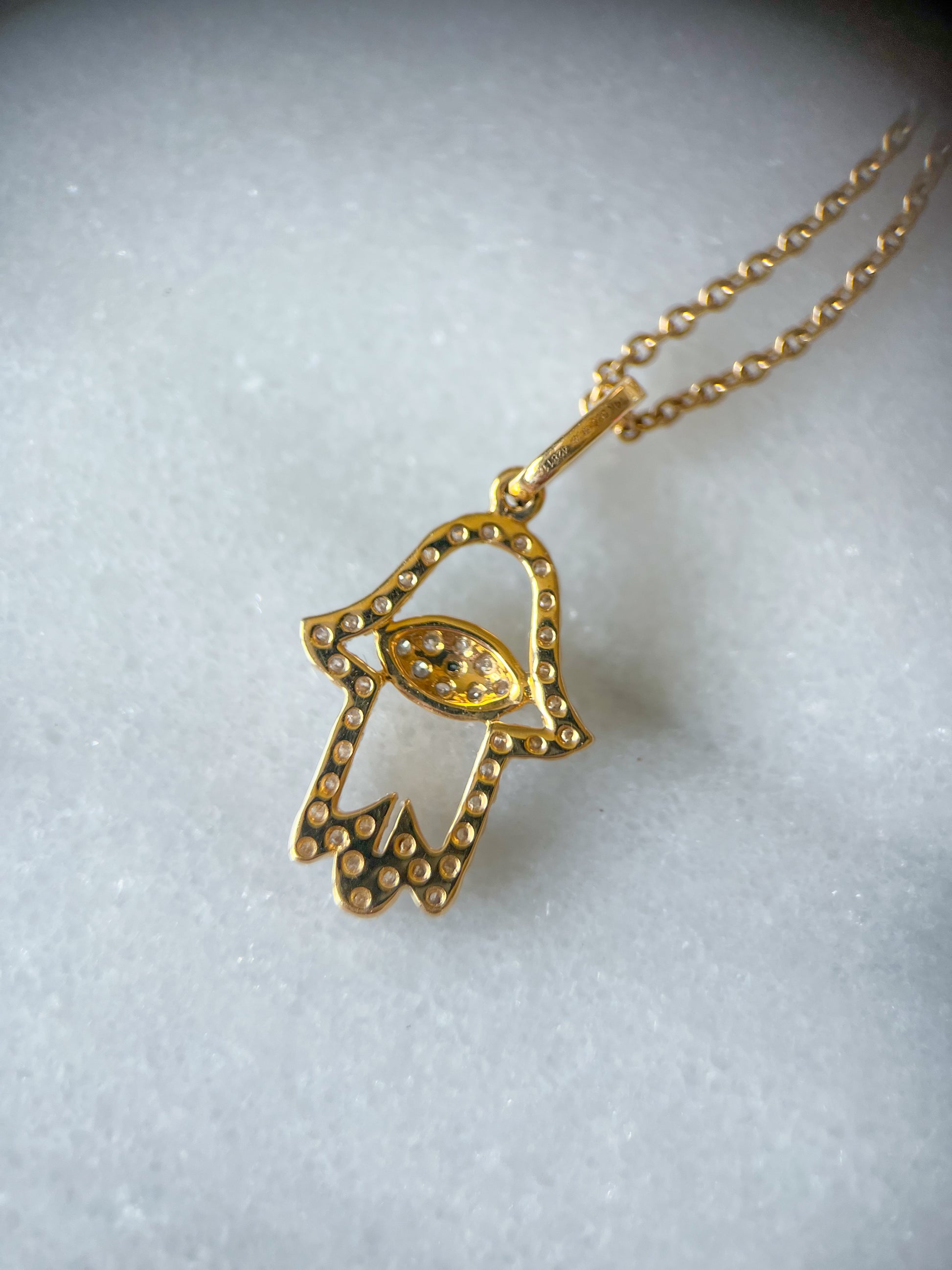 Stunning 14k yellow gold, natural diamonds and natural sapphire Hamsa charm. This piece is not vintage. Chain not included.