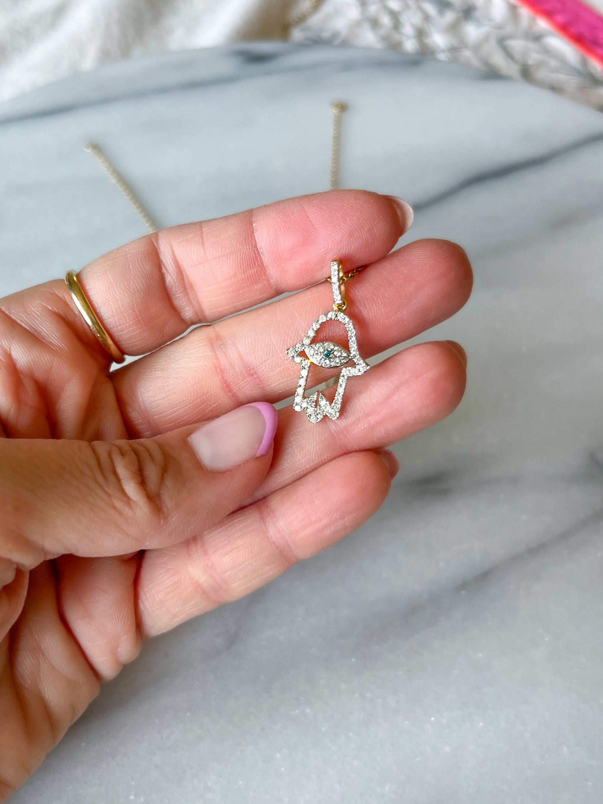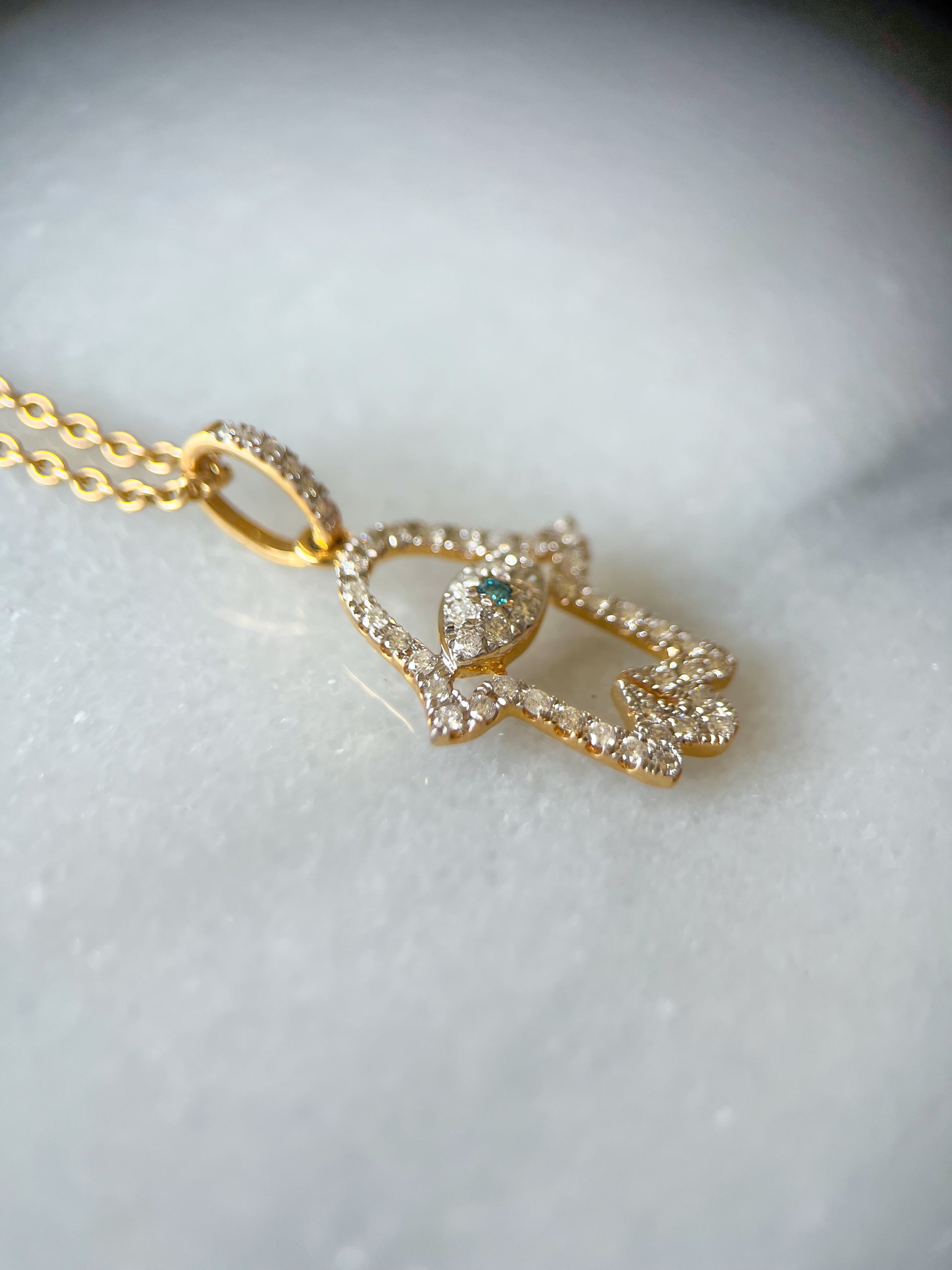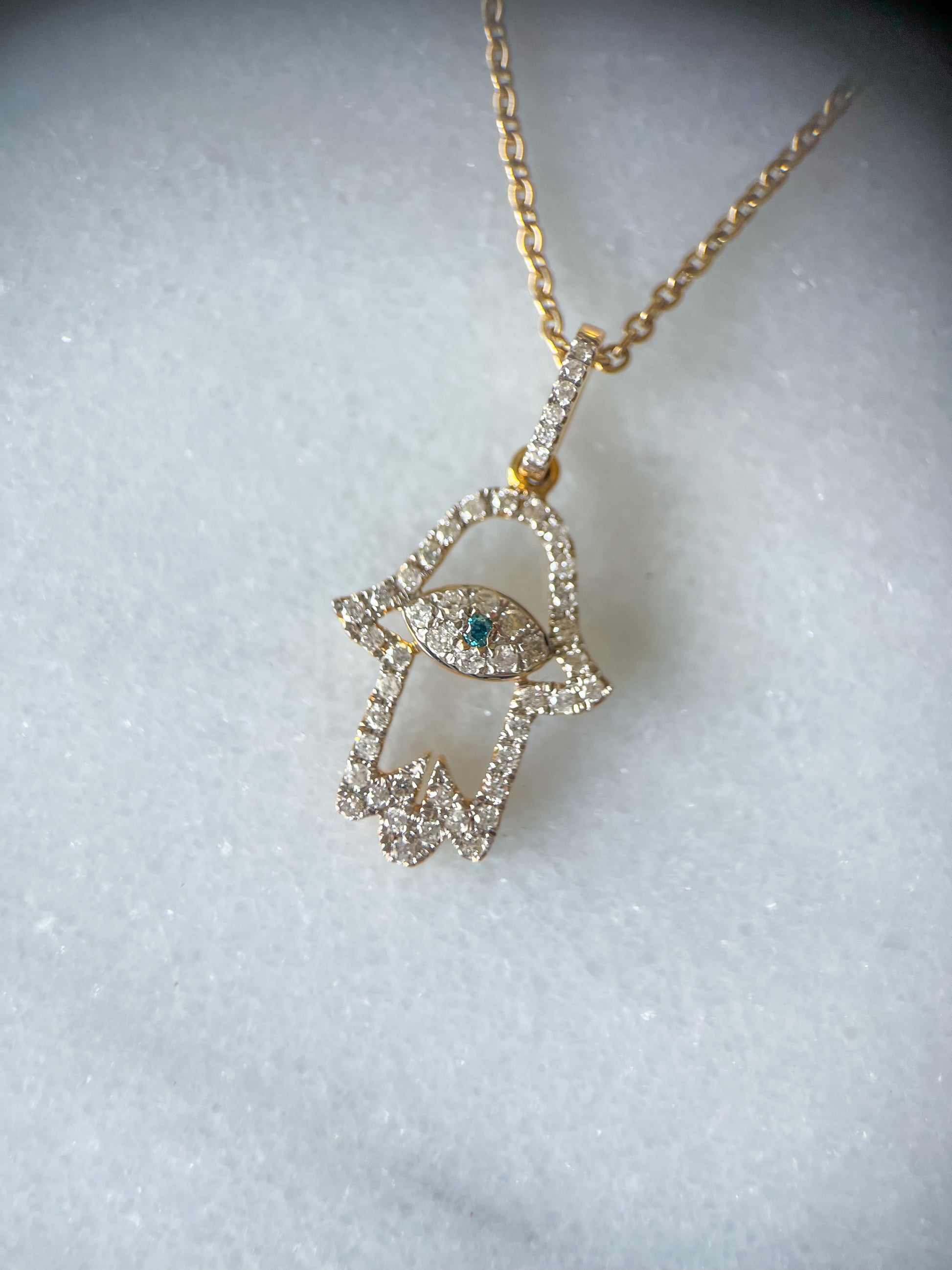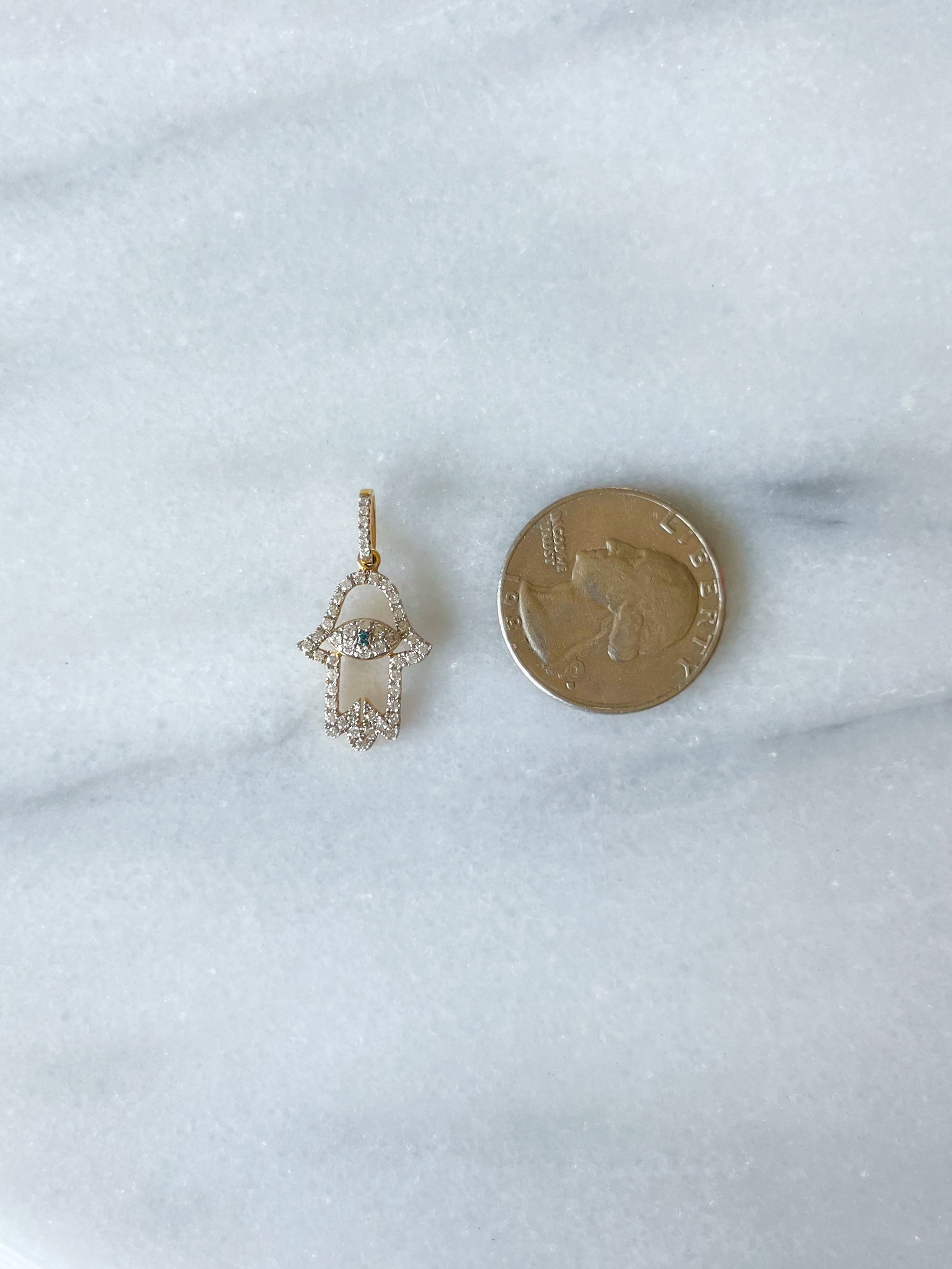Hamsa Charm with Natural Diamonds and Natural Sapphire 14k Yellow Gold