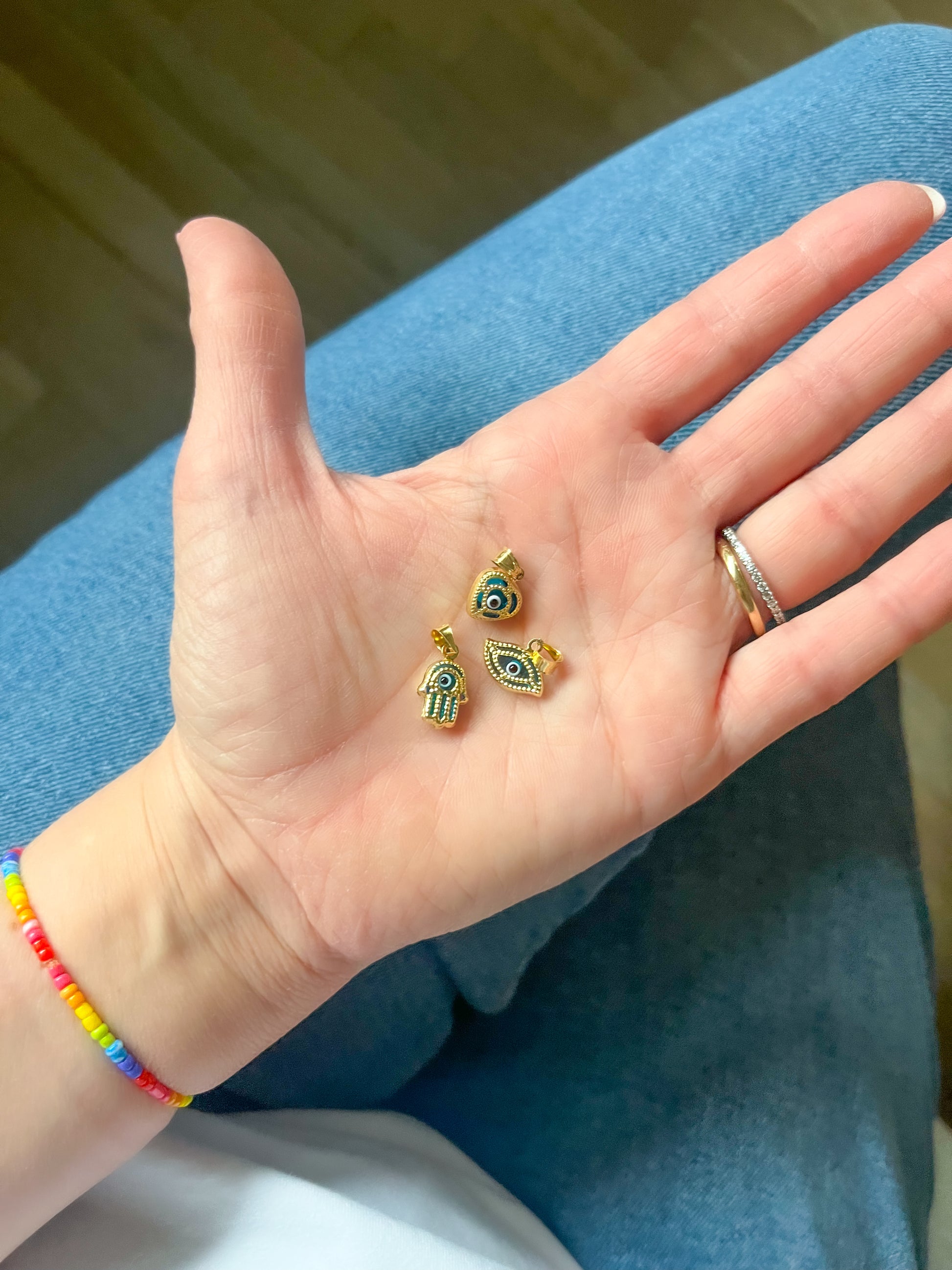 Super cool, 14k yellow gold, double sided, evil eye charms in various shapes - an eye, a hamsa and a heart. These charms are open on both sides and really catch the light so beautifully. Everyone needs a good luck charm, and these are just perf. Chain is not included. These charms are not vintage.