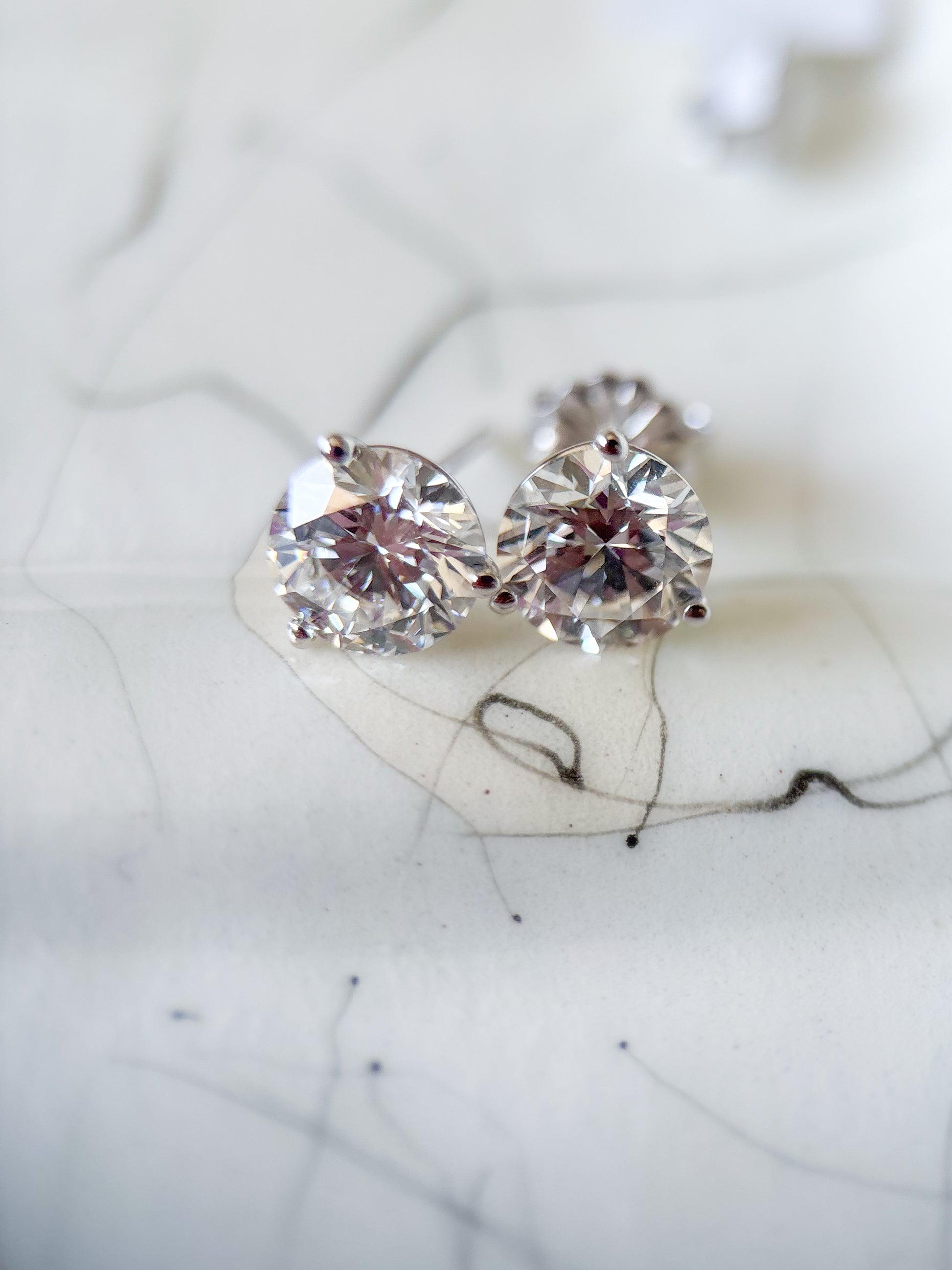 LAB GROWN DIAMOND round stud earrings set in 14k white gold. Setting is a 3 prong martini setting.