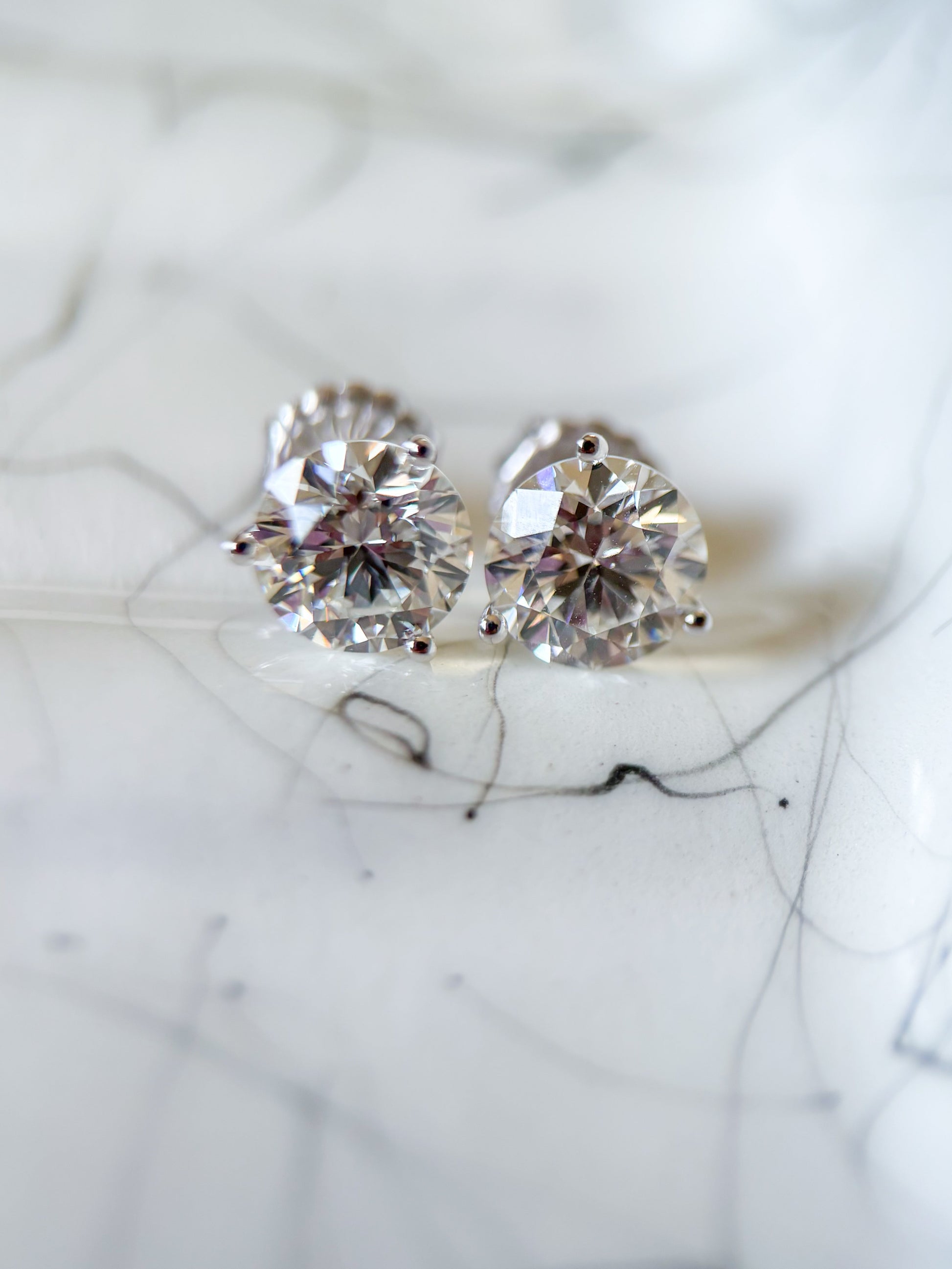 LAB GROWN DIAMOND round stud earrings set in 14k white gold. Setting is a 3 prong martini setting.