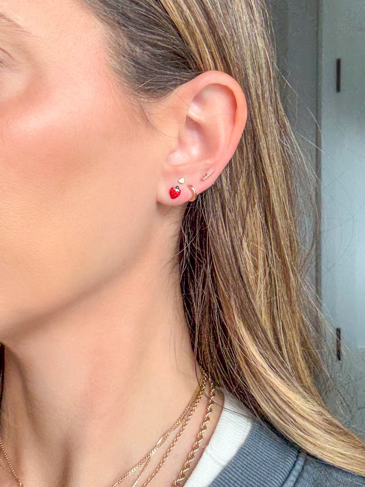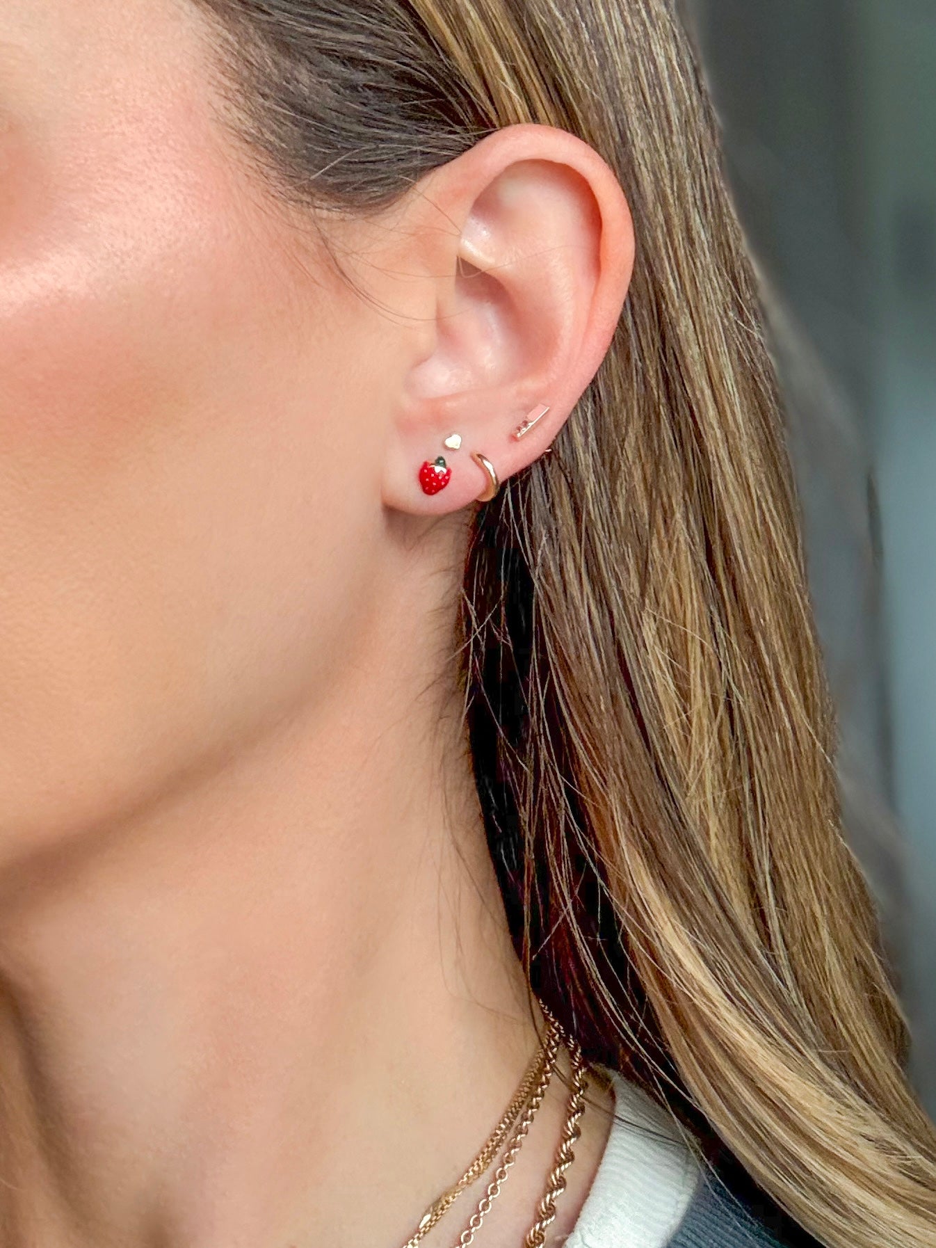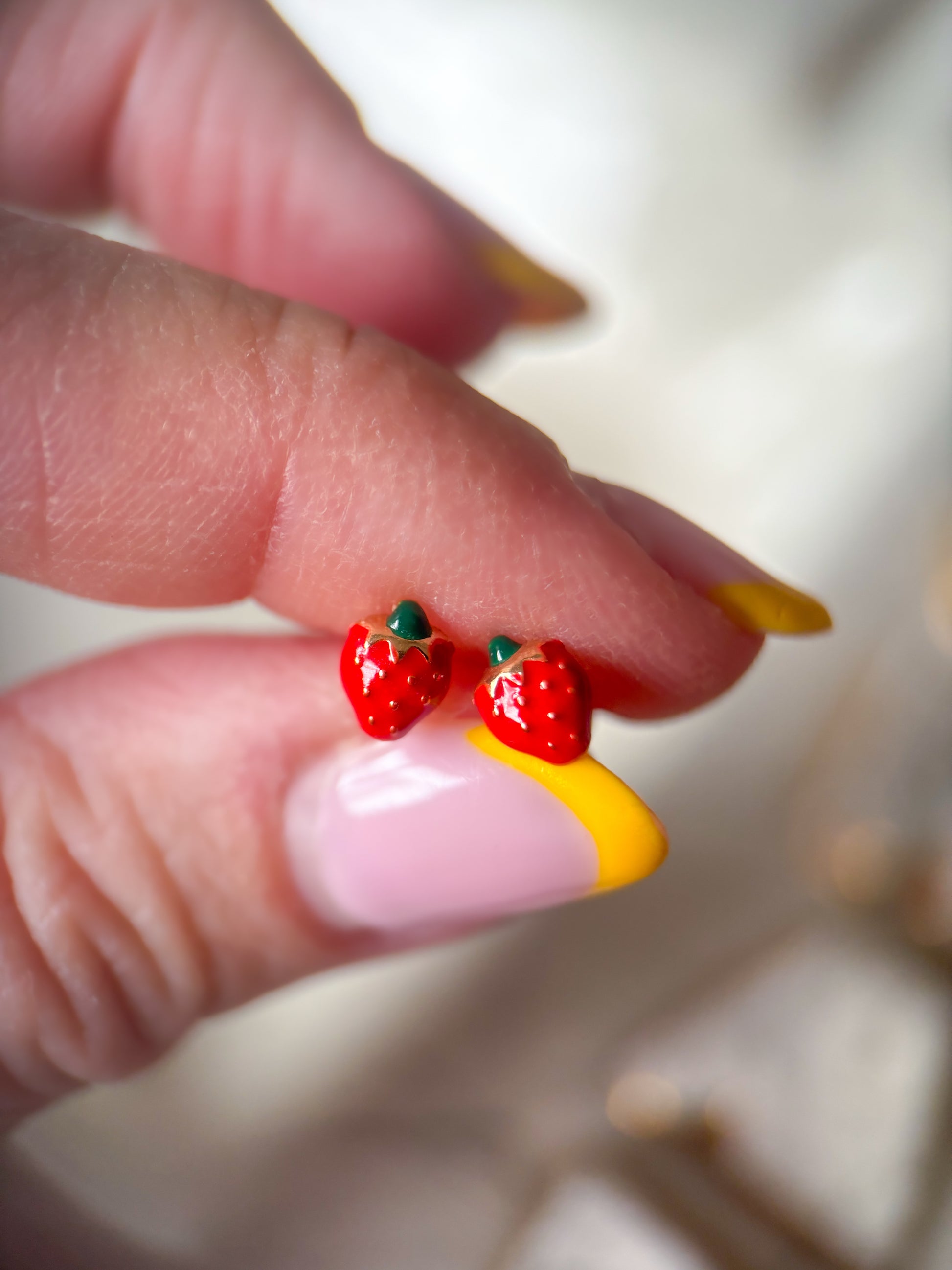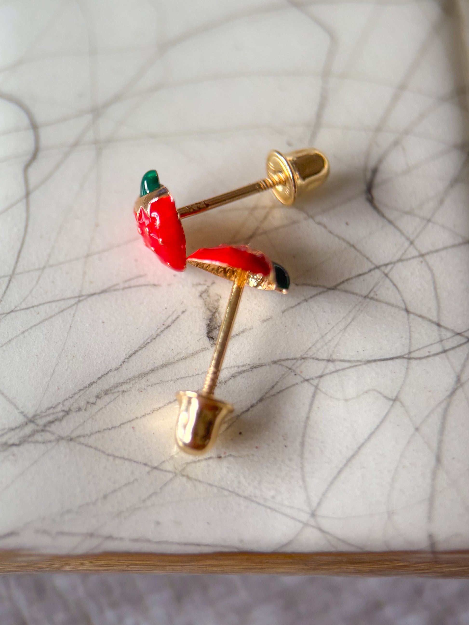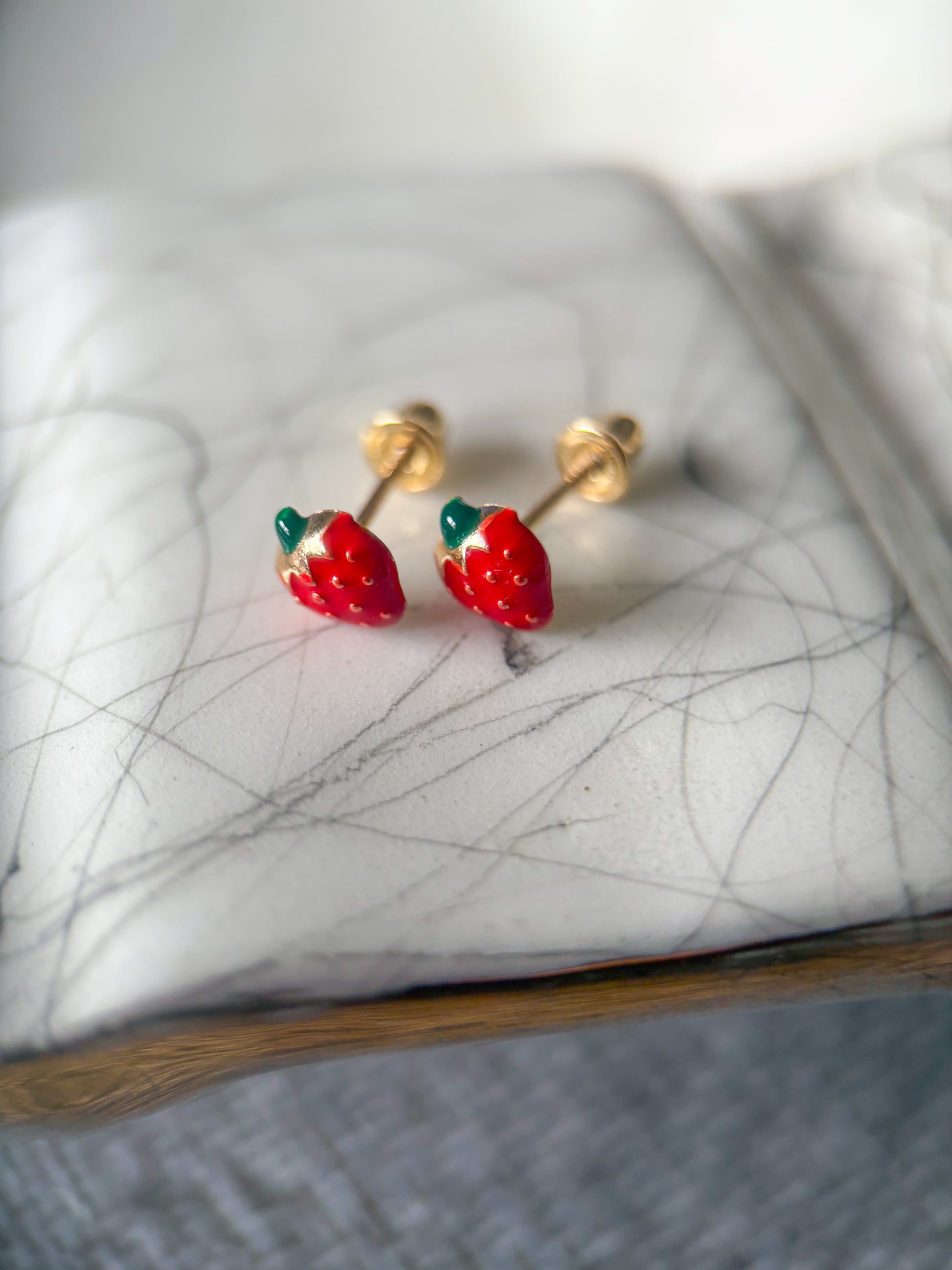 Mini 14k yellow gold and enamel strawberries! How cute are these?! These earrings are dainty and small and are perfect for a young child or additional hole.