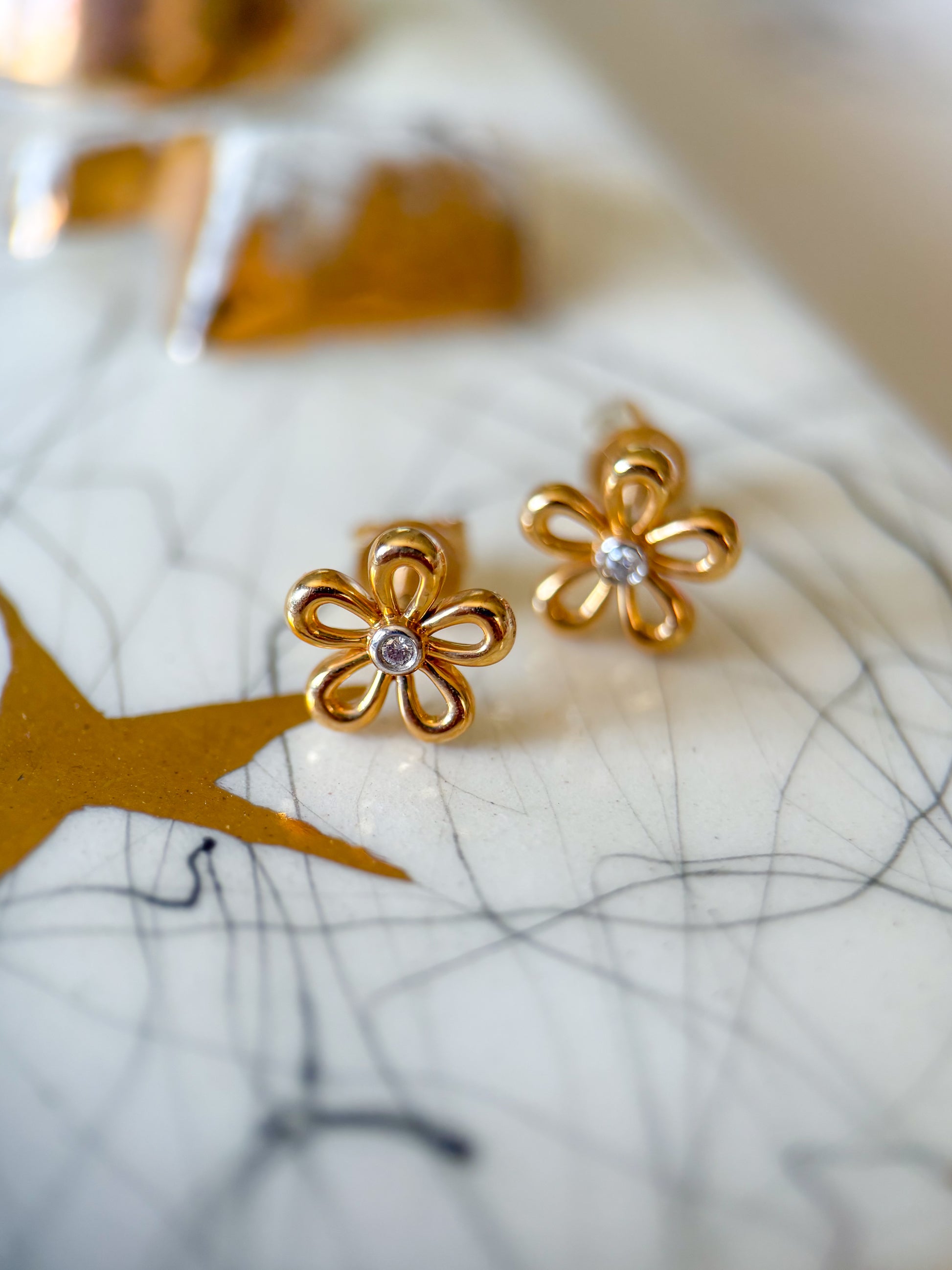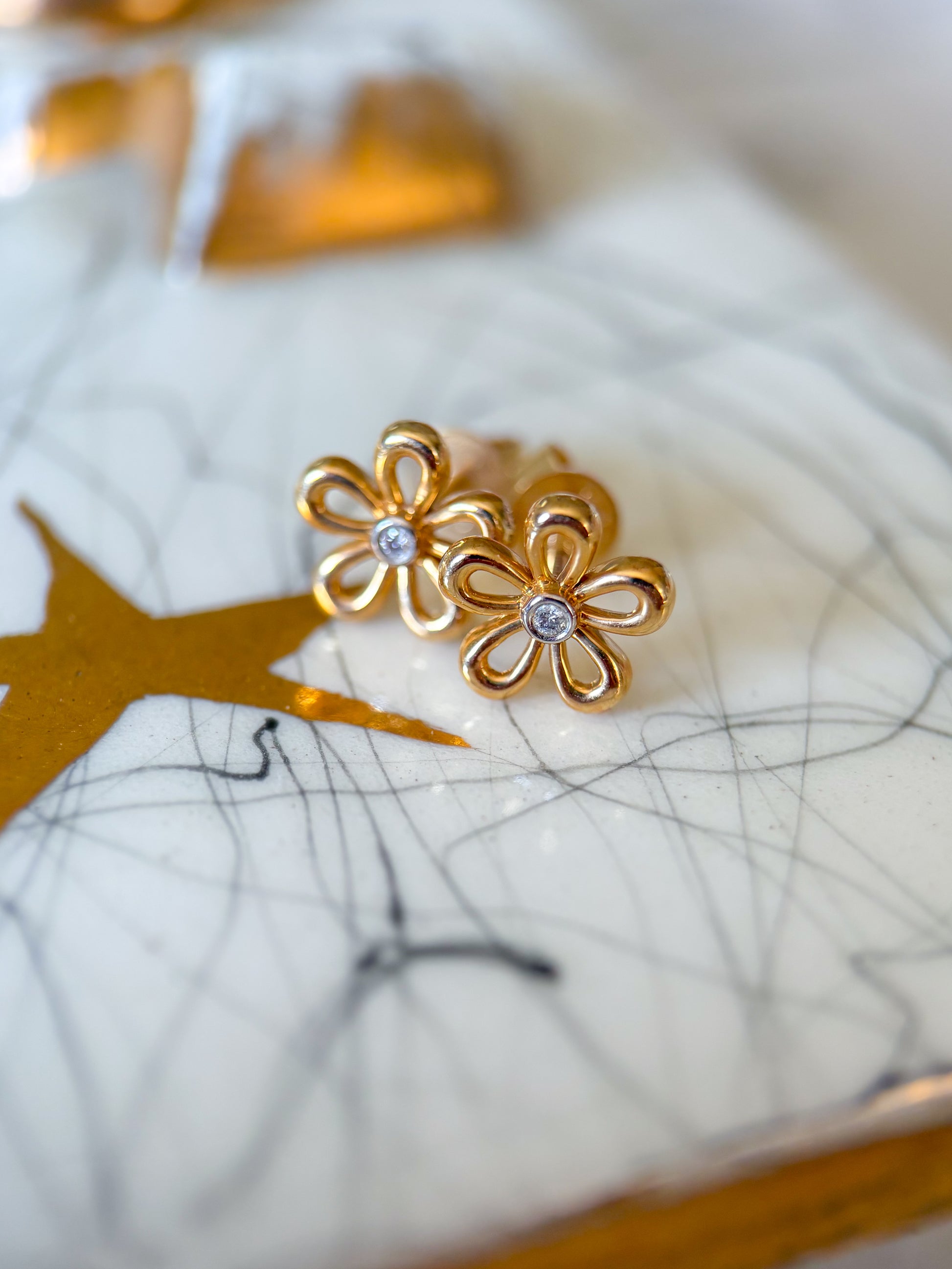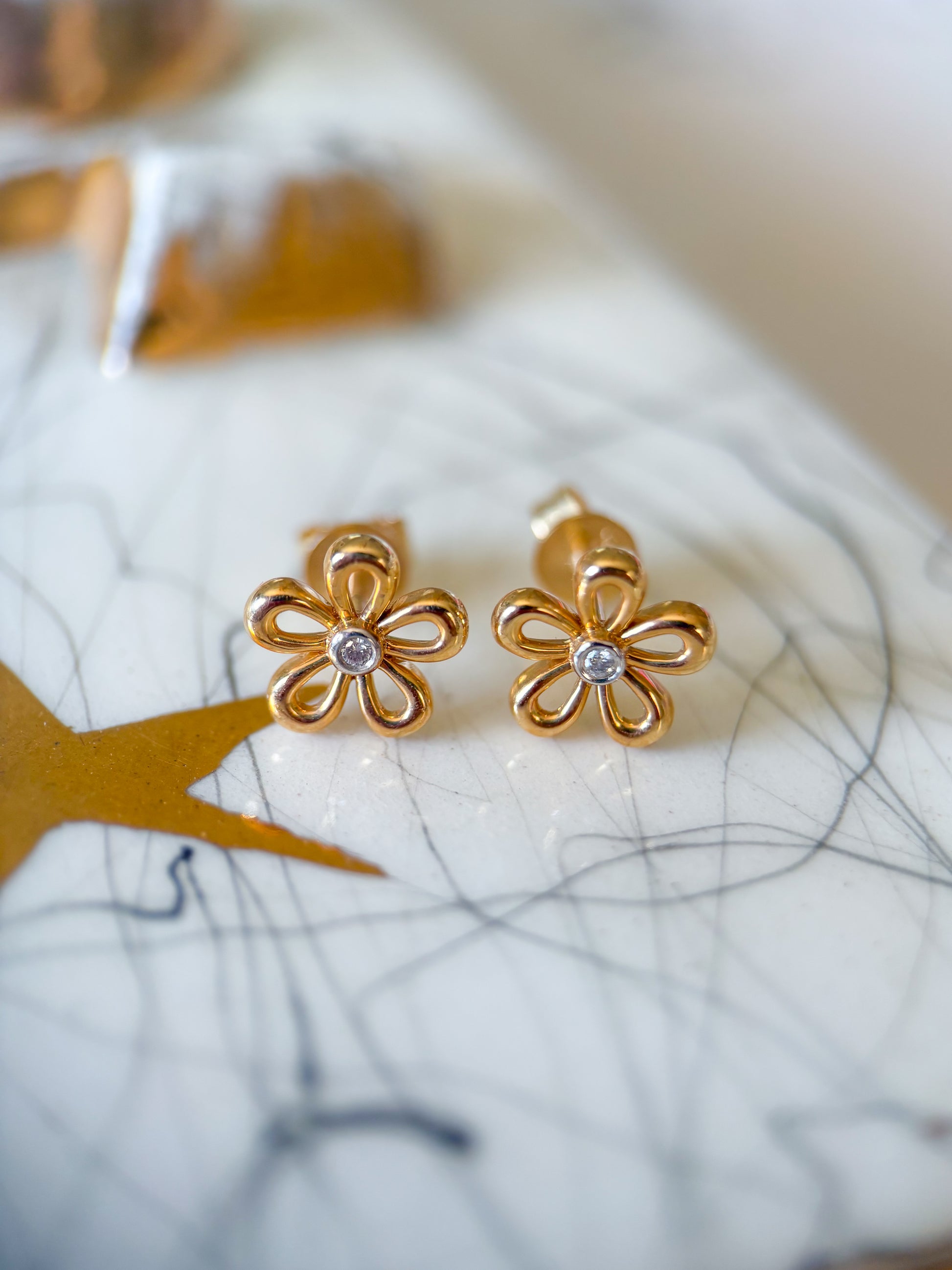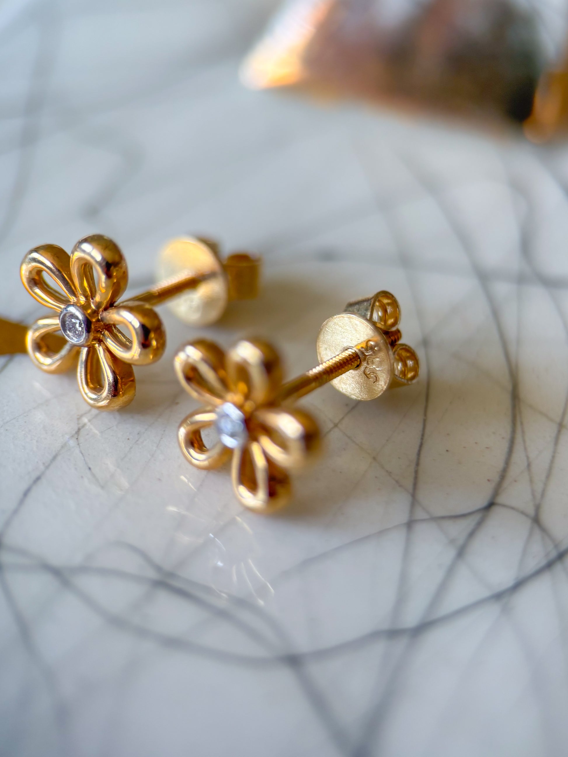 Totally in love with these adorable, 14k yellow gold flower studs with diamond centers.