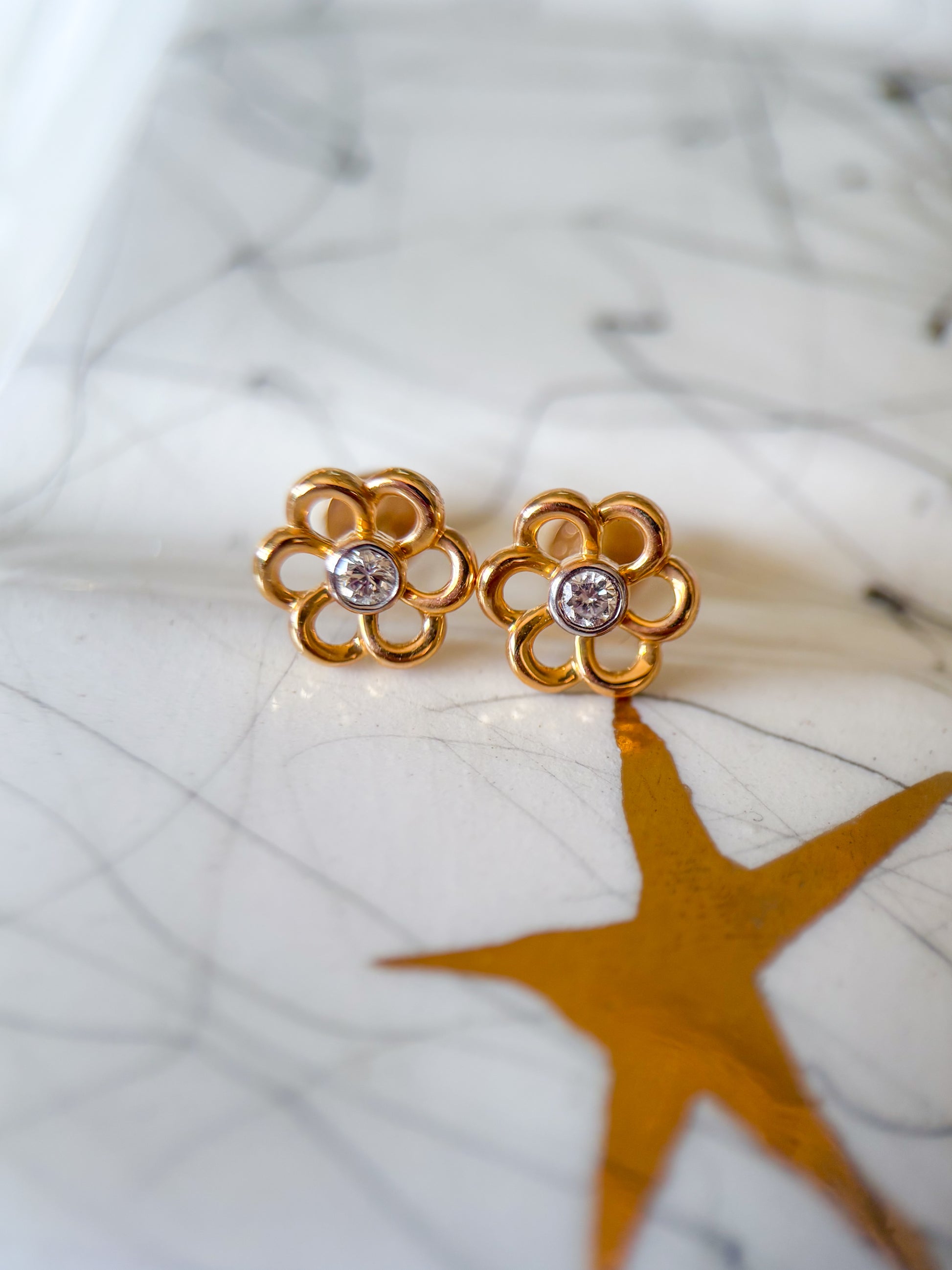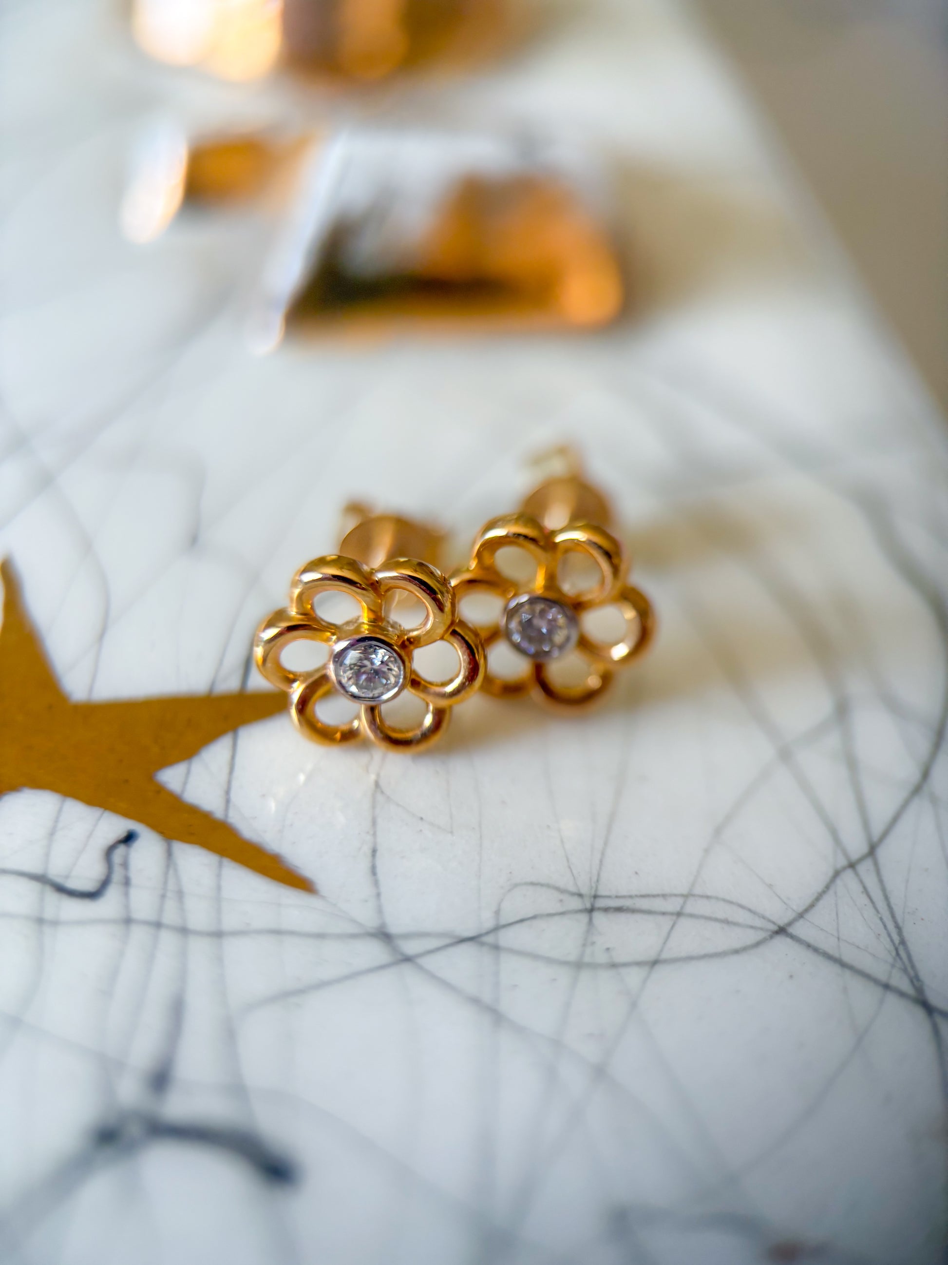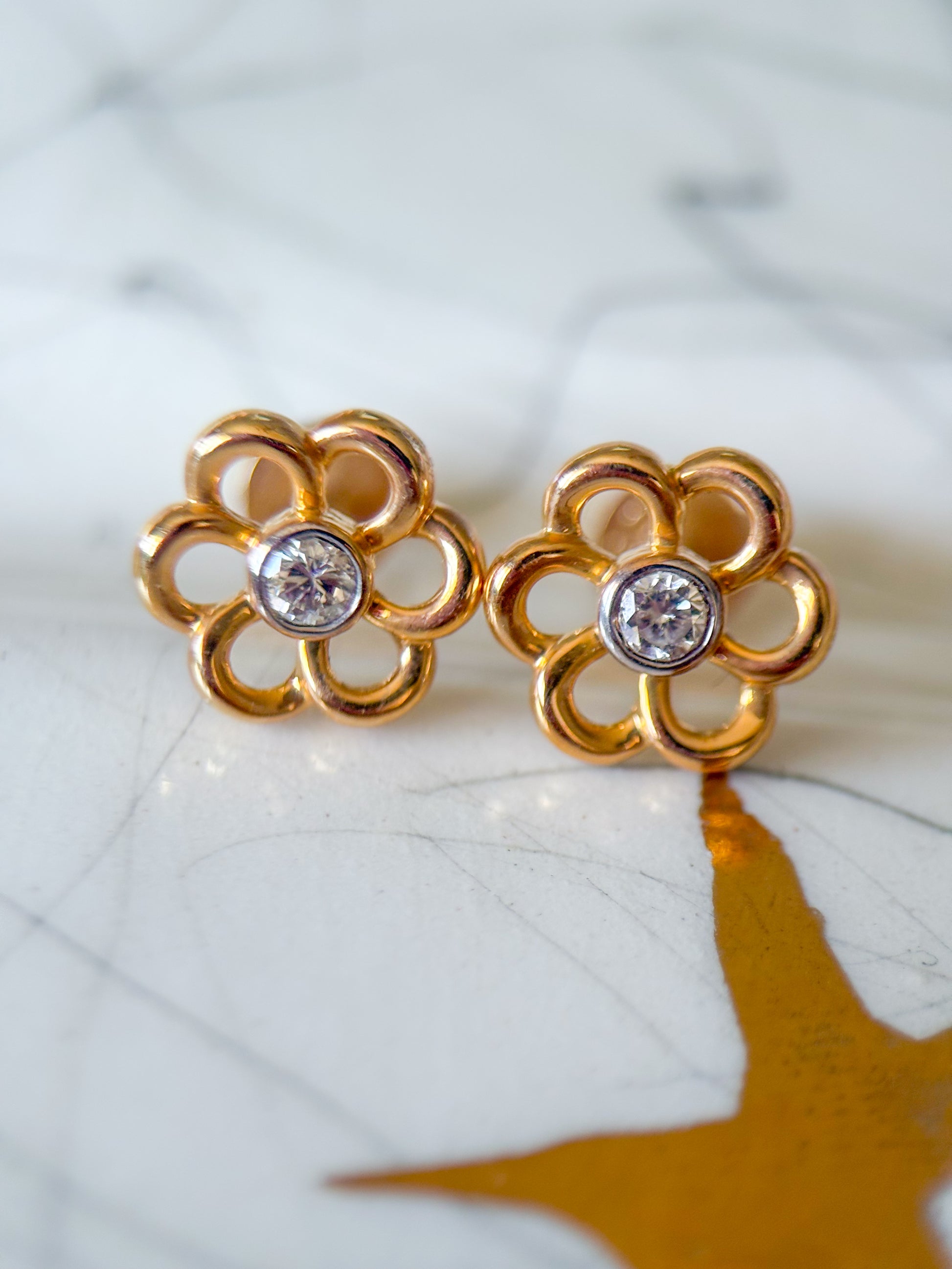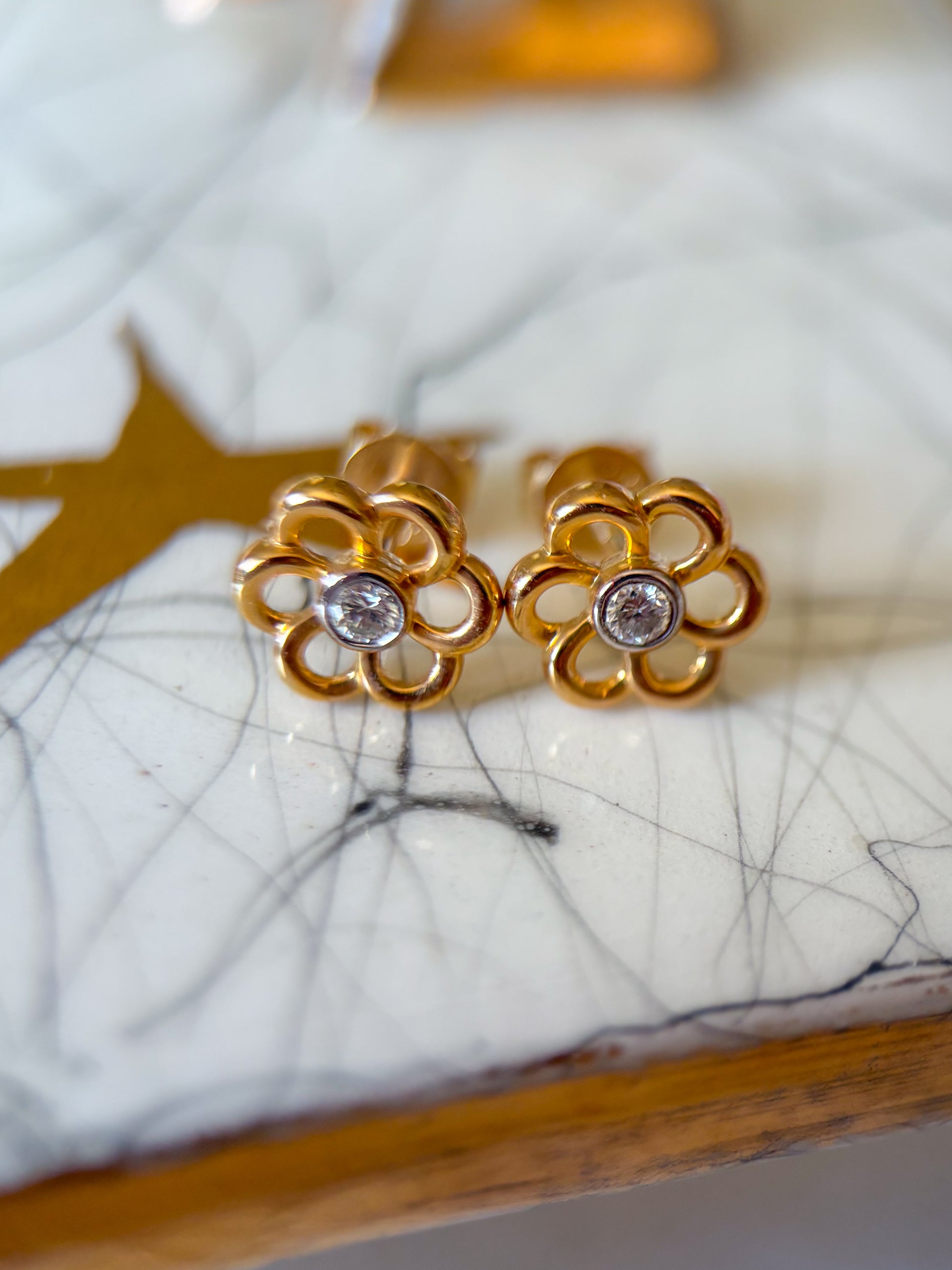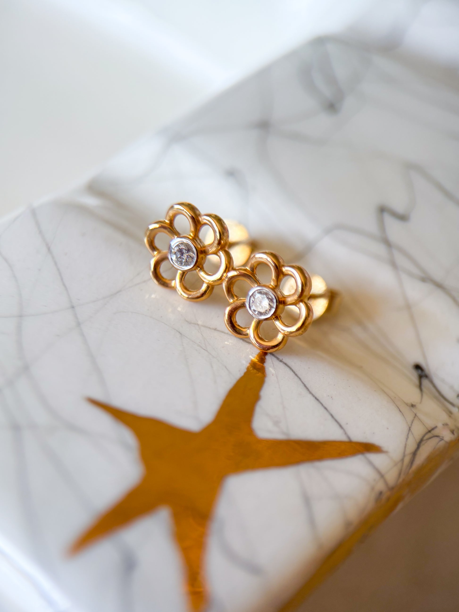 Totally in love with these adorable, 14k yellow gold flower studs with diamond centers.