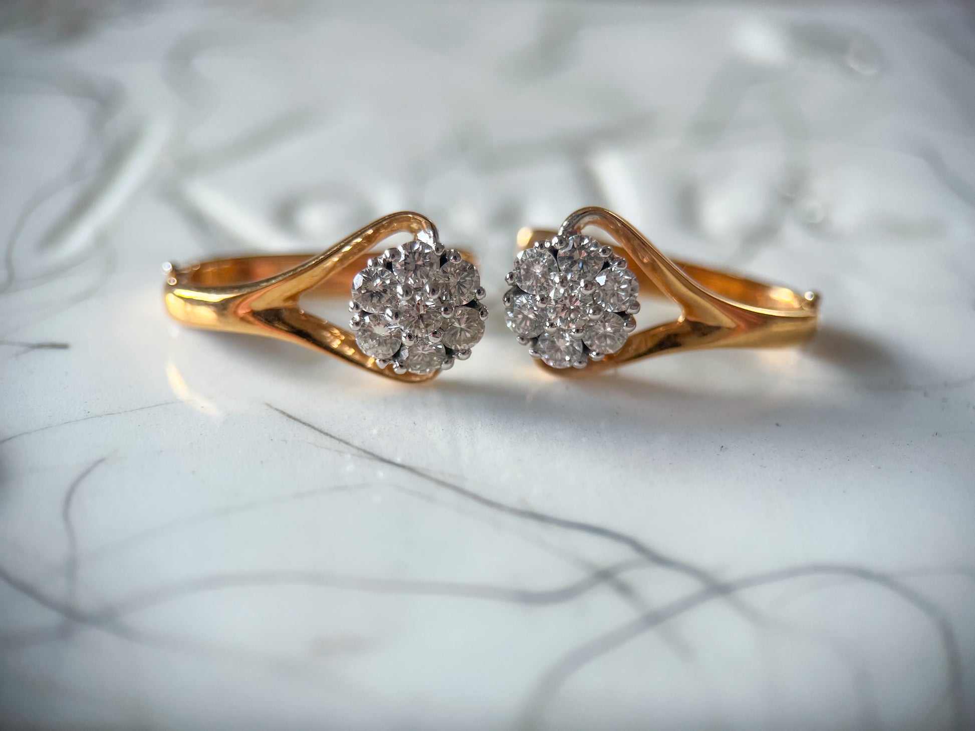What a stunning pair of diamond earrings! These are made of 18k white and yellow gold and natural round diamonds. The diamonds are set to create the sweetest flower, accented by the gold forming into a drop shape. Just gorgeous and they look so good on!