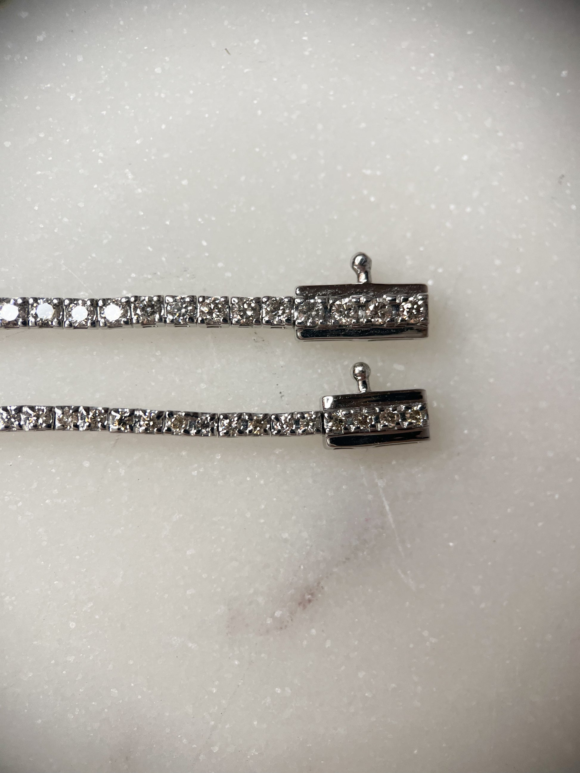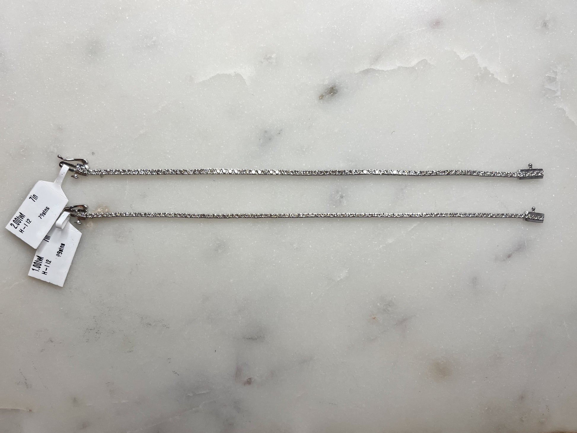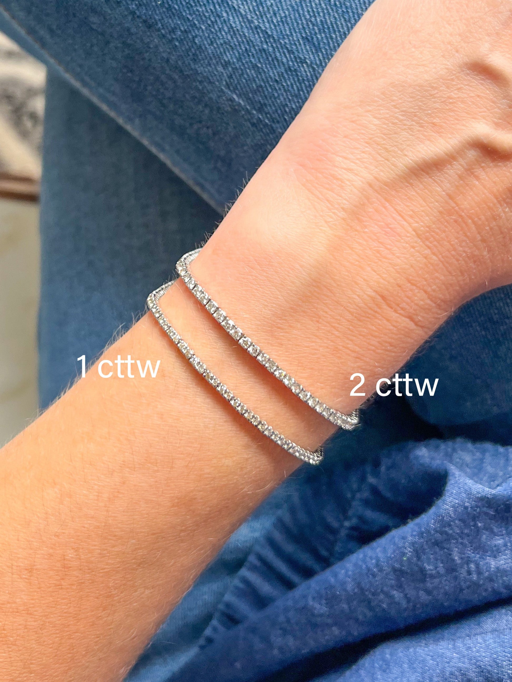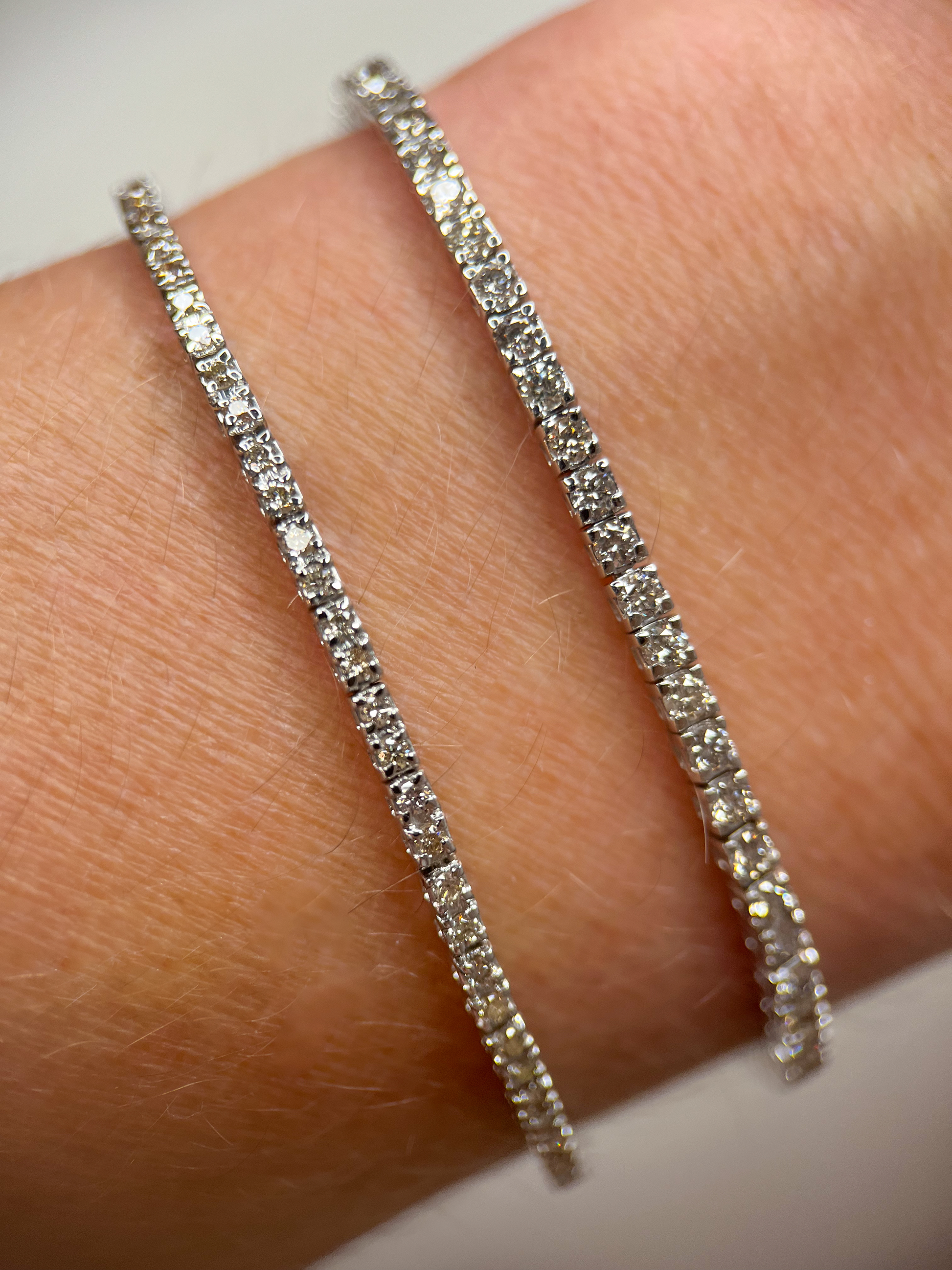 Diamond tennis bracelets make the perfect addition to anyone's arm candy. We currently have in stock, two gorgeous tennis bracelets - each 7 inches long and made of 14 karat white gold and H-I color, I2 clarity, natural diamonds. We have a 1 carat total weight bracelet (made of 88 natural diamonds) and a 2 carat total weight bracelet (made of 79 natural diamonds). Both stunning. We can source any carat size - from 1 to 10 carats, so if you are looking for something bigger, please message us. These are not vintage.