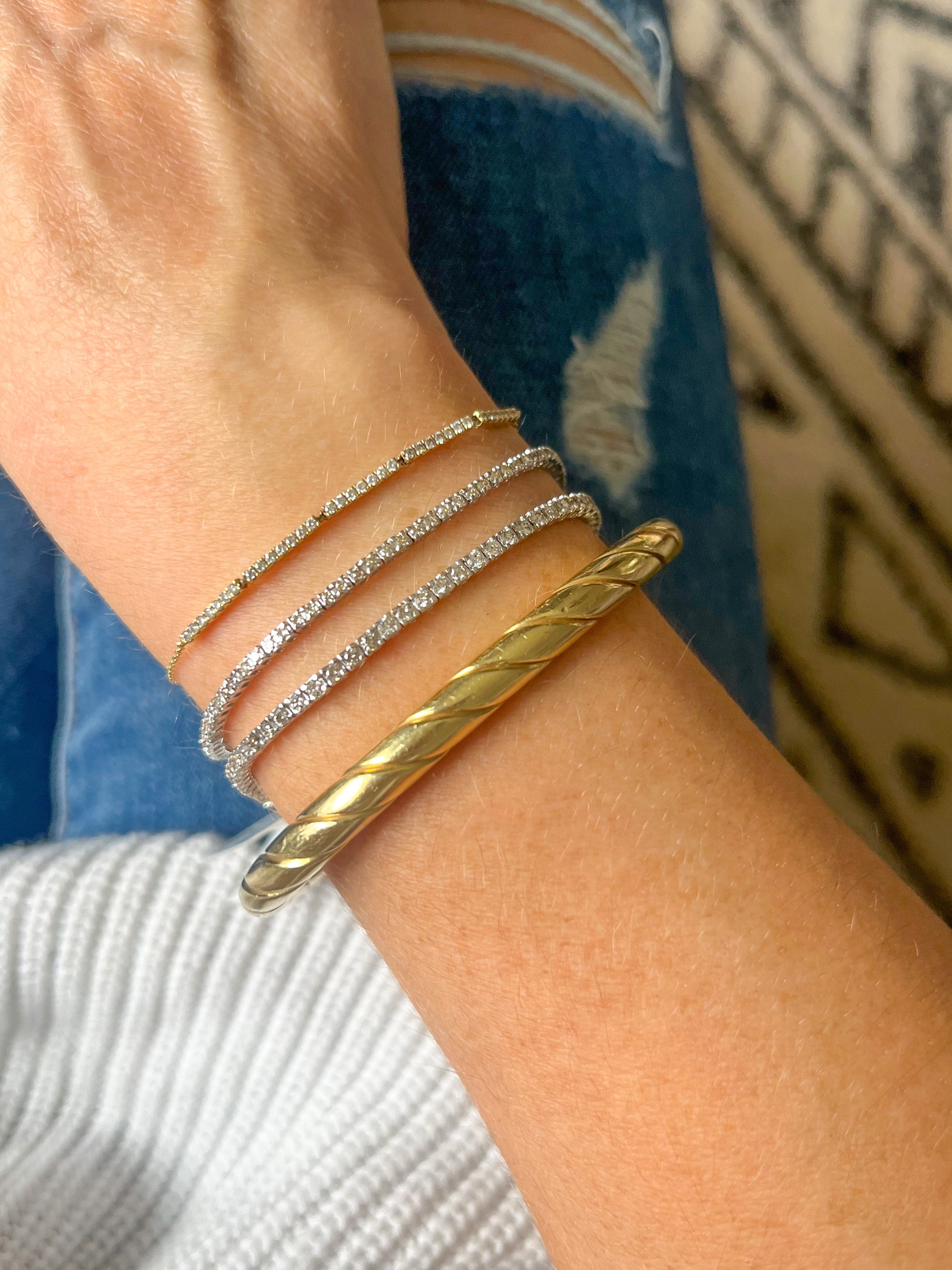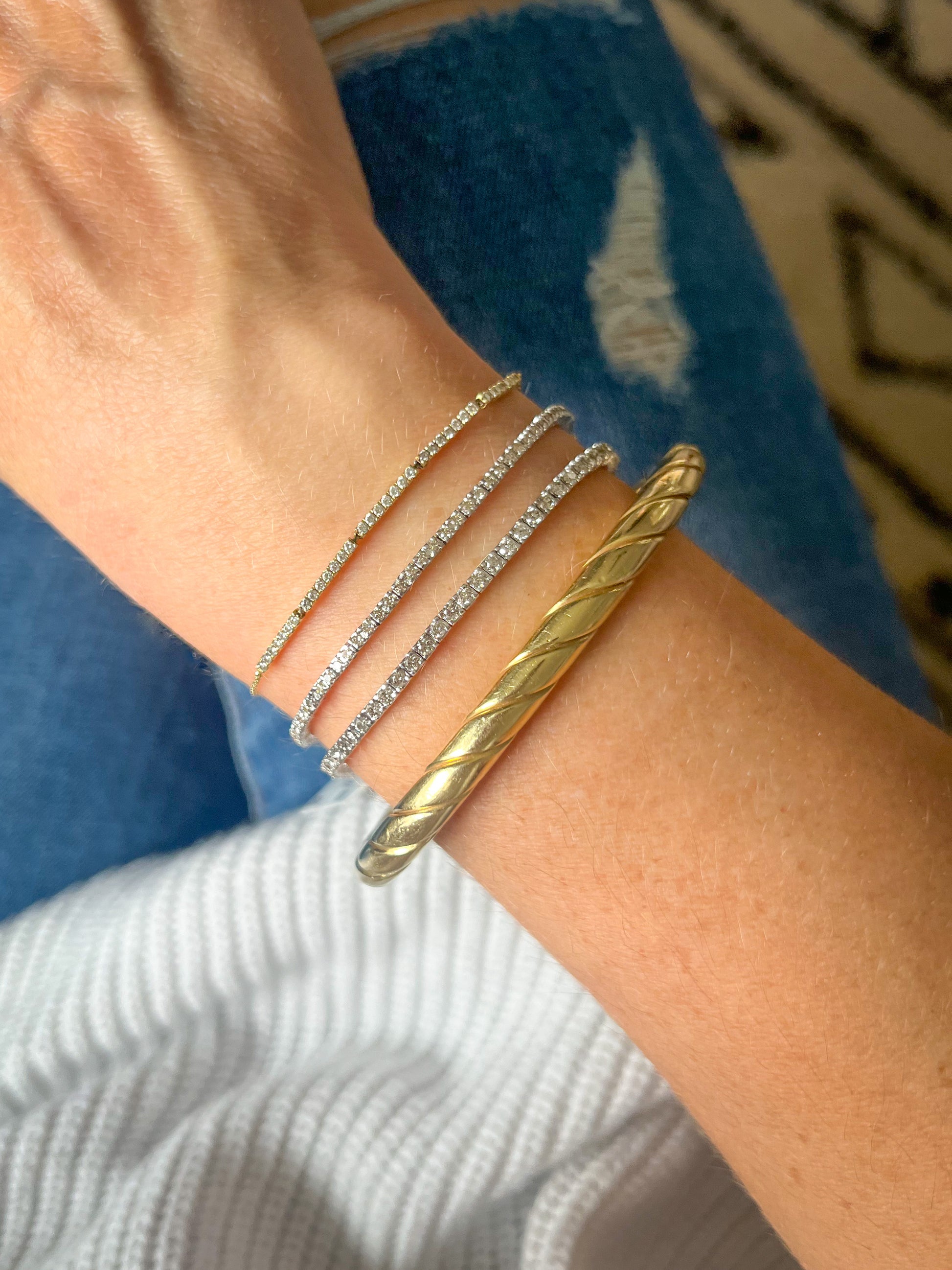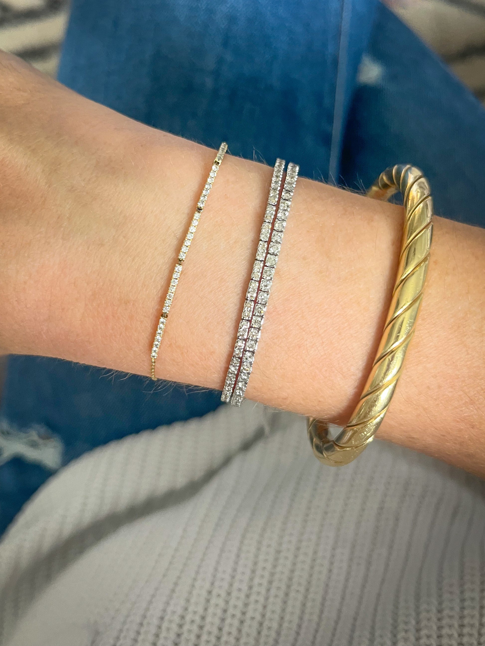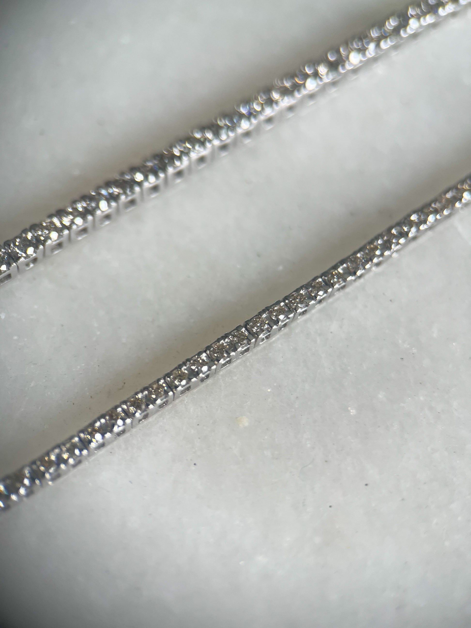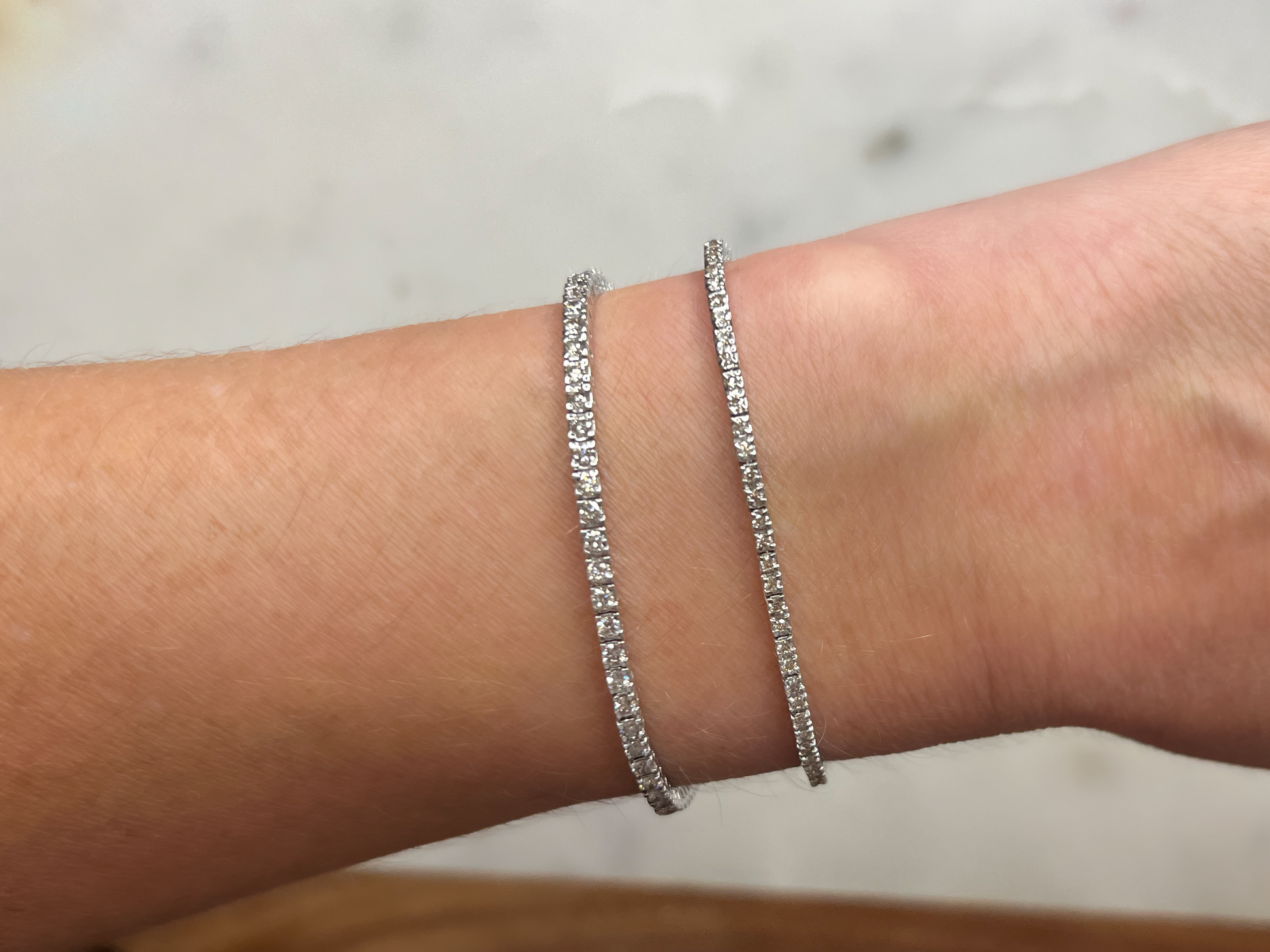 Diamond tennis bracelets make the perfect addition to anyone's arm candy. We currently have in stock, two gorgeous tennis bracelets - each 7 inches long and made of 14 karat white gold and H-I color, I2 clarity, natural diamonds. We have a 1 carat total weight bracelet (made of 88 natural diamonds) and a 2 carat total weight bracelet (made of 79 natural diamonds). Both stunning. We can source any carat size - from 1 to 10 carats, so if you are looking for something bigger, please message us. These are not vintage.