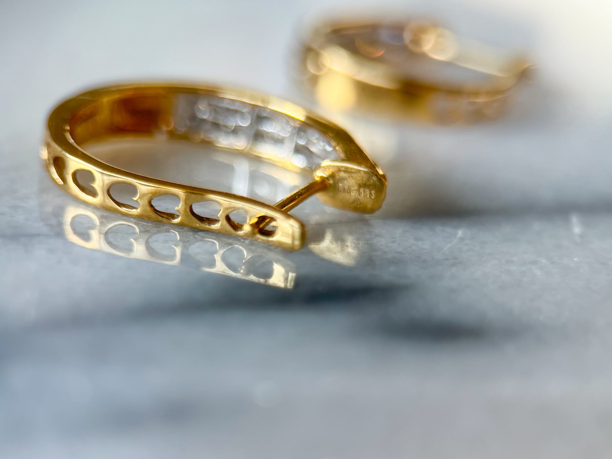 Natural Princess Cut Diamonds 14k Yellow Gold Hoop Earrings with Heart Cut Outs in Back