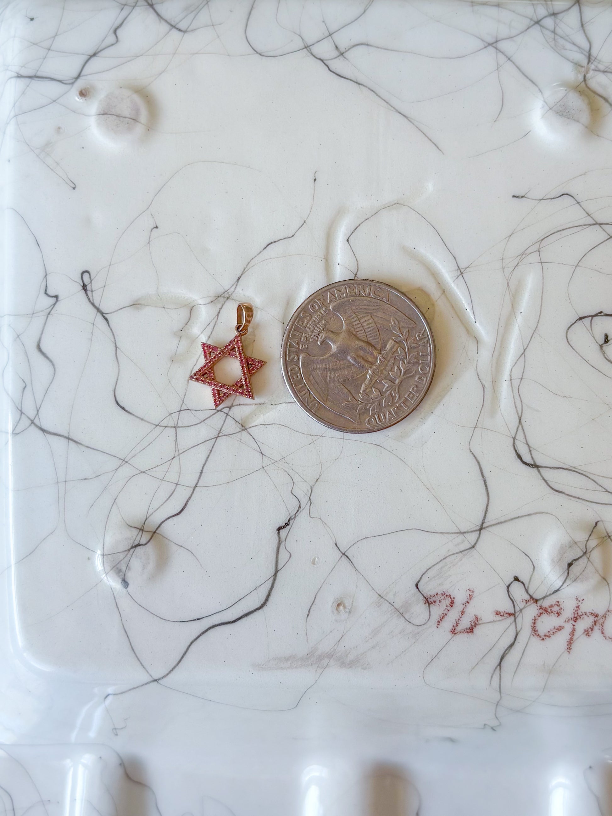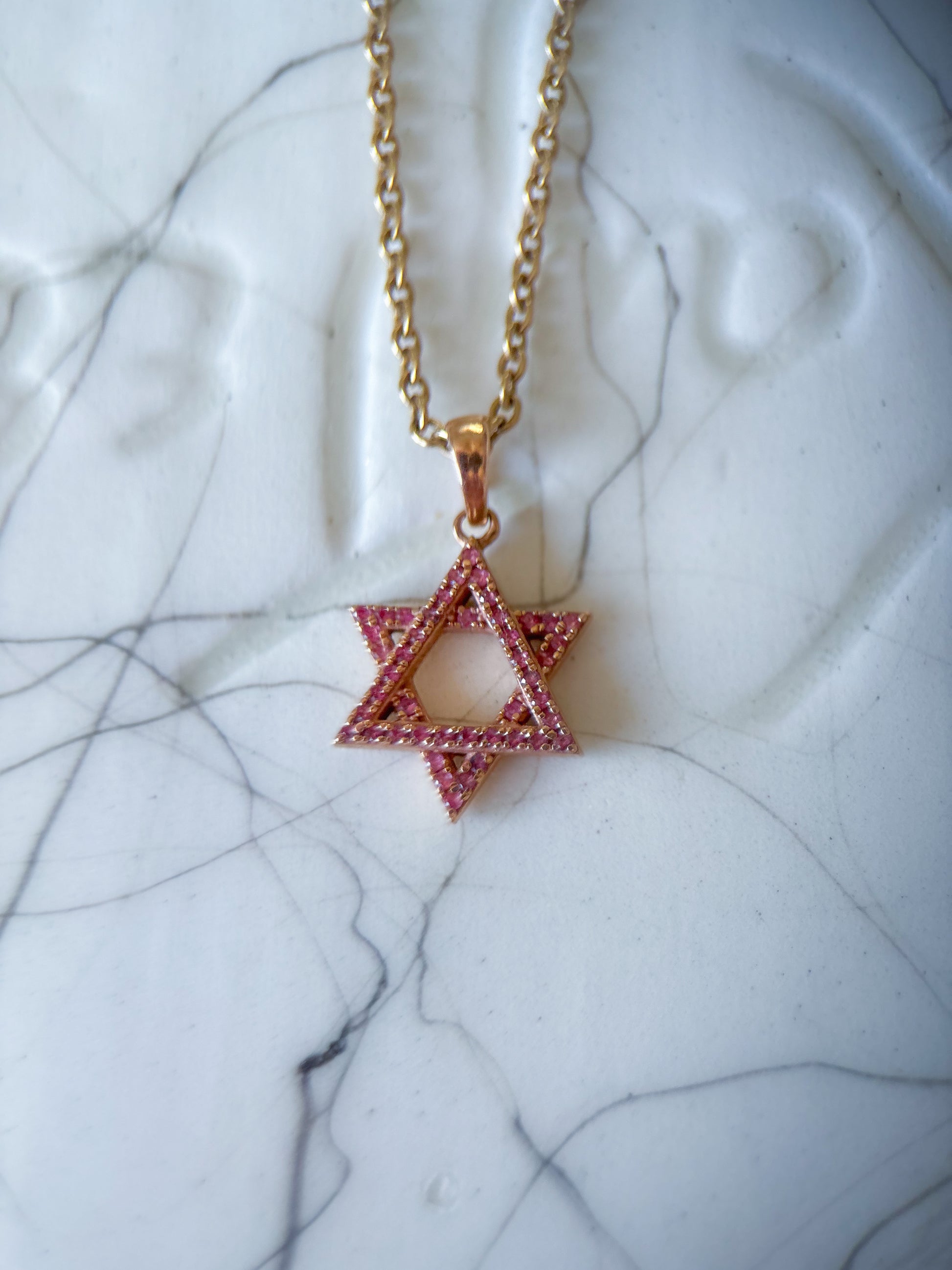 Absolutely beautiful, small, pink sapphire and 14k rose gold Star of David charm. Chain not included.