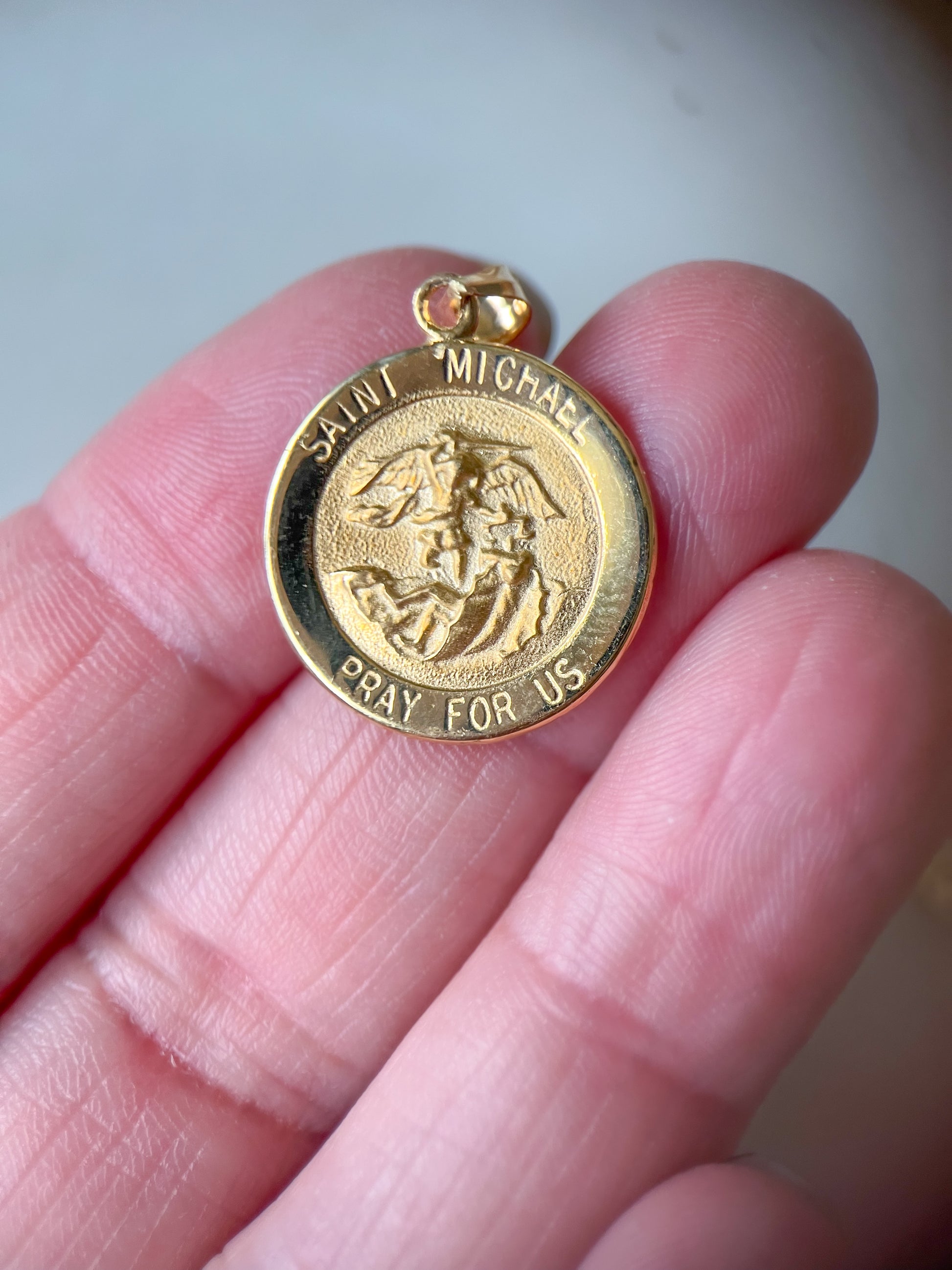 This Saint Michael charm is made of 14k yellow gold. This is not vintage, chain not included.