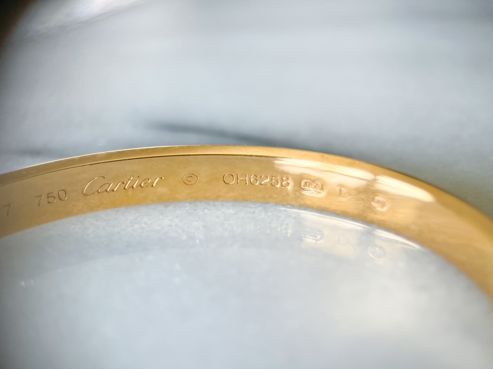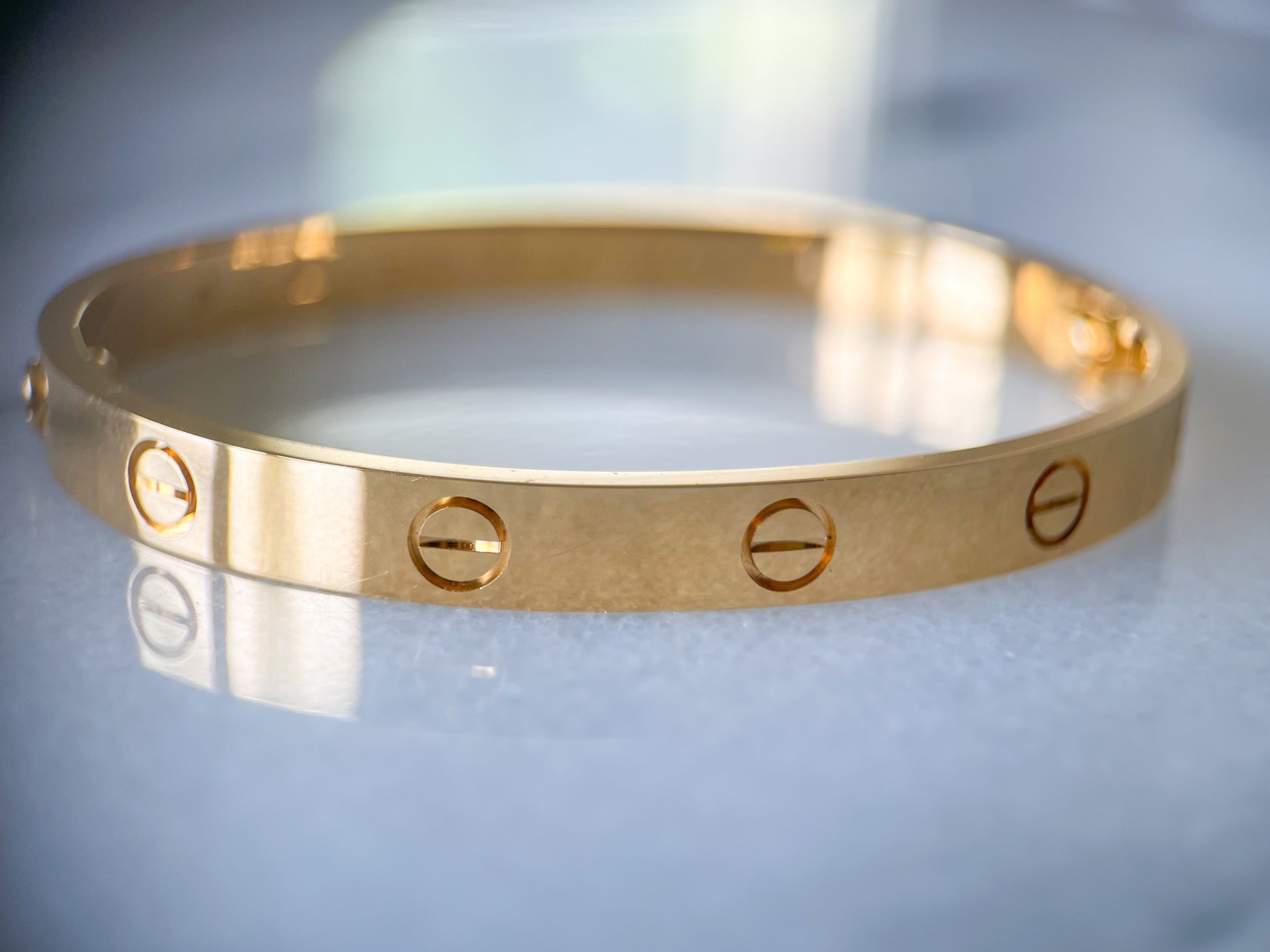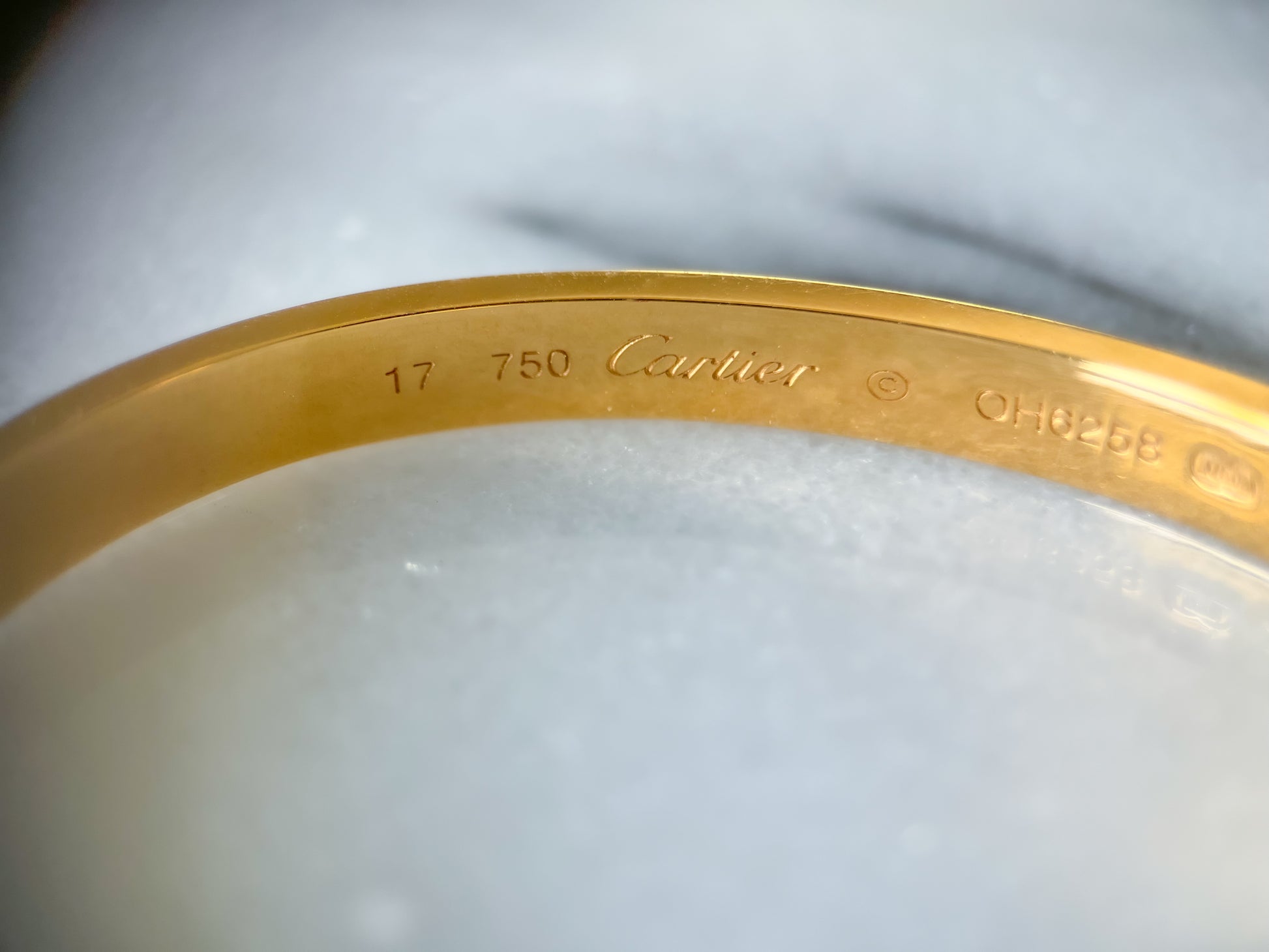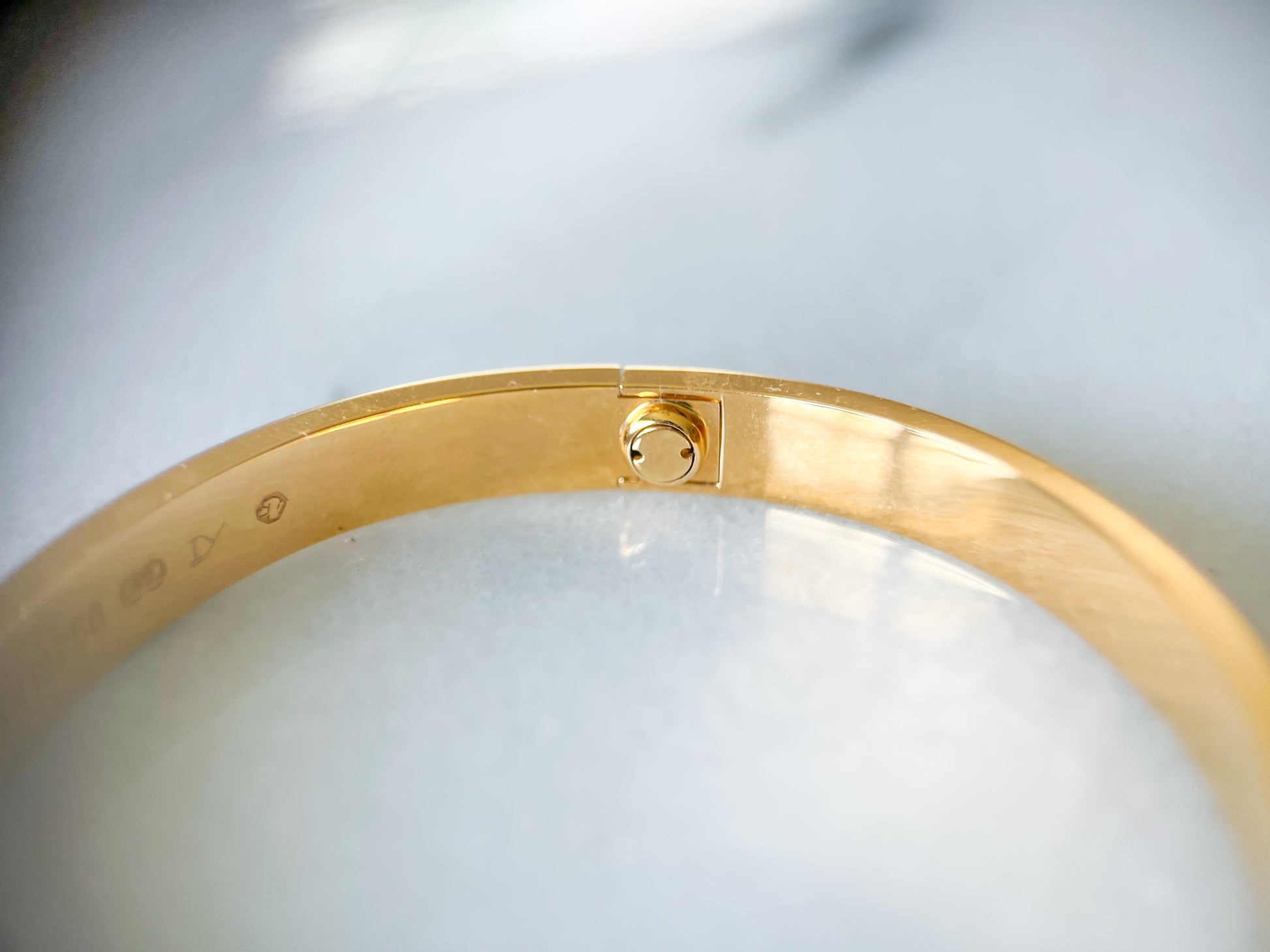 18k yellow gold solid bangle, size 17. This is a solid, heavy, stunning piece! Comes with screw to get bangle on and off. This piece is not vintage.