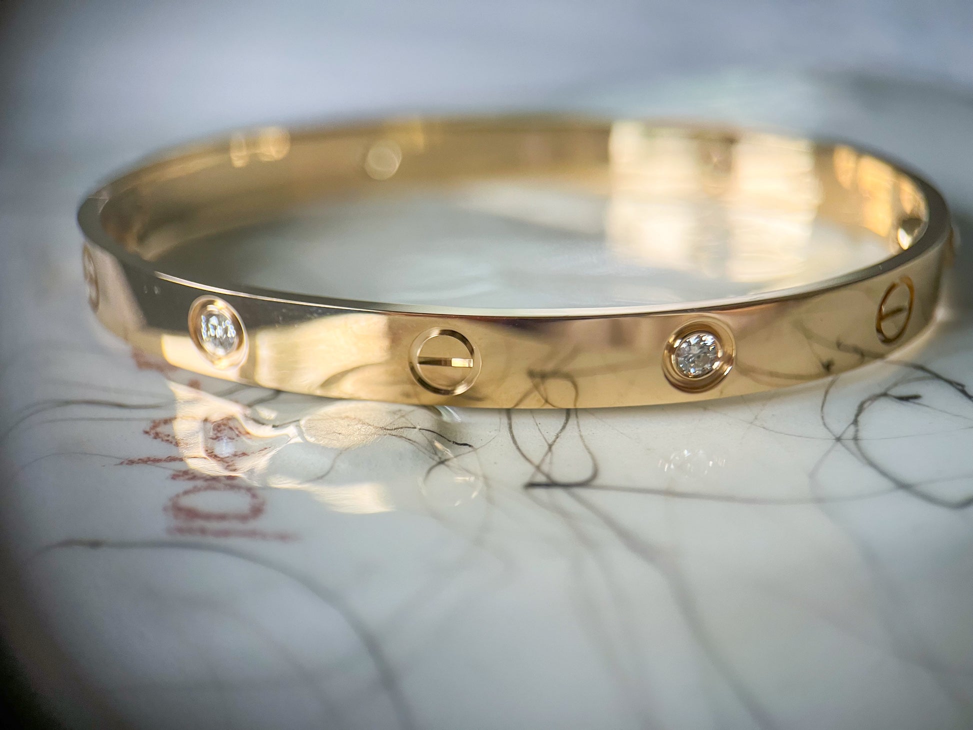 Size 19 18k Yellow Gold Solid Screw and Natural Diamond Bangle