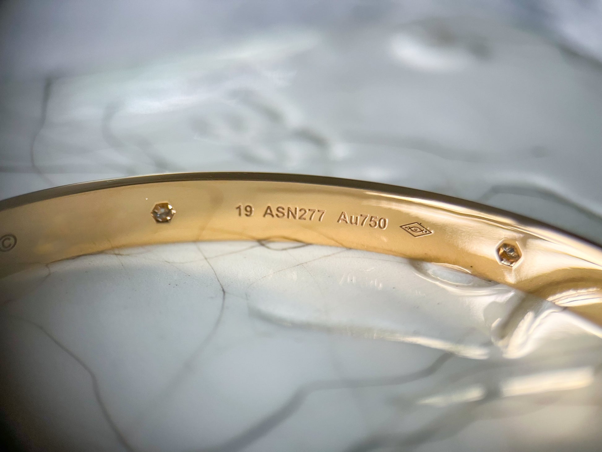 18k yellow gold and natural round diamond, solid bangle, size 19. This is a solid, heavy, stunning piece! Comes with screw to get bangle on and off. This piece is not vintage.