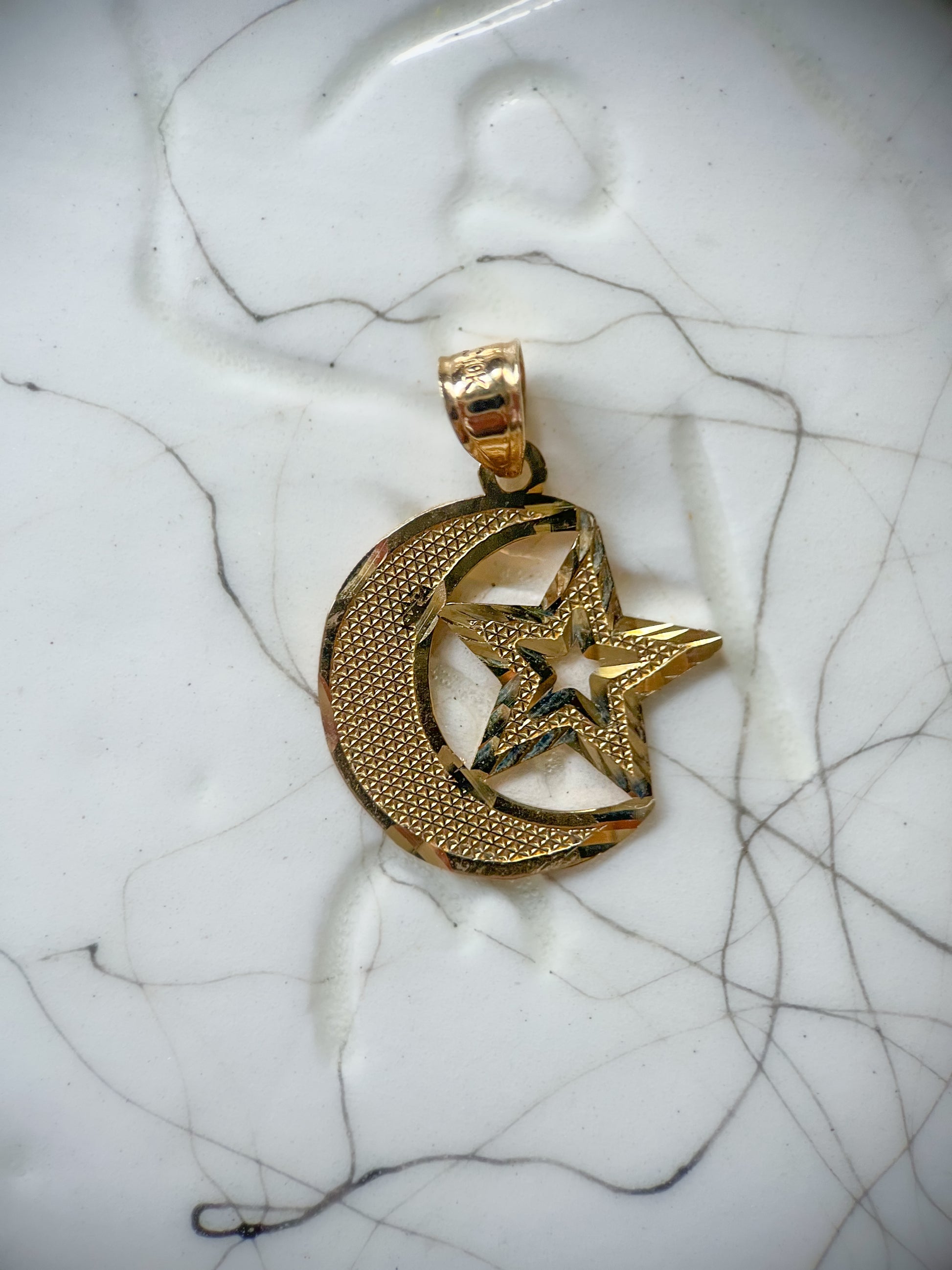 Very cool, 10k yellow gold moon and star charm. This charm is not vintage. Chain not included.
