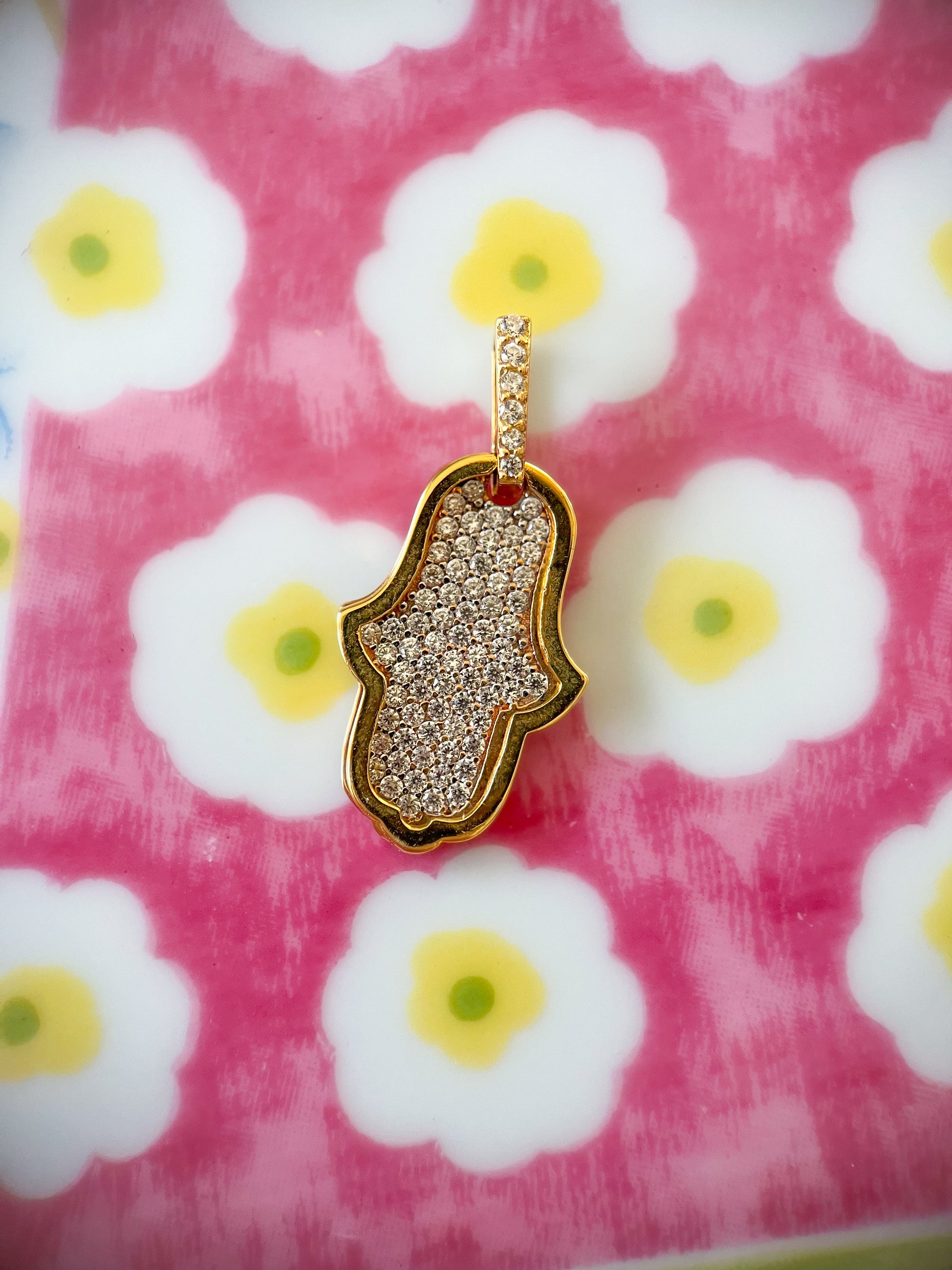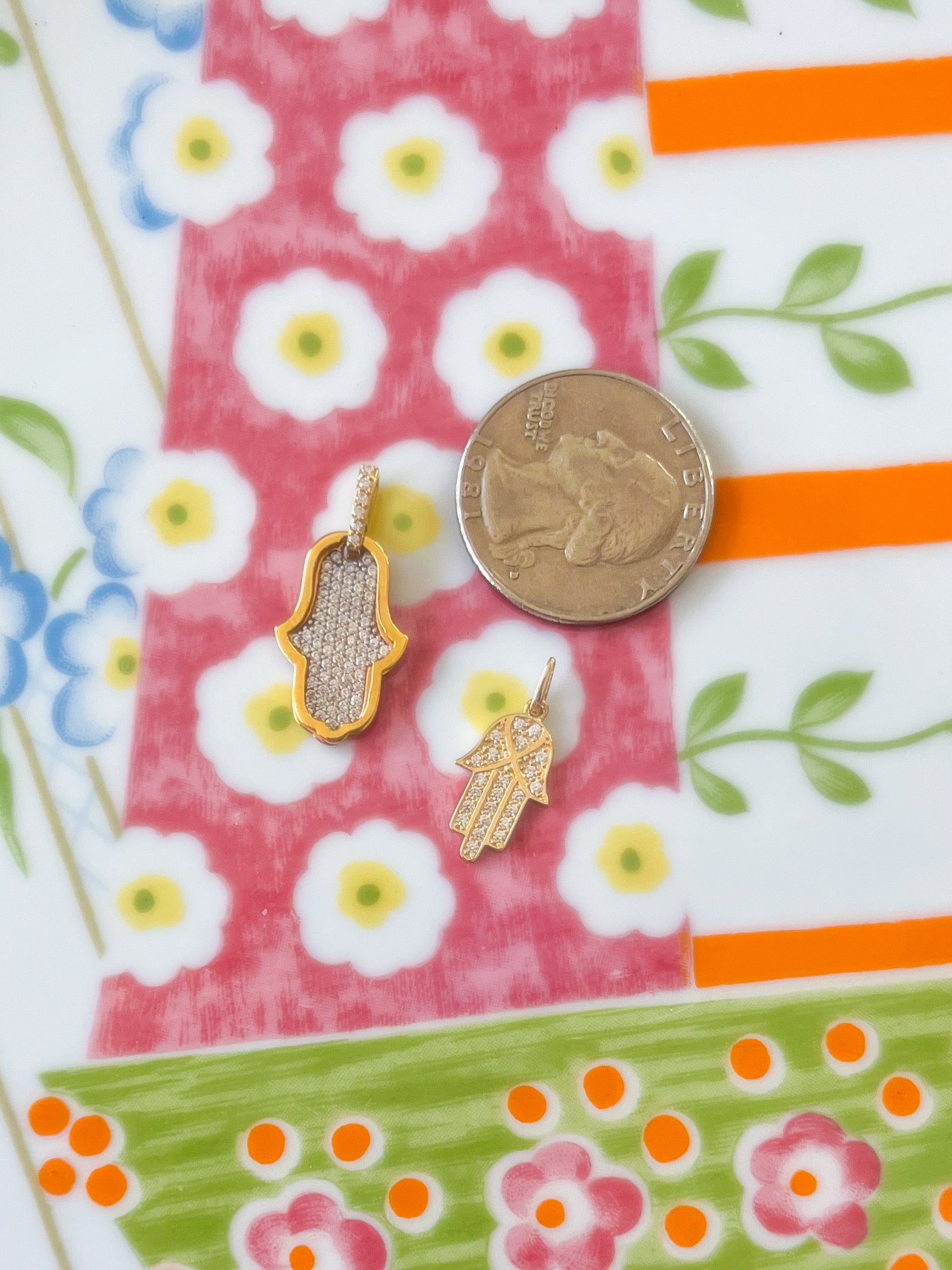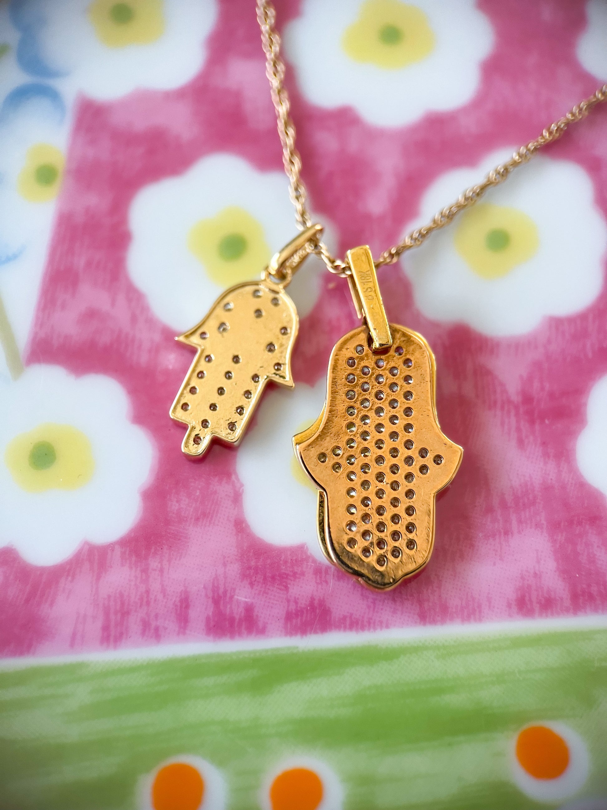 Two super cool, 14k and 18k yellow gold hamsa charms with CZs. These charms are not vintage. Chains not included.