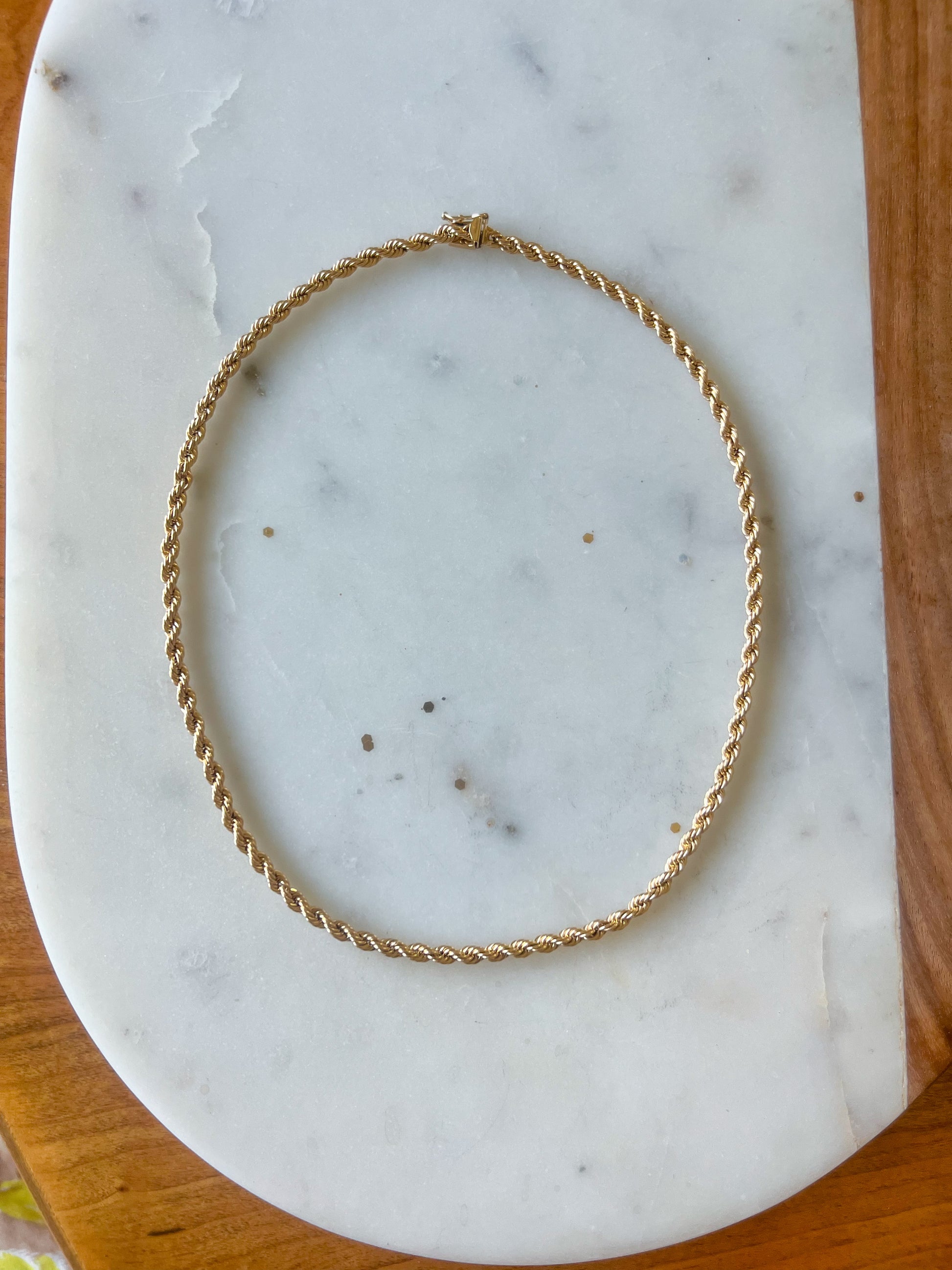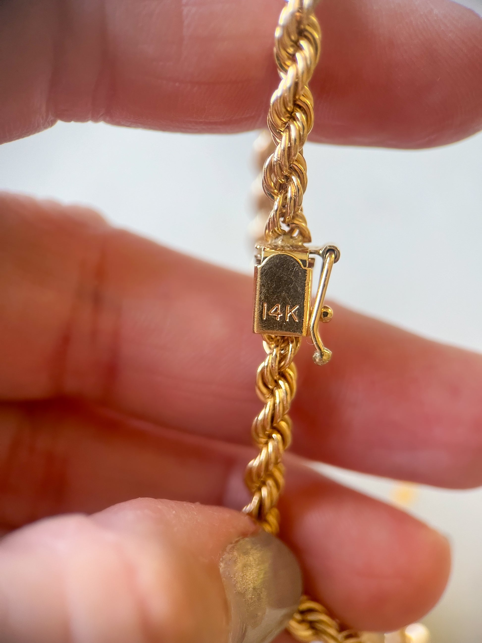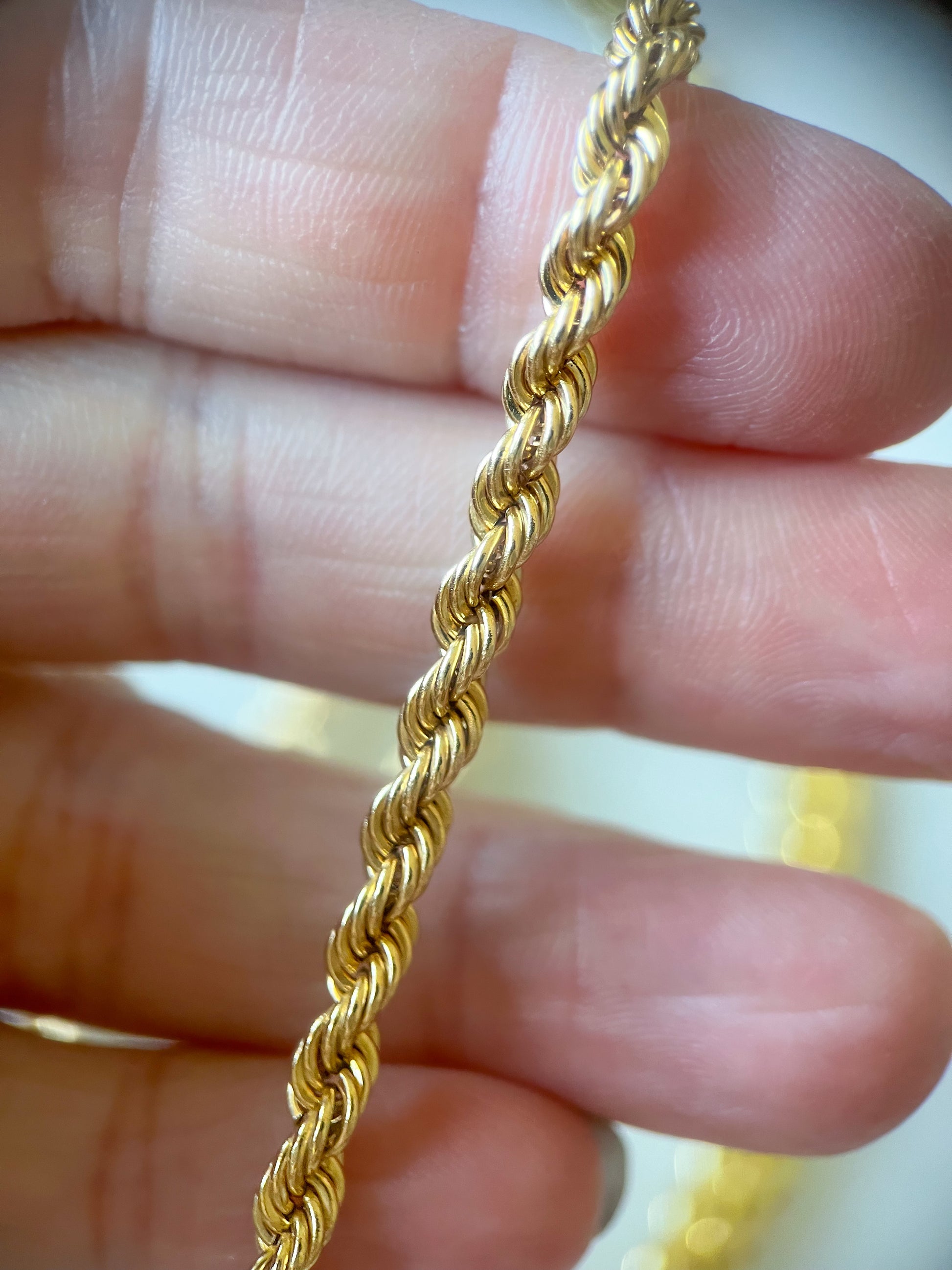 This chain is a 14k yellow gold rope chain weighing 11.5 grams. It is 18 inches long and 3.7mm wide.