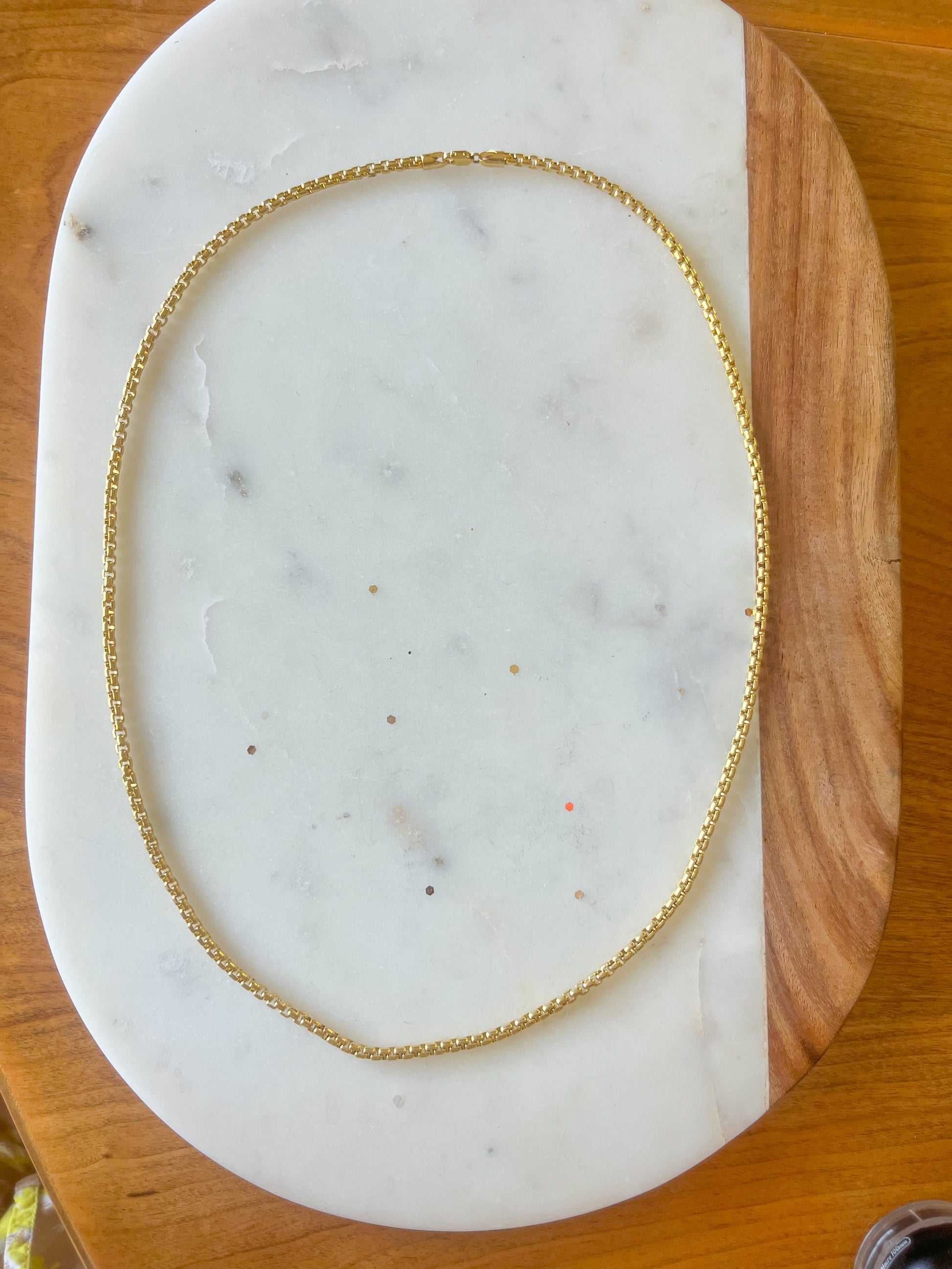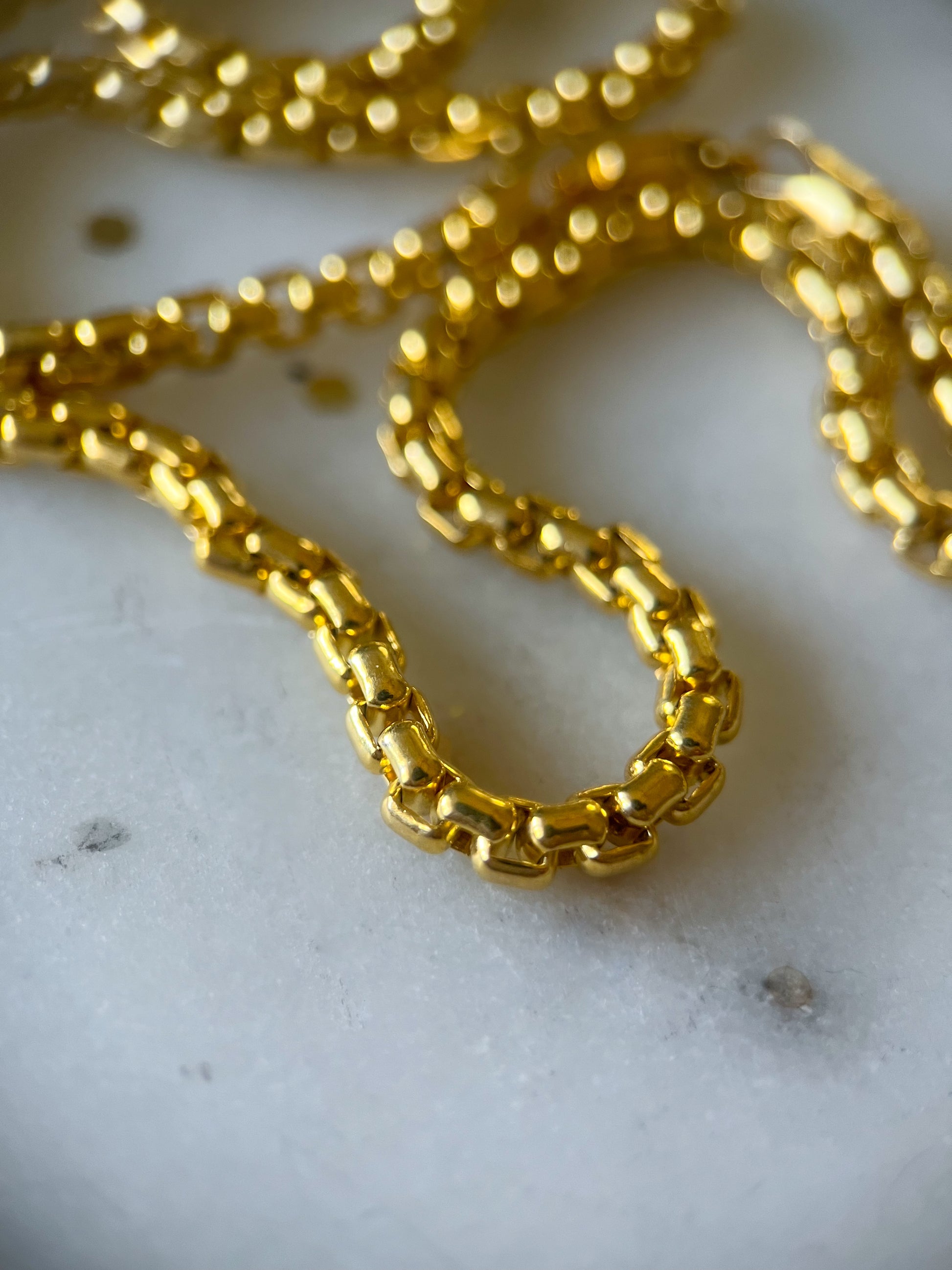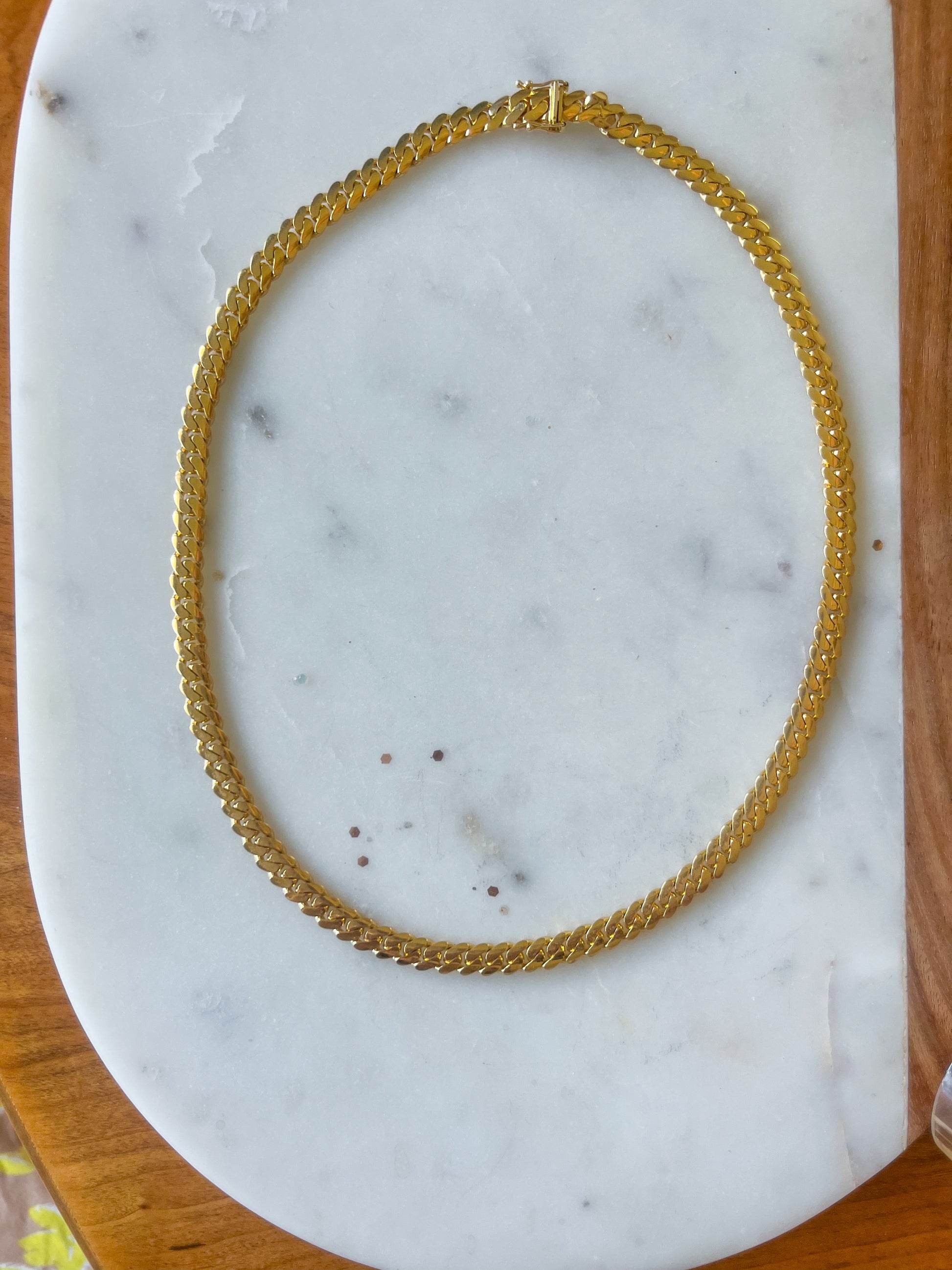 This chain is made of 14k yellow gold and weighs 40.33 grams. It is 3.4 mm thick and 26 inches long.