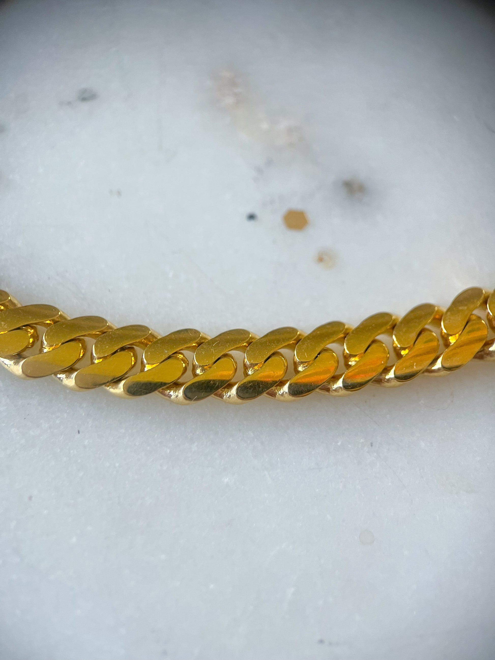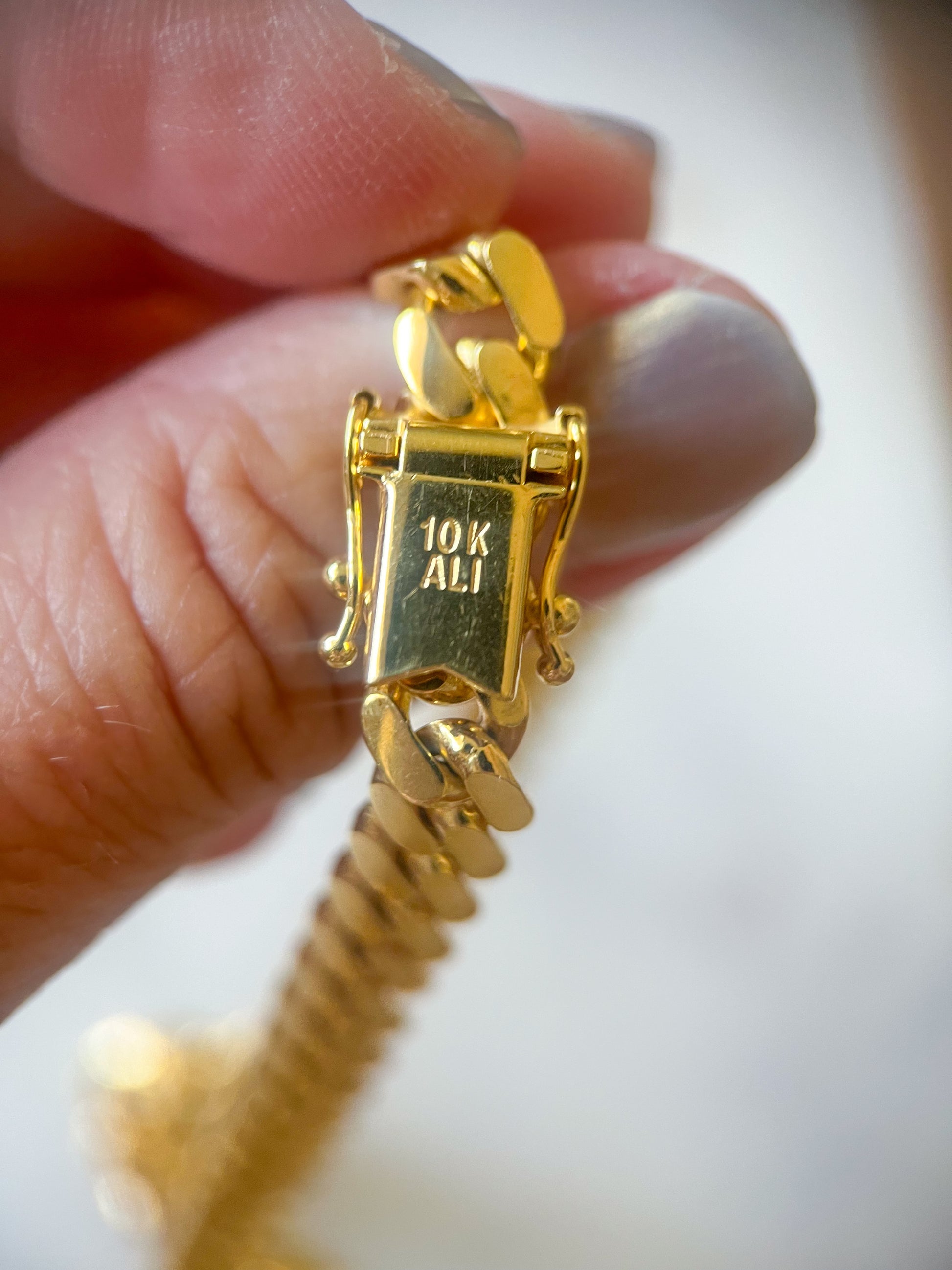 This chain is made of 10k yellow gold and weighs 55.78 grams. It is 20.5 inches long and 6.8mm thick.