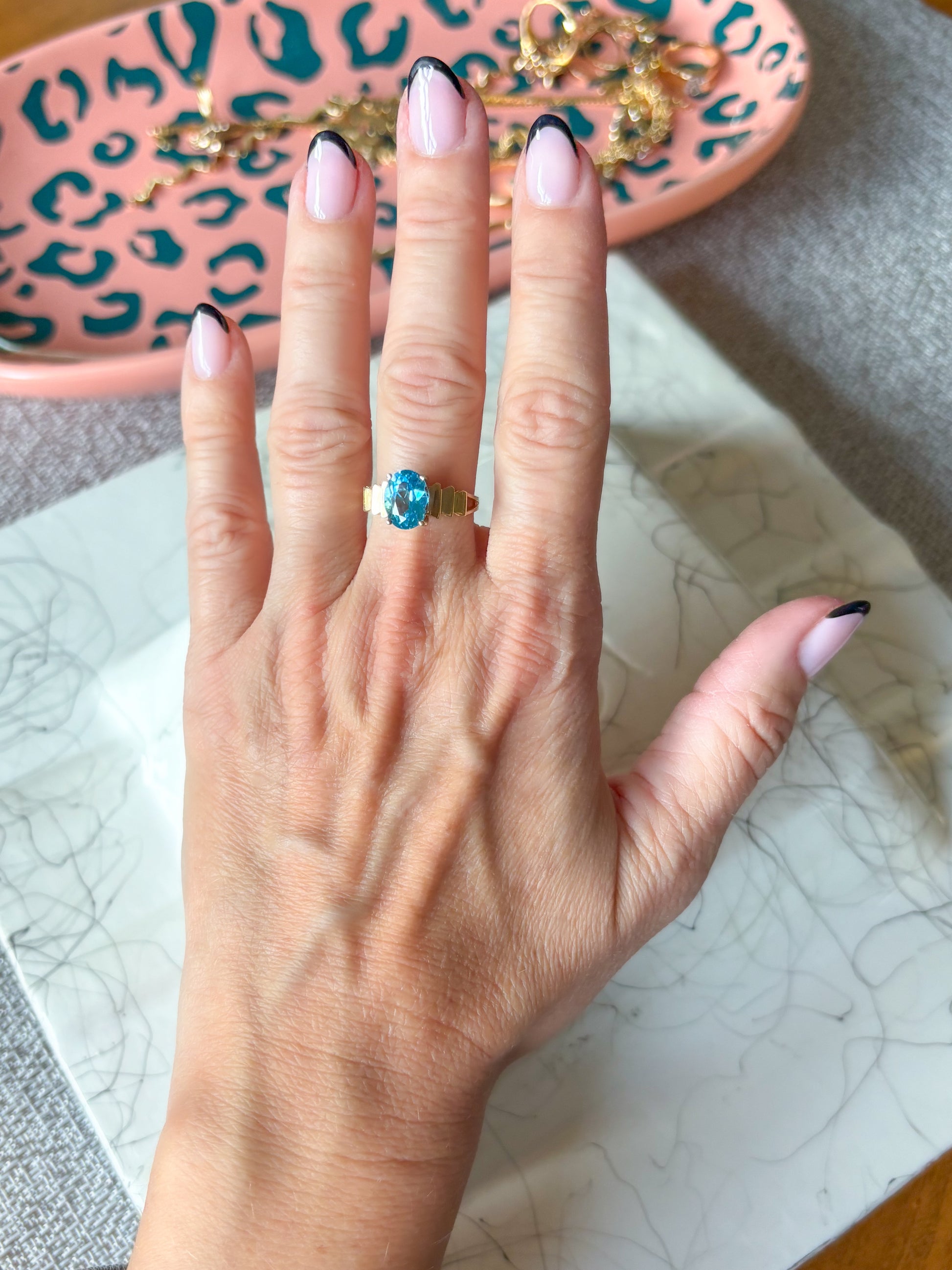 I am loving this vintage, 10k yellow gold ring featuring one synthetic blue stone. The gold design is really cool and unique. Ring is a size 6 3/4 and can be resized at your local jeweler.