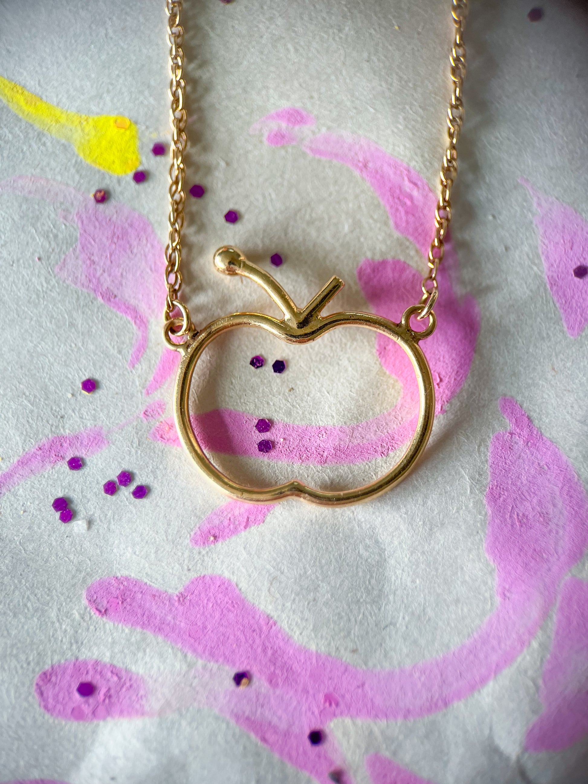 Really sweet, apple charm on a chain. The apple was acid tested at 14k but there is no marking. The chain is 10k. Selling as 10k. Chain included.