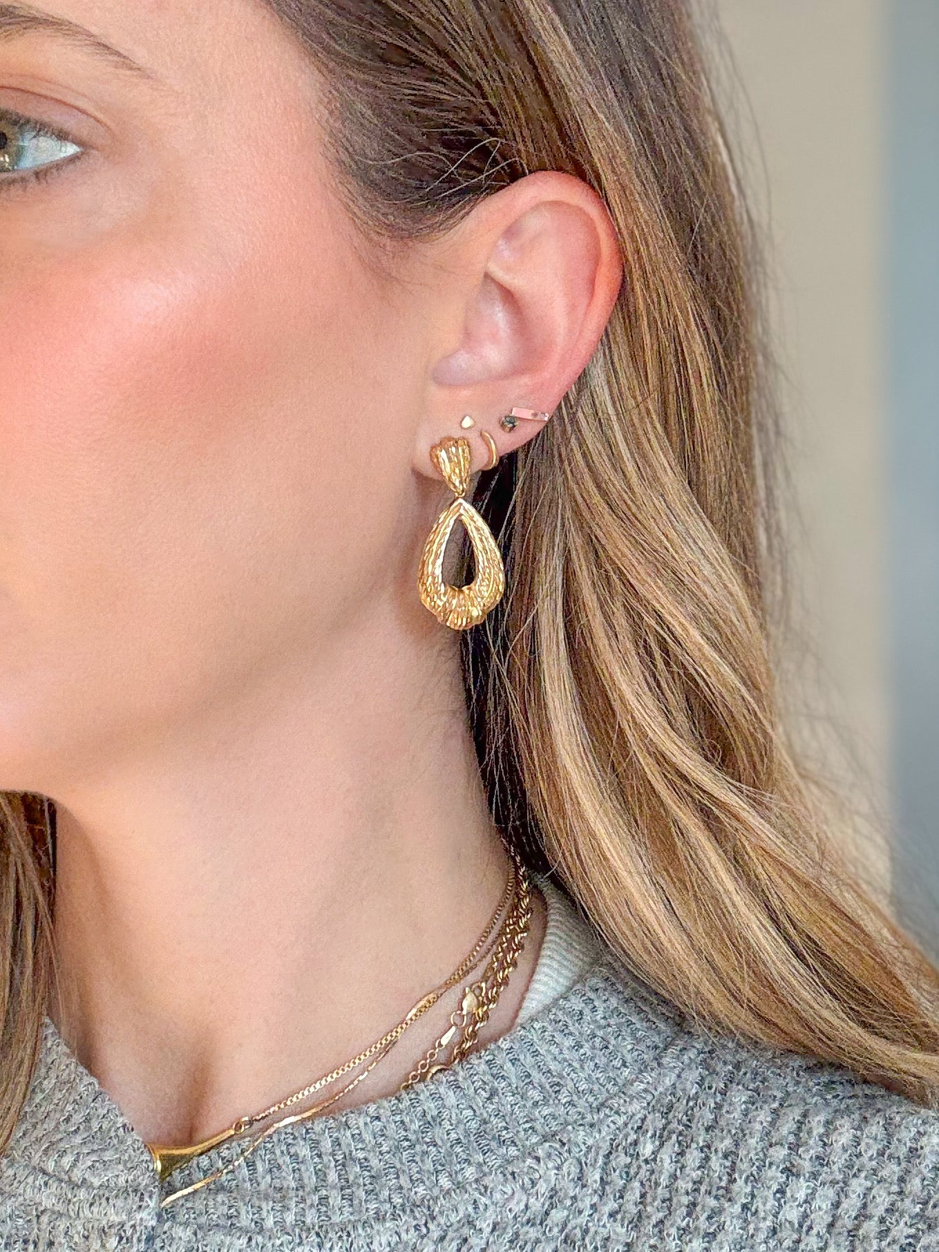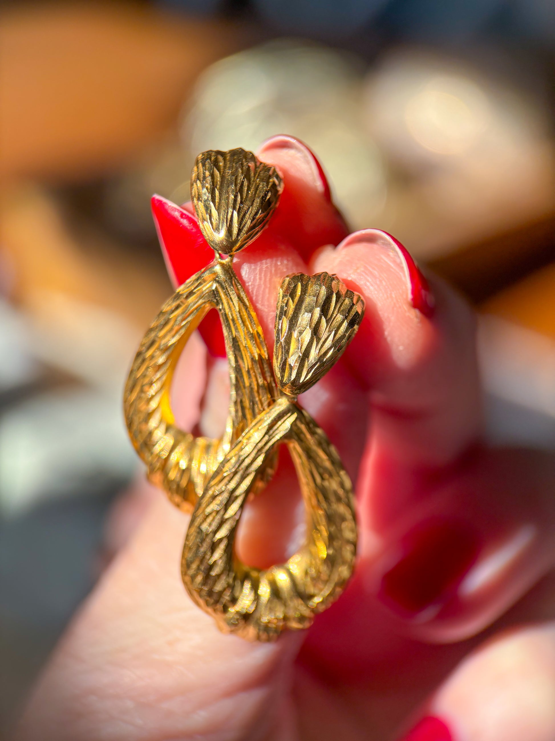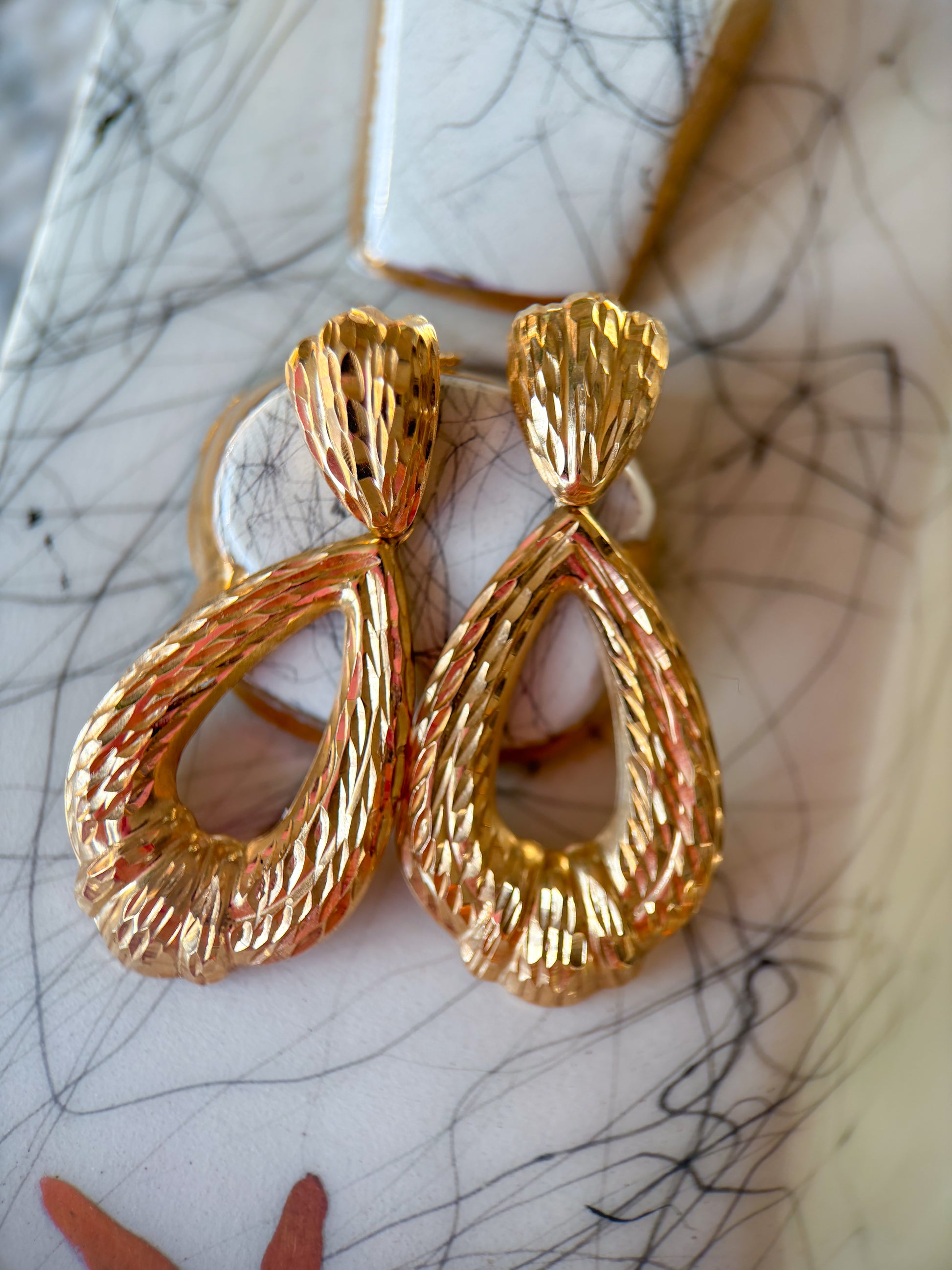 These 14k yellow gold, vintage earrings are awesome! They are large and showy, but lightweight and easy to wear. These earrings feature a drop - sorta a different take to the 'door knocker' style. A great way to get a large gold earring for less.