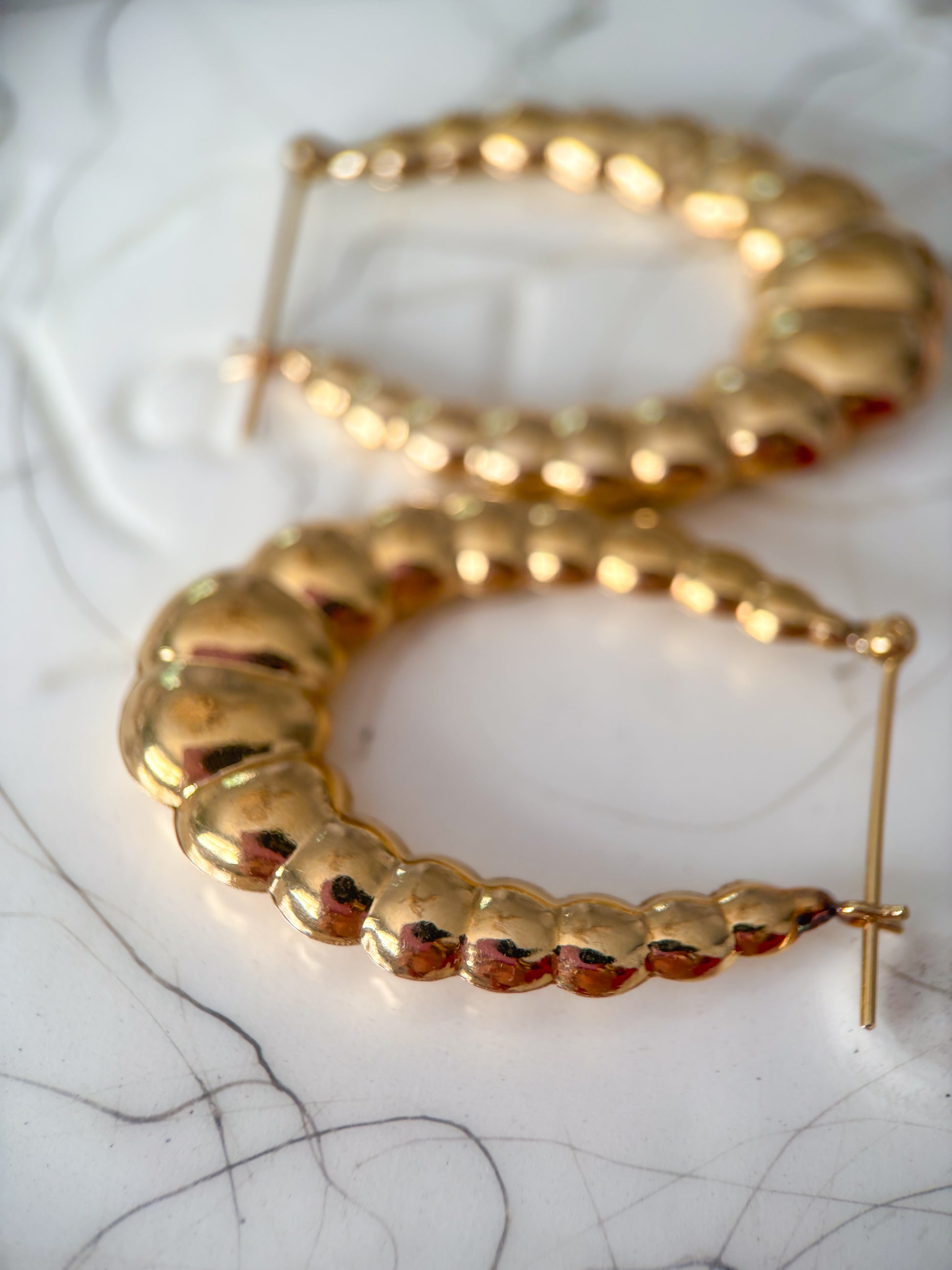 Vintage, 14k yellow gold, large scalloped hoops! These beauties are over 4 1/2 grams. They have a few small dings, but due to the design you really do not notice them. Please review all photos.