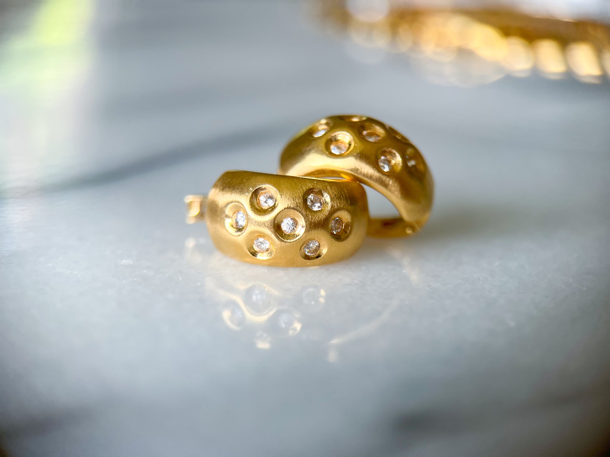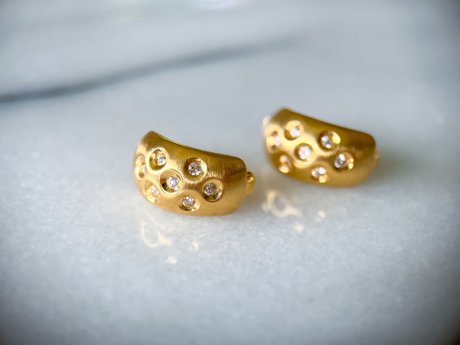 Really cool, vintage, 14k matte yellow gold with small CZs in a half hoop earring.