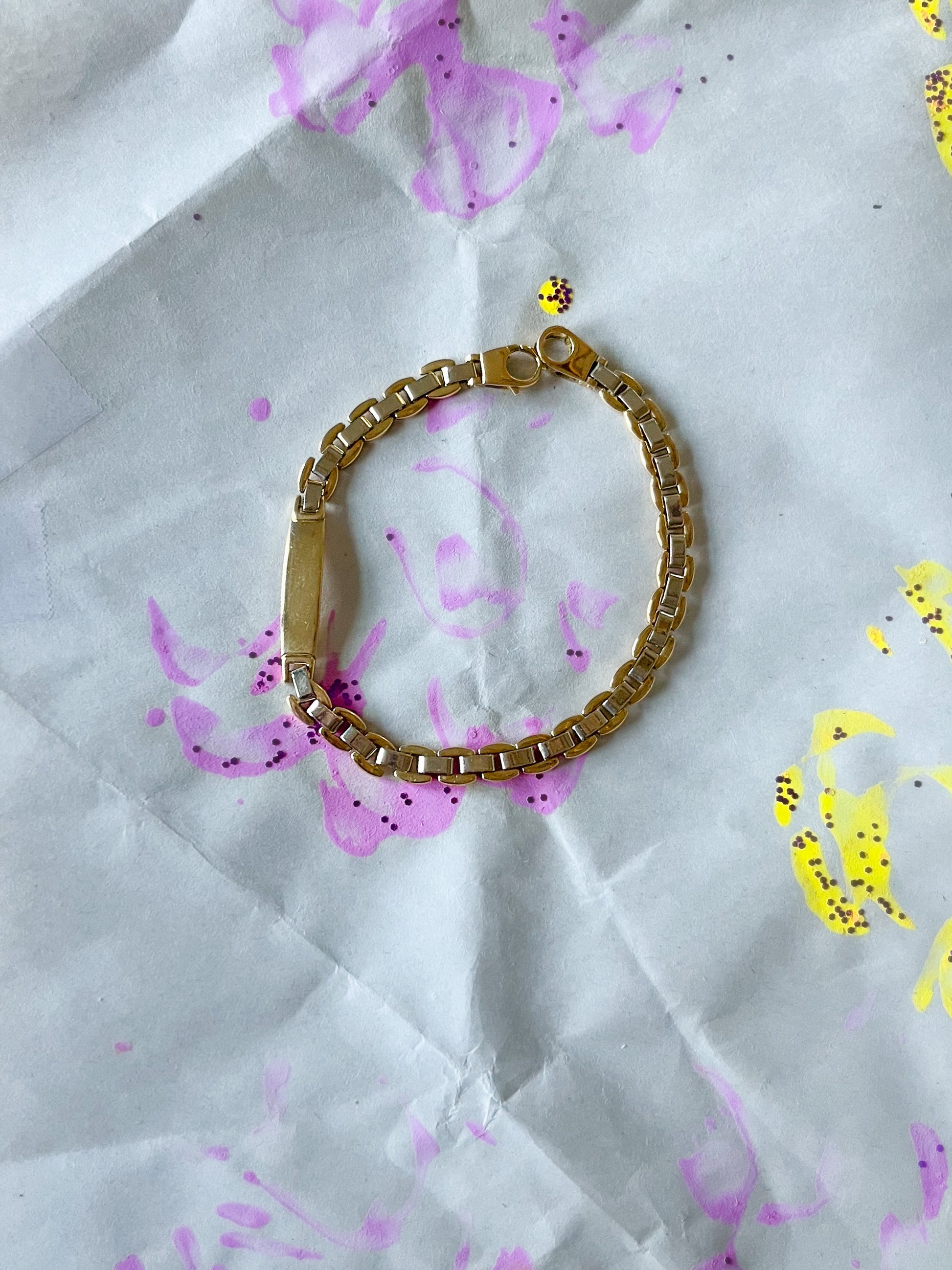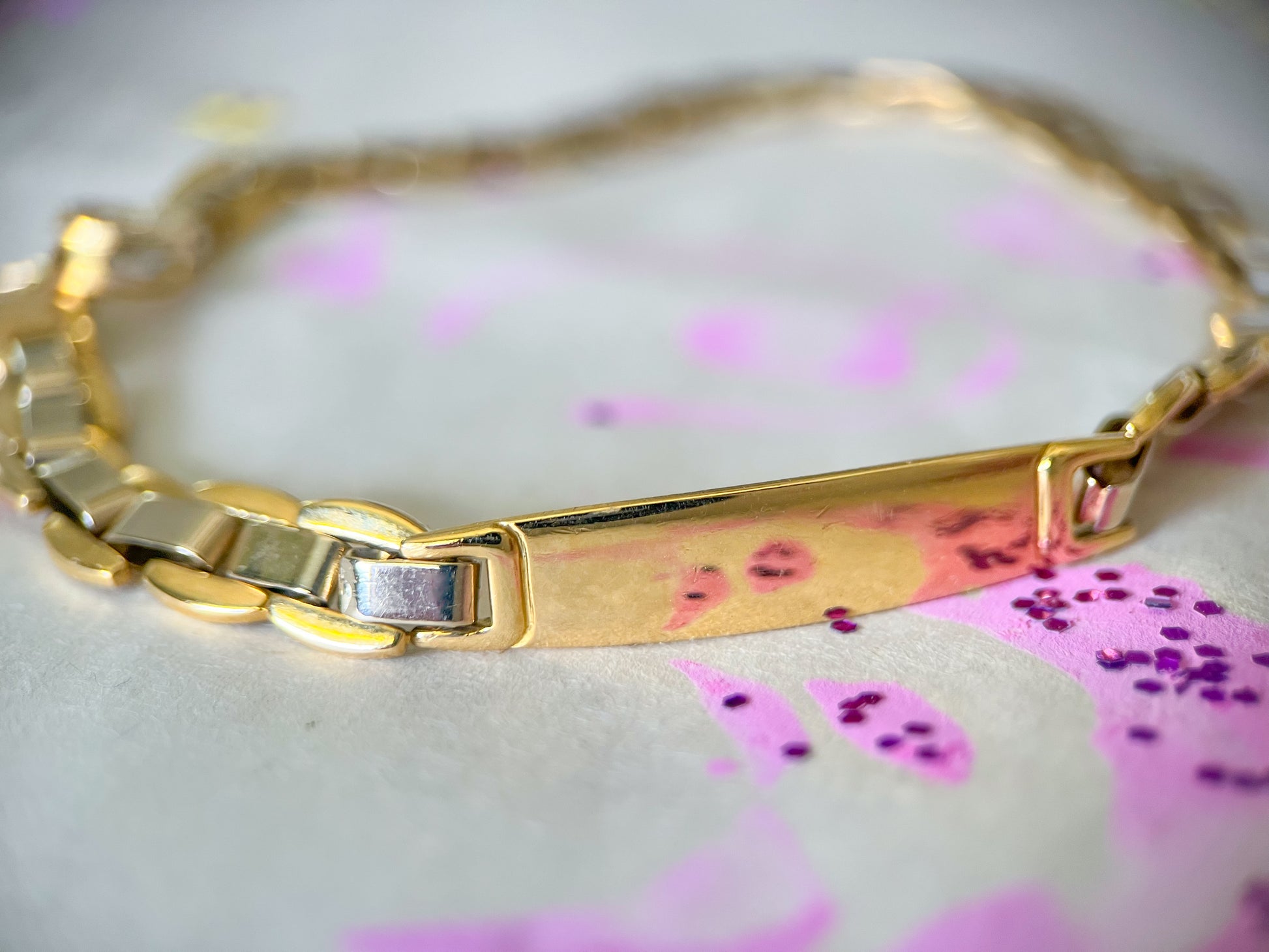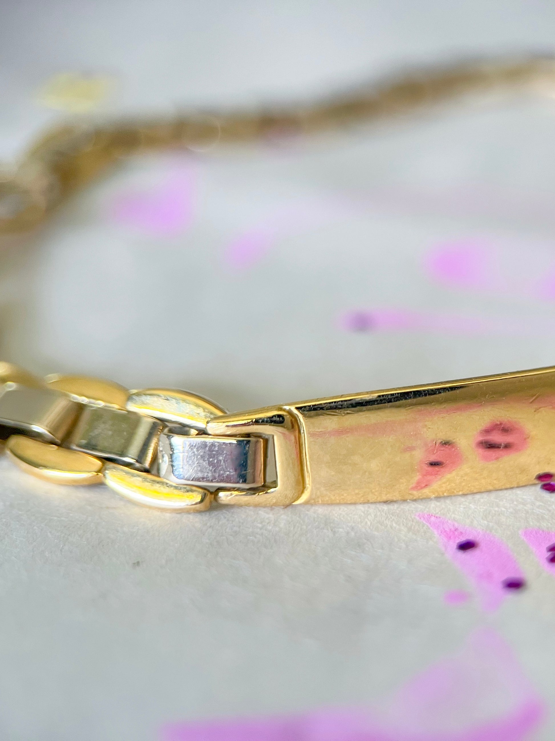 Really cool, 18k yellow and white gold ID bracelet. Currently 8 1/2 inches long, perfect for sizing to fit your wrist and personalizing.