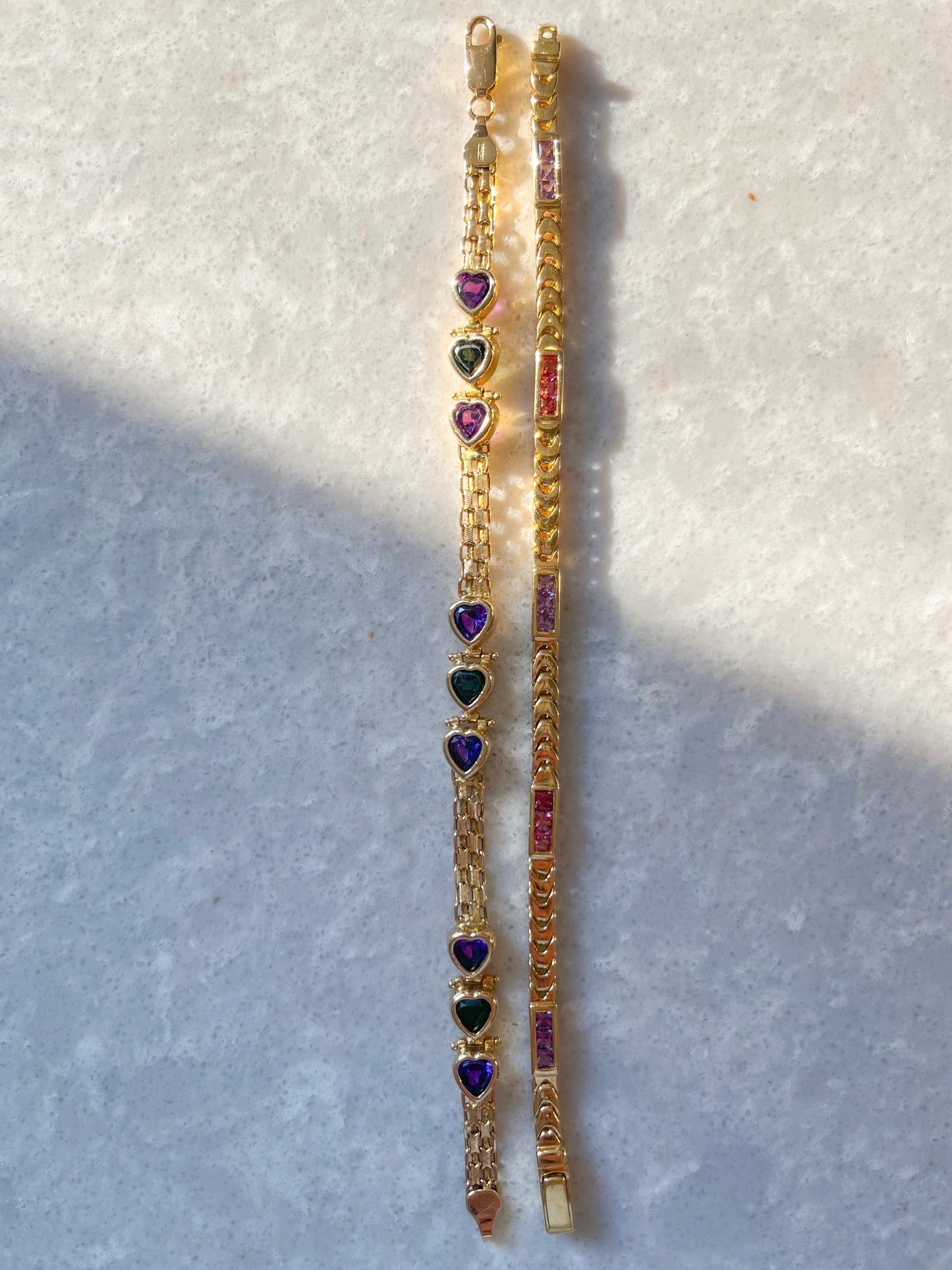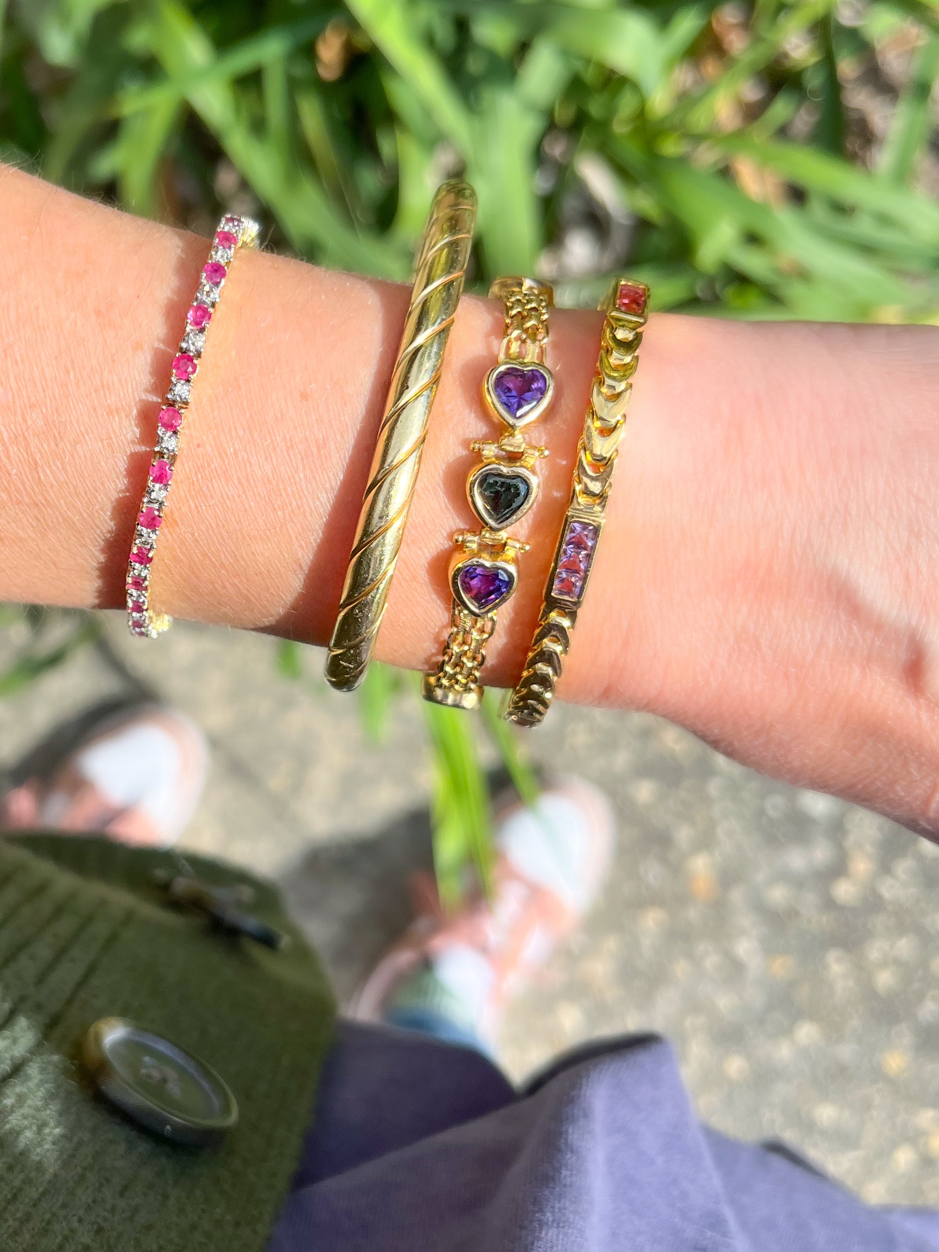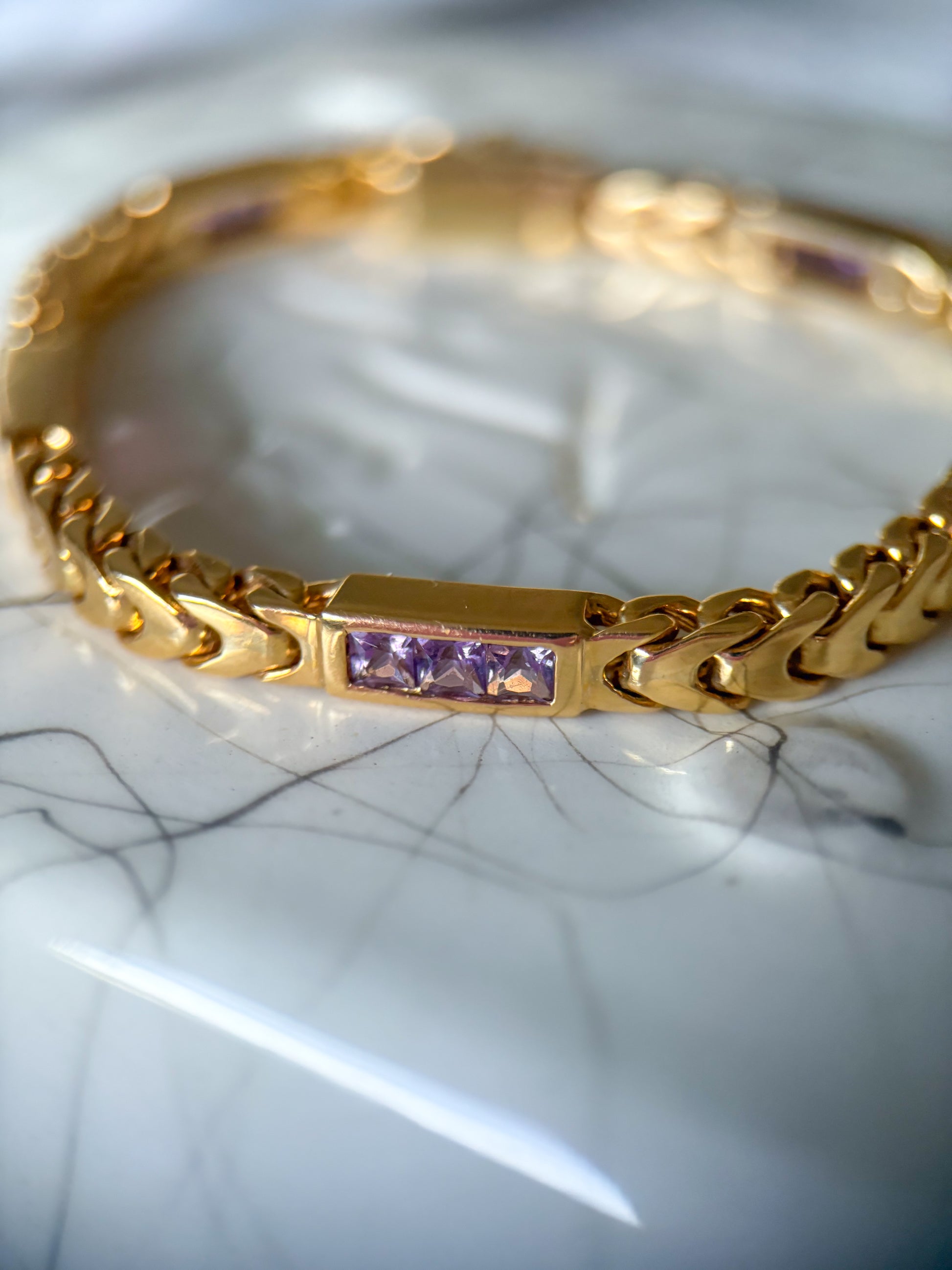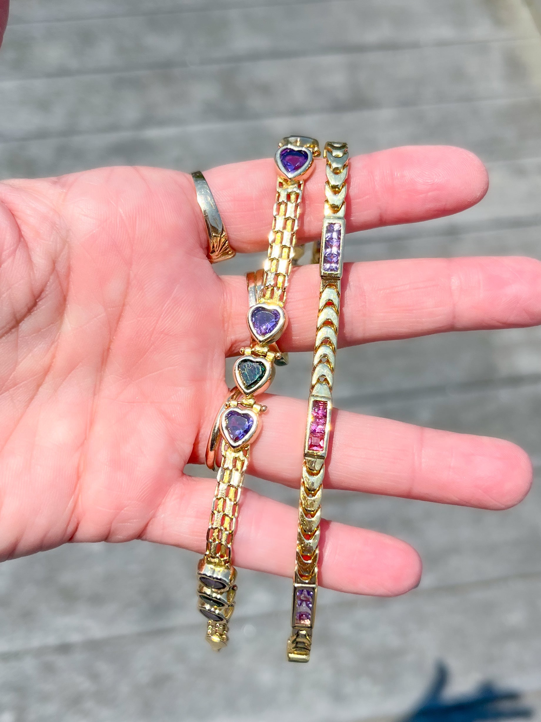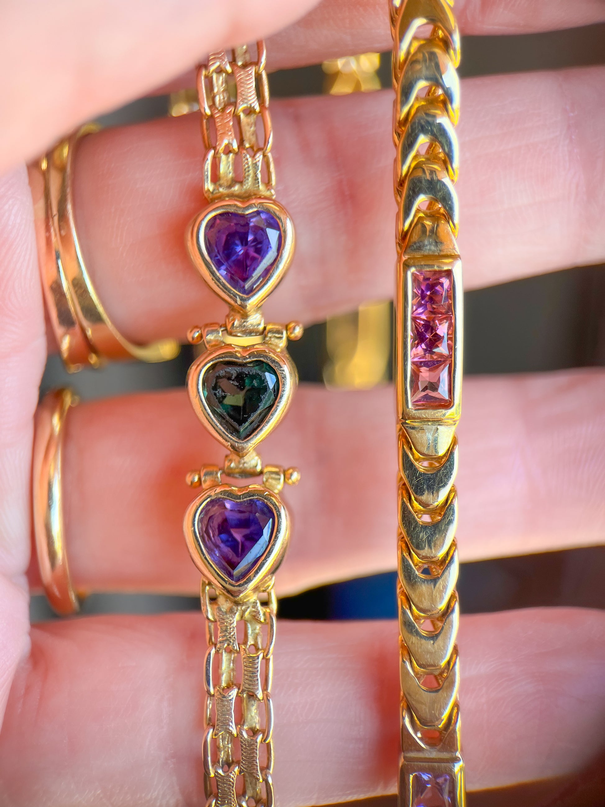 I AM ☠️☠️ This is my favorite bracelet right now in our entire collection, holy cr*p! The most insane, 18k yellow gold and natural square, pink and purple amethysts!