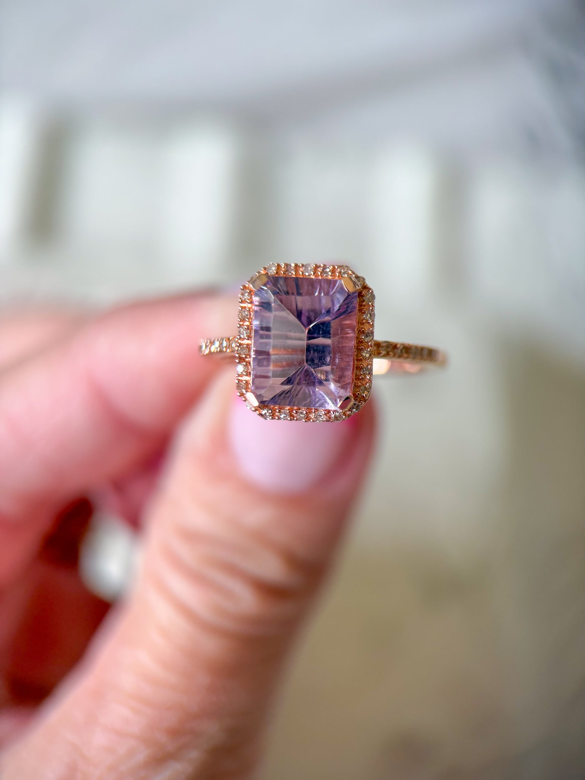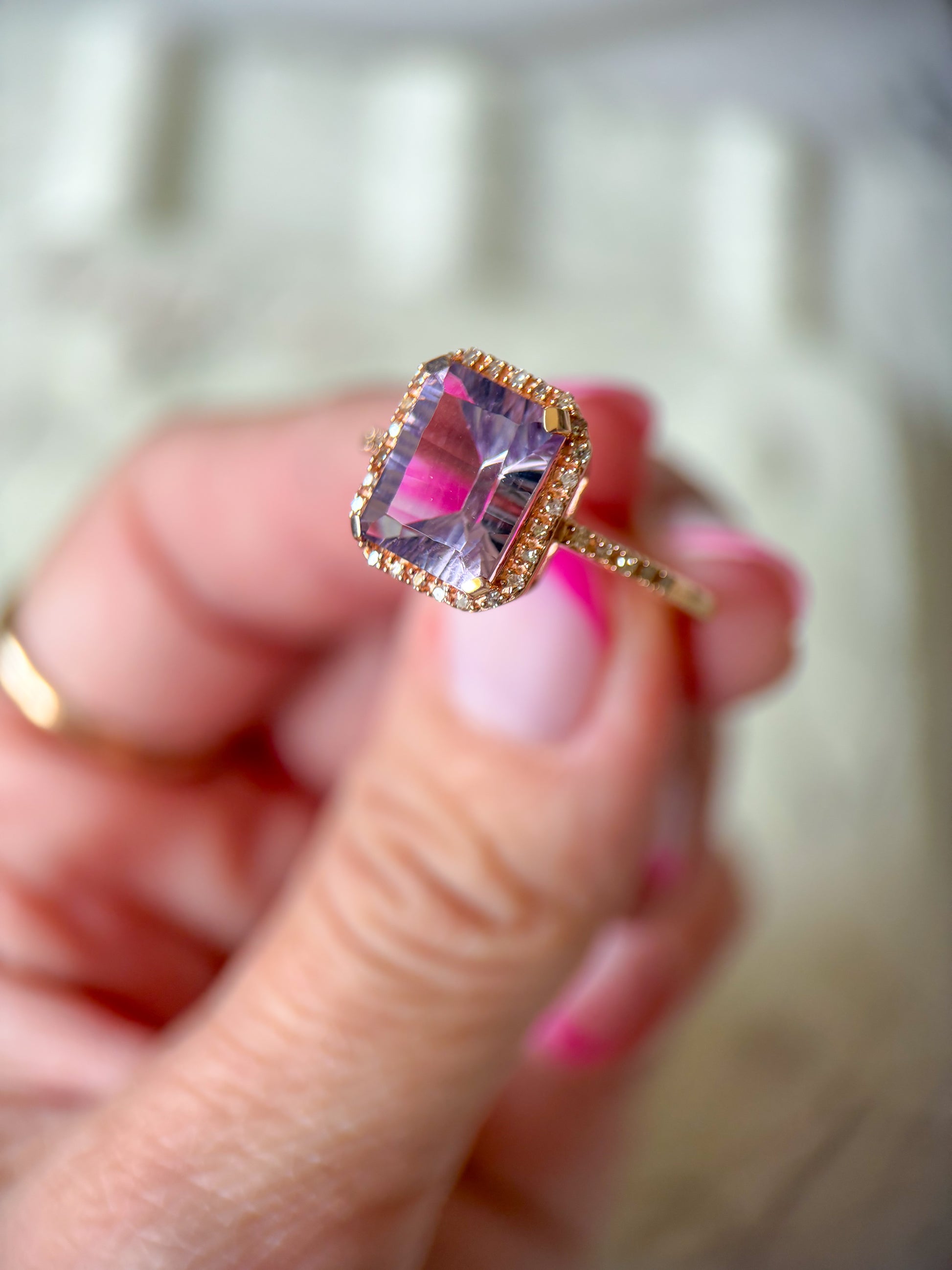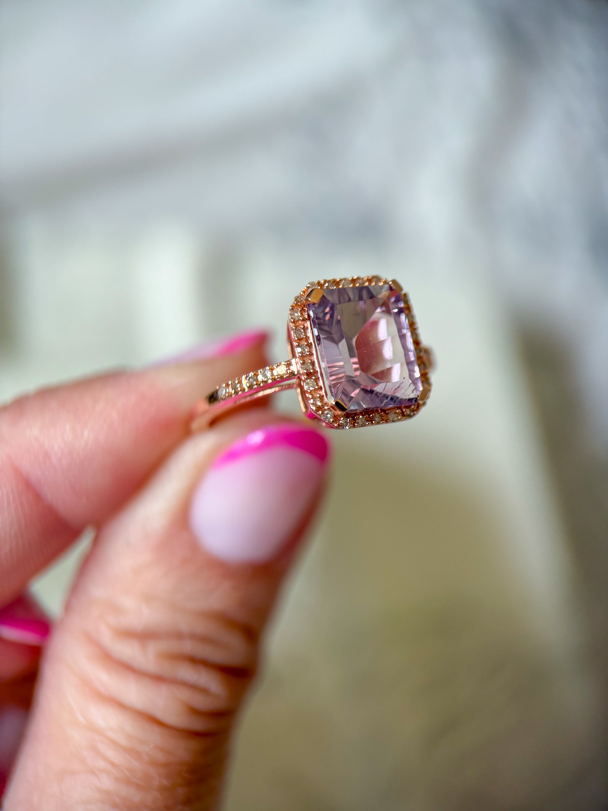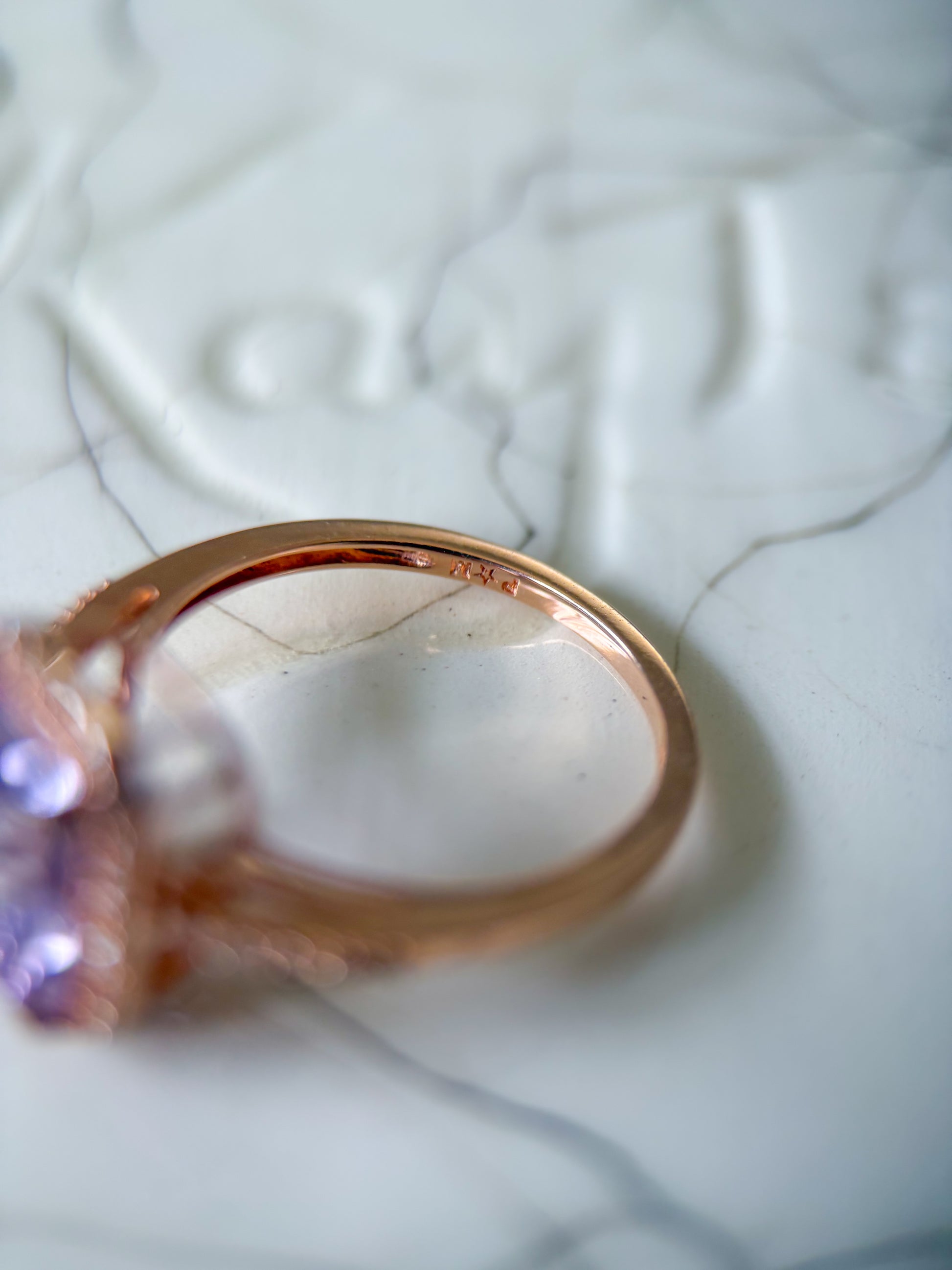 Really pretty, vintage, 10k rose gold with amethyst and natural diamonds.
