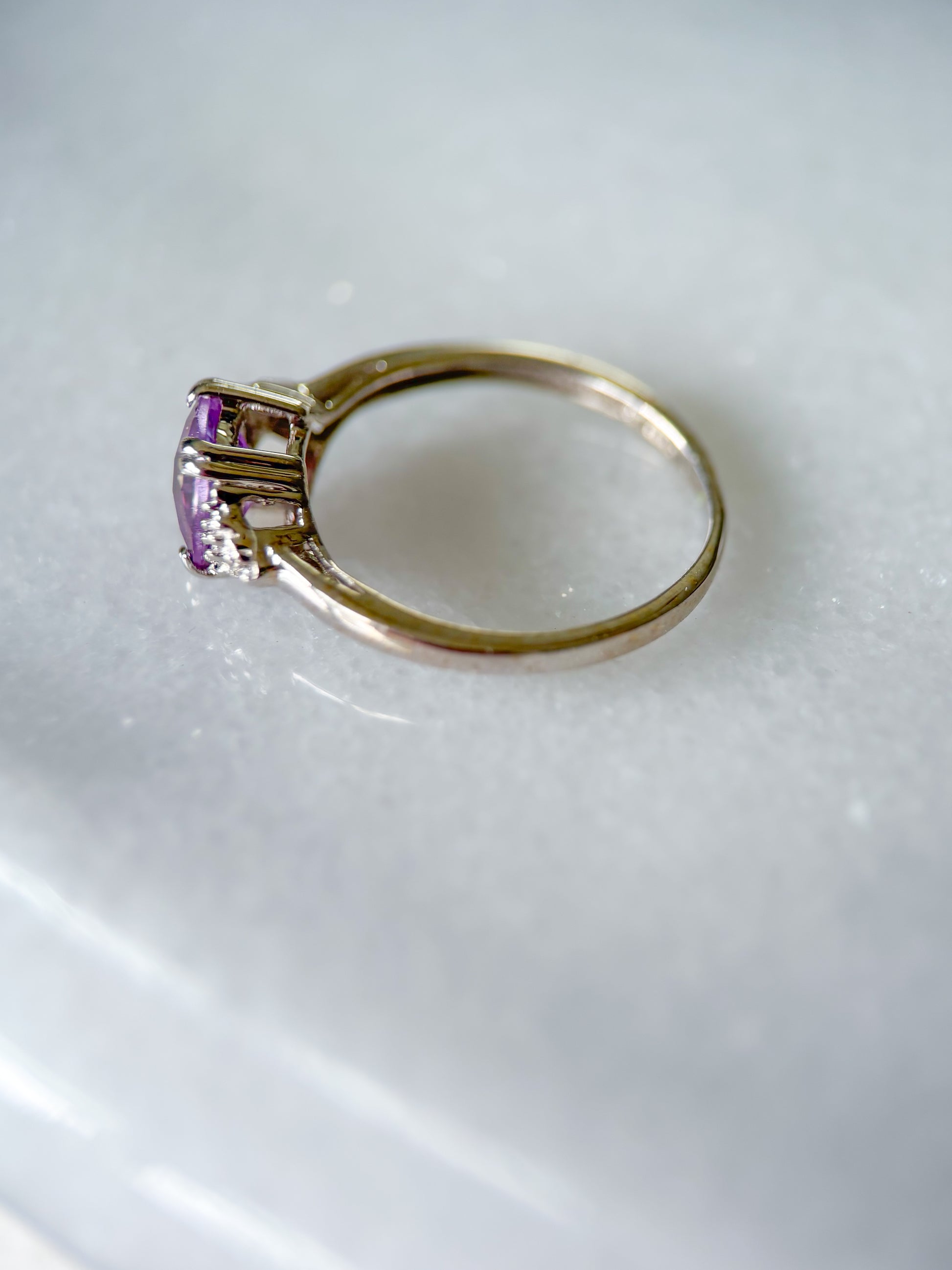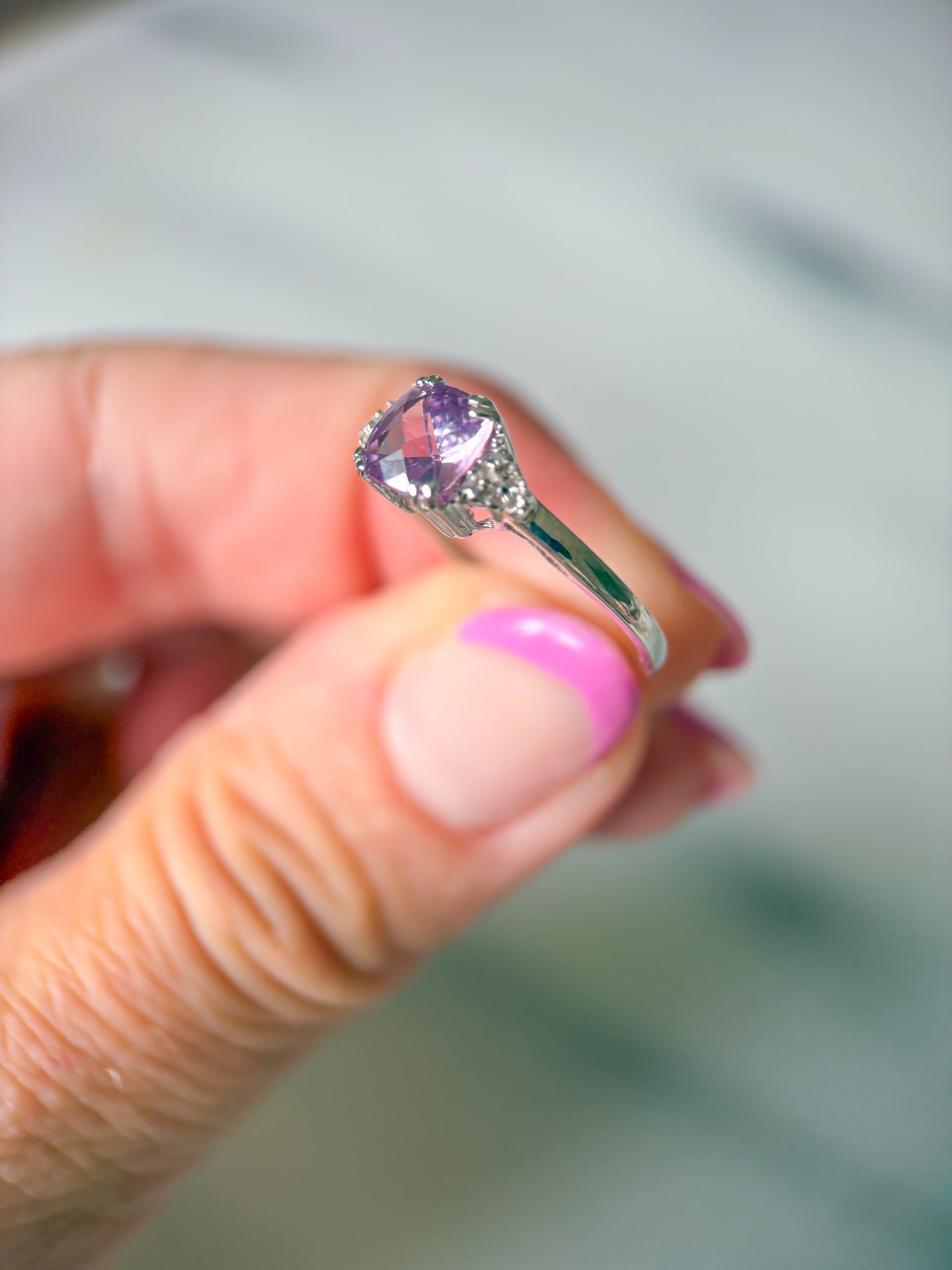 Sweet, 14k white gold with amethyst and natural diamonds. Ring is size 4 3/4 and can be resized at your local jeweler.