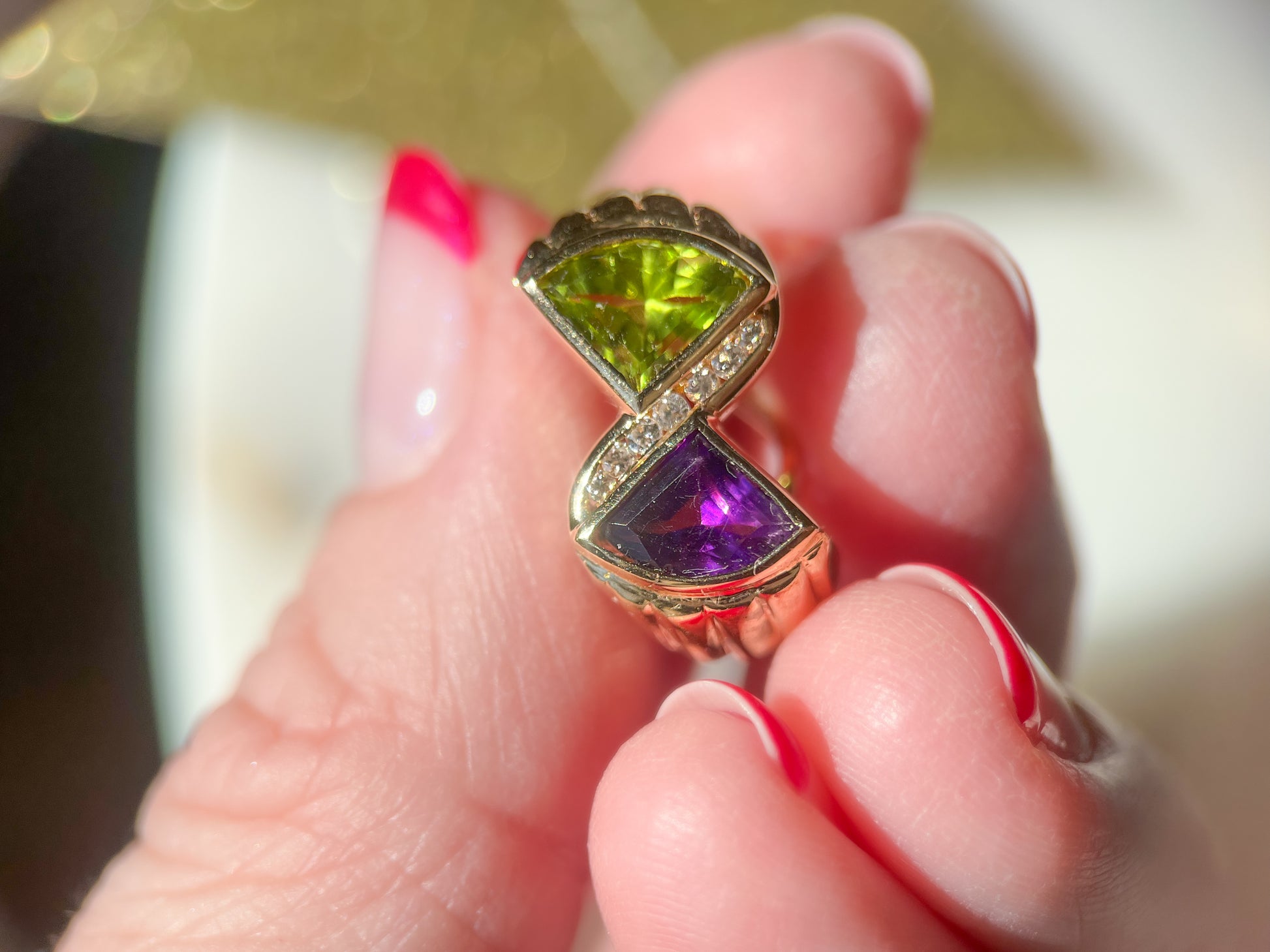 Amazing, vintage, triangle cut amethysts and peridots with diamonds set in 14k yellow gold. These earrings weigh over 8 grams and each earring features one amethyst, one peridot and 7 round diamonds. These are also open in the back to let the light through the stones. Circa 1980s.