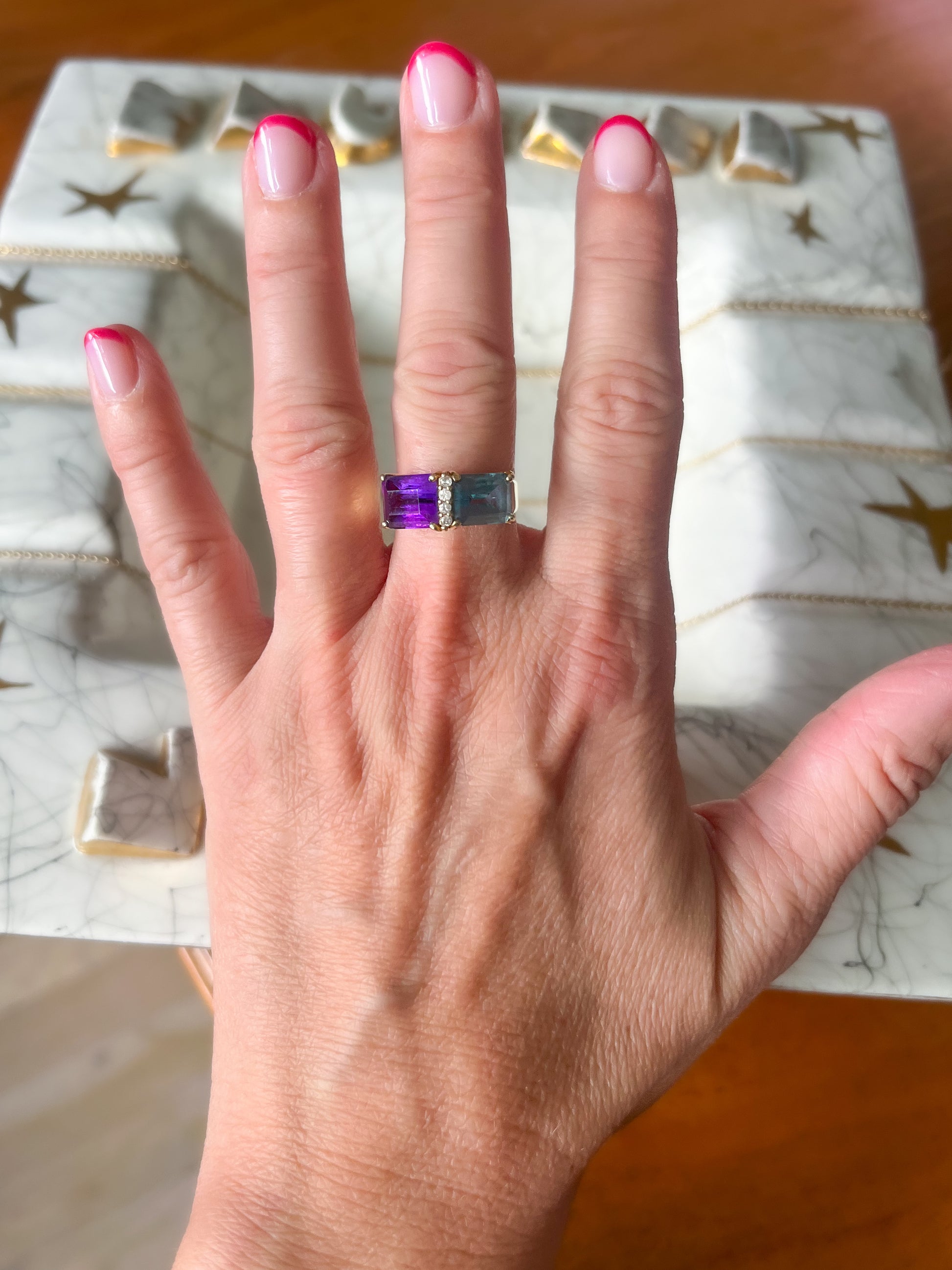 Stunning, vintage, 14k yellow gold, natural amethyst and topaz and natural diamond ring. This stunning ring is straight from the 80s and we are here for it! It looks awesome on! It's a size 6 1/2 and can be resized at your local jeweler.