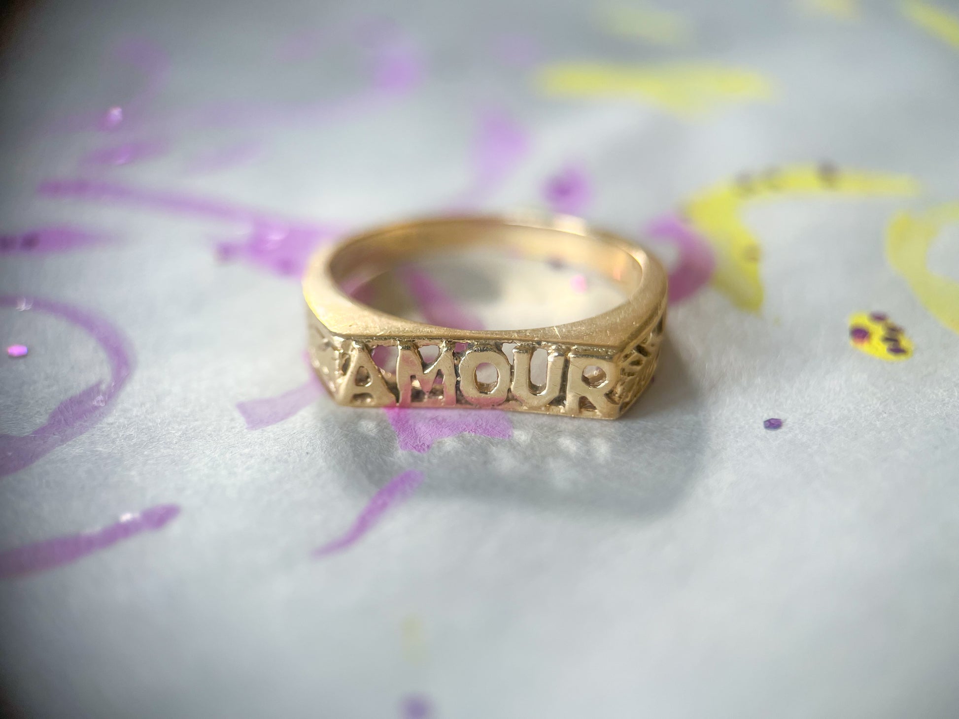 In love with this awesome, vintage, 14k yellow gold ring featuring the word "Amour". Someone please buy this for their significant other! <3 Can be resized at your local jeweler within reason.