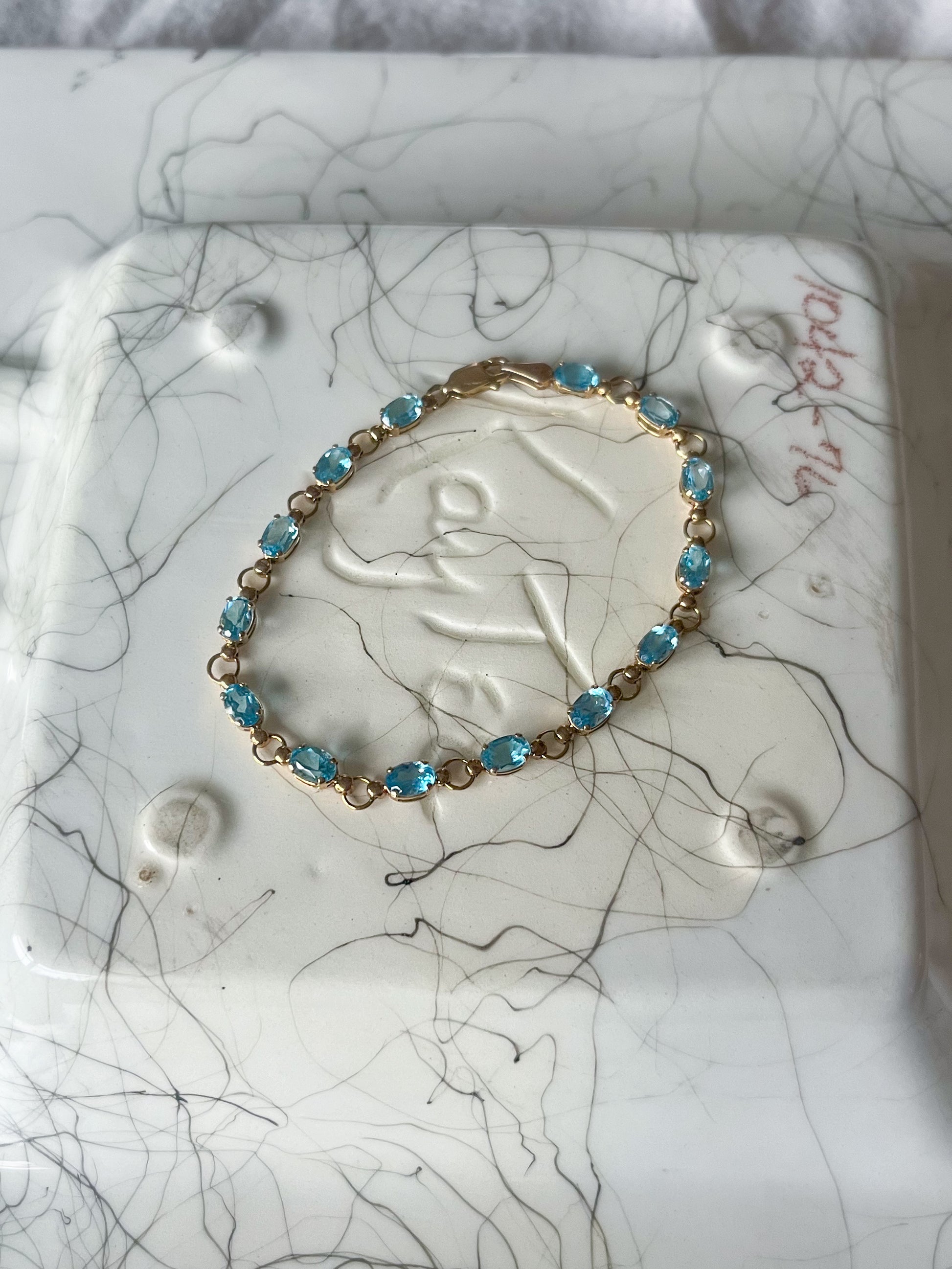 Sweet, vintage, 10k yellow gold and aquamarine bracelet. Really love this nice pop of color for any wrist!