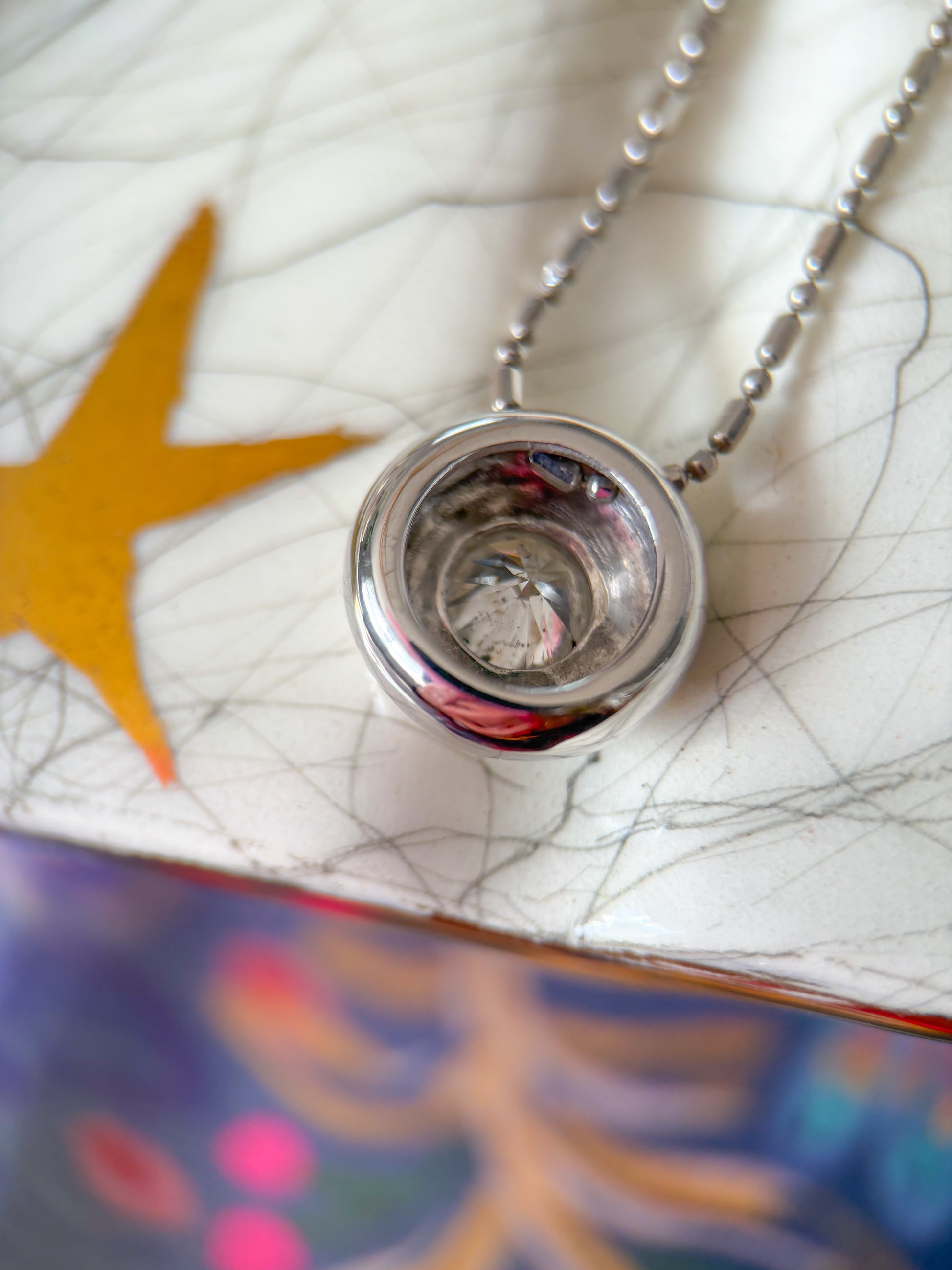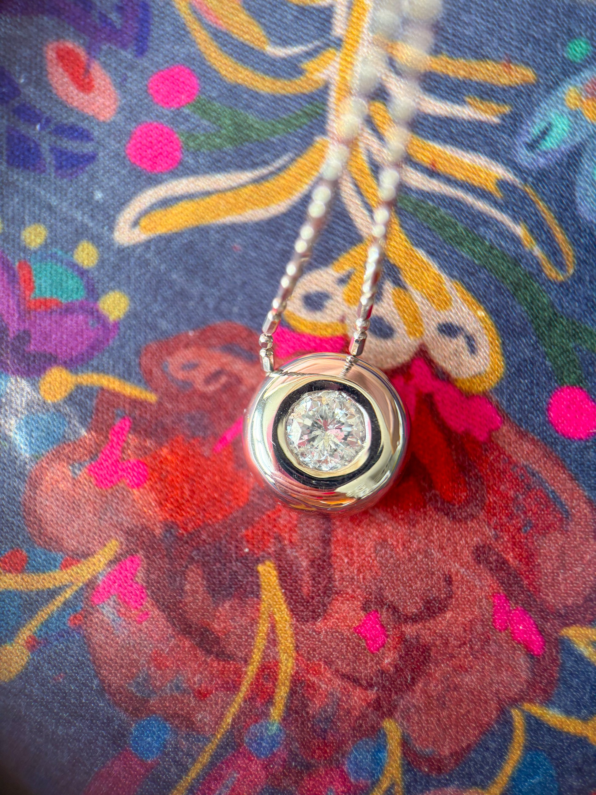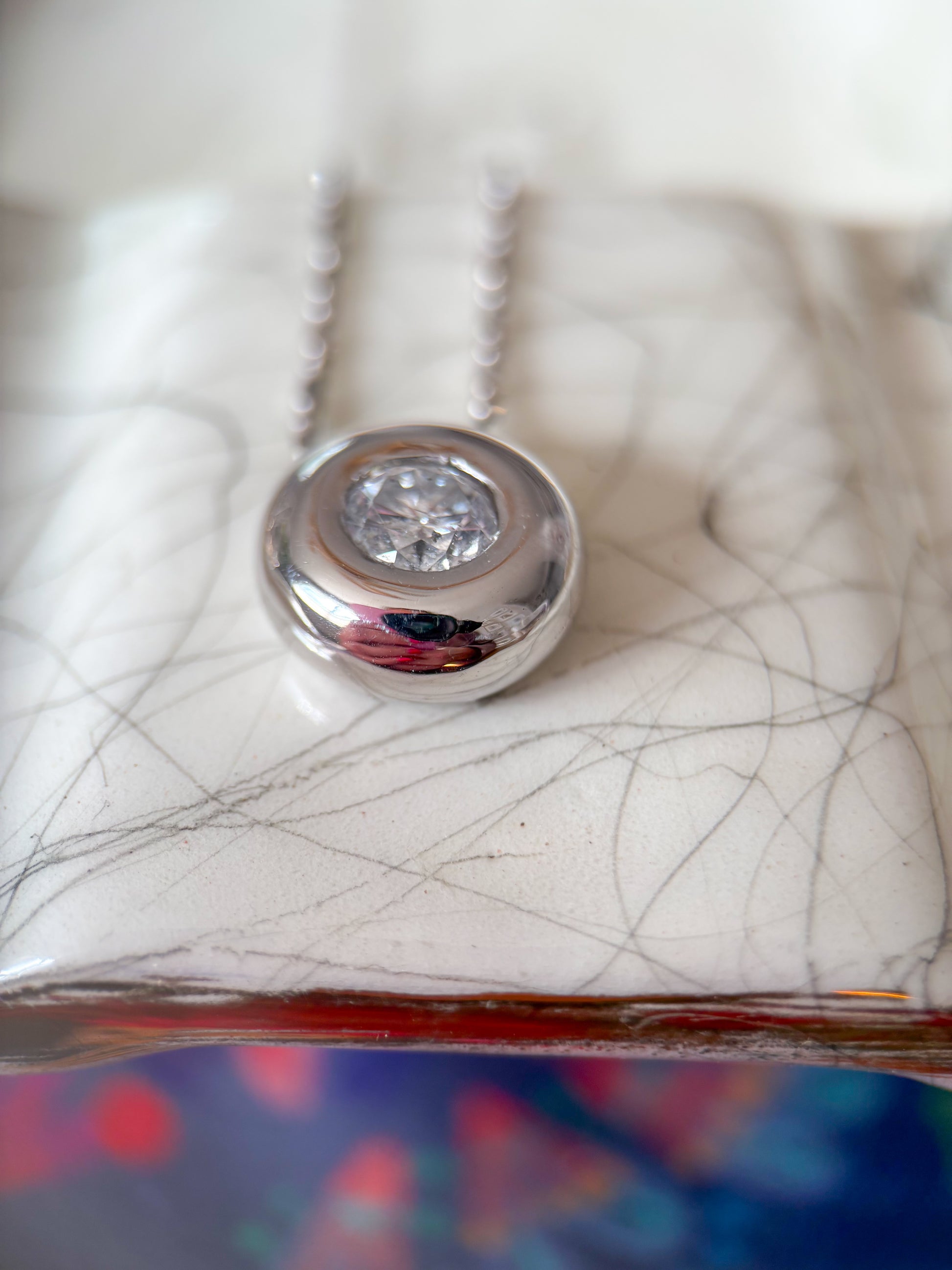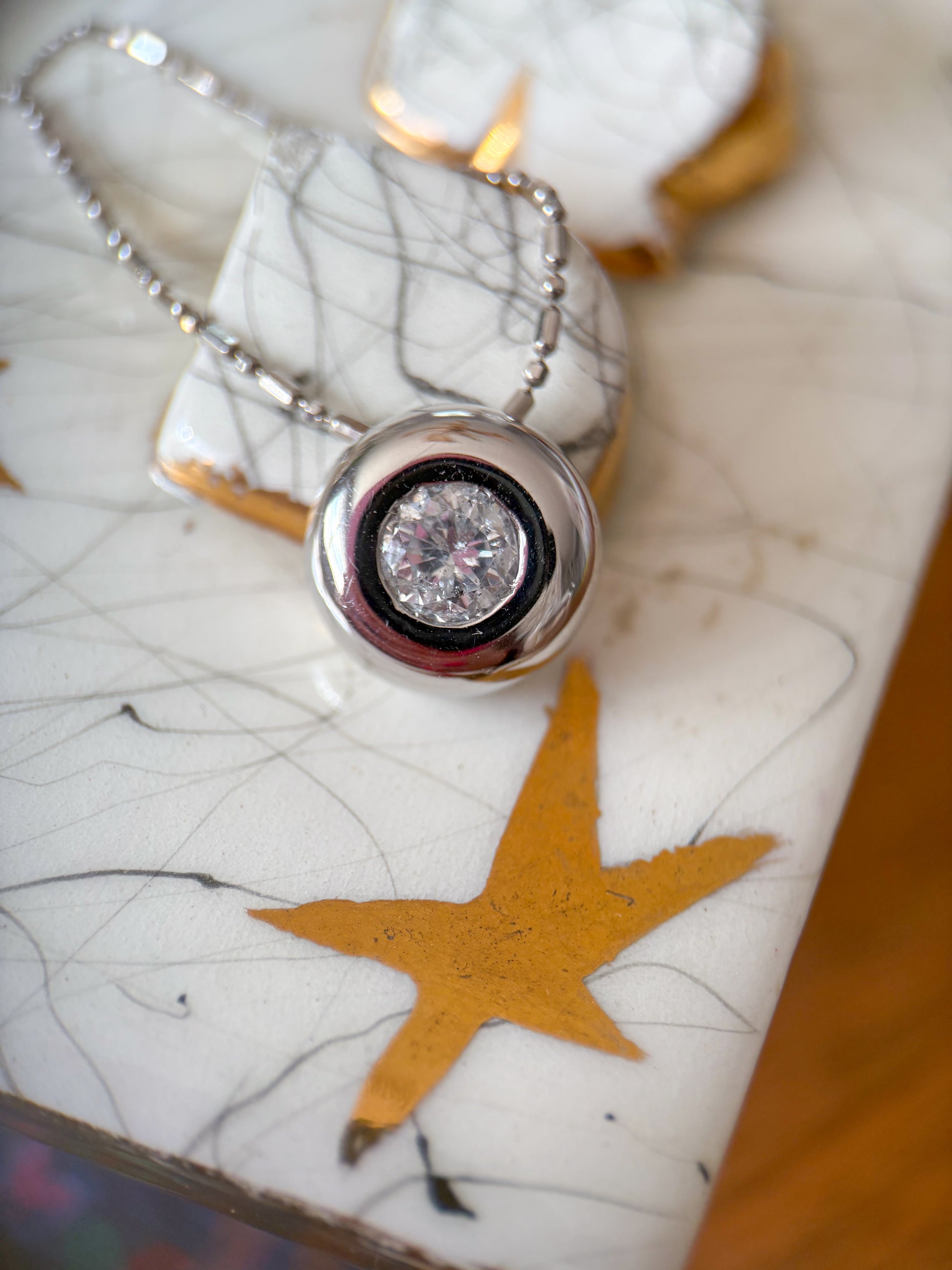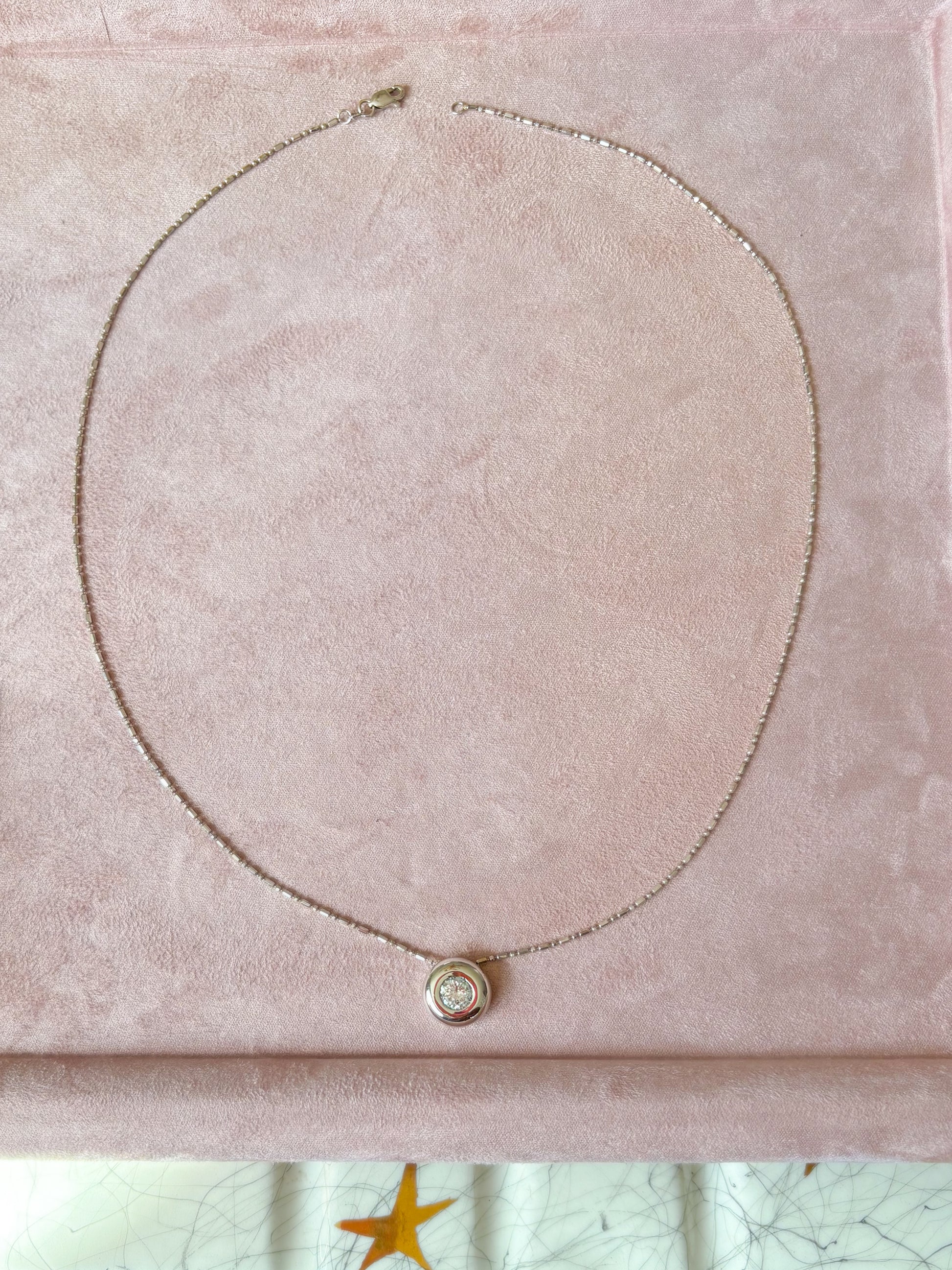Absolutely in love with this 1 ct natural diamond, bezel set in white gold, and attached to a super unique ball chain. WOW. This combo weighs over 6 grams, and has a total length of 20 inches. Simply stunning.