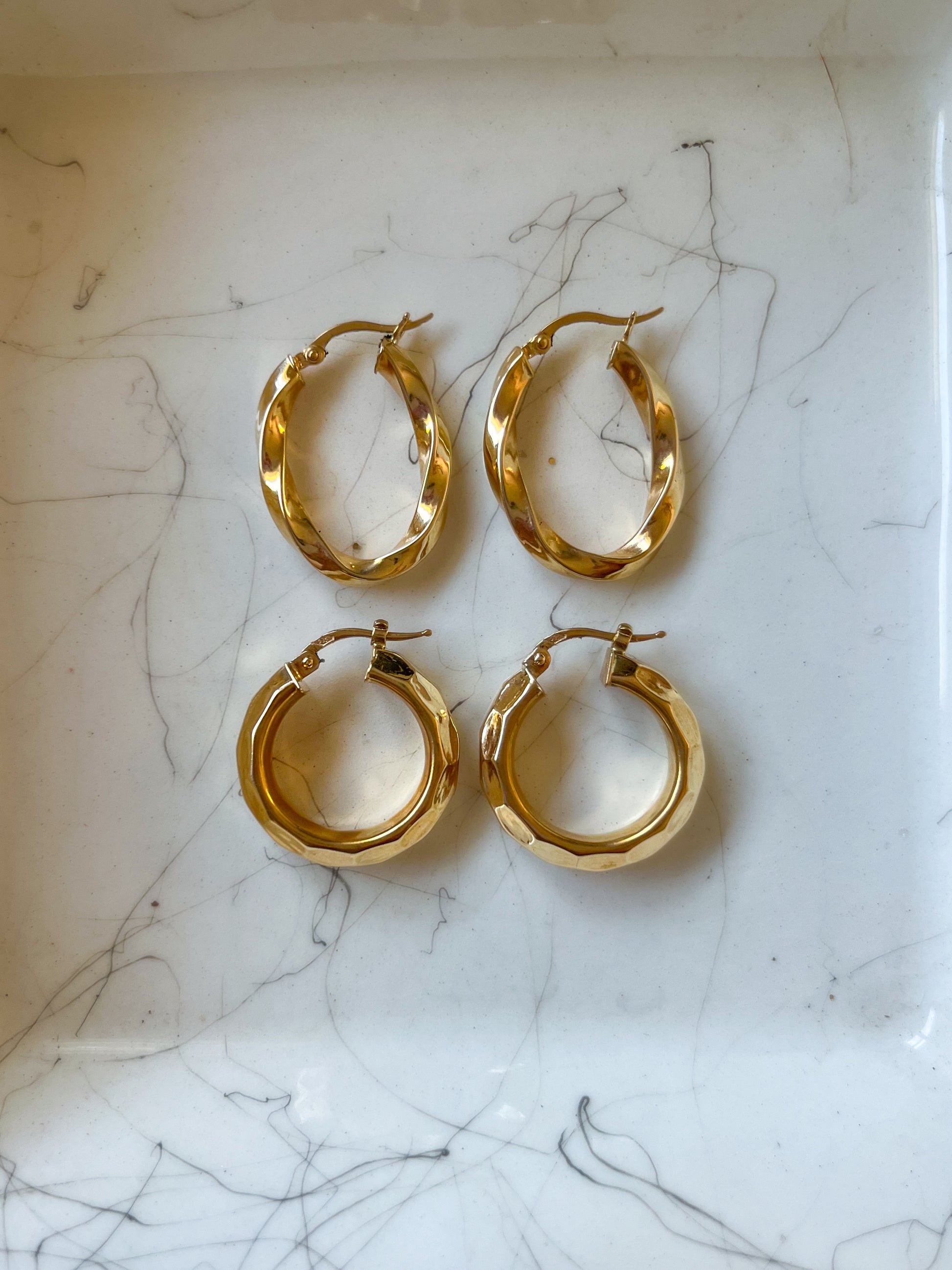 Super cool, vintage, 14k yellow gold chunky, faceted hoops! These weigh over 3 and a half grams and are light weight on the ear.