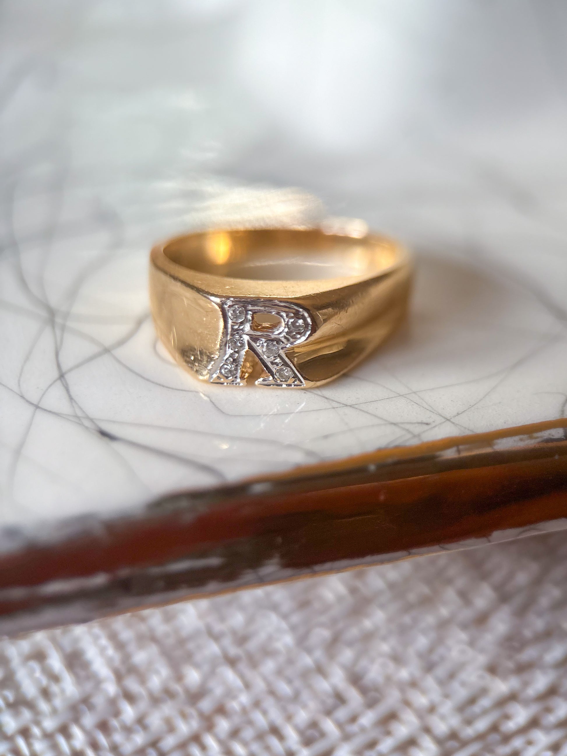 Vintage Chunky Natural Diamond Letter "R" 14k Yellow Gold Ring