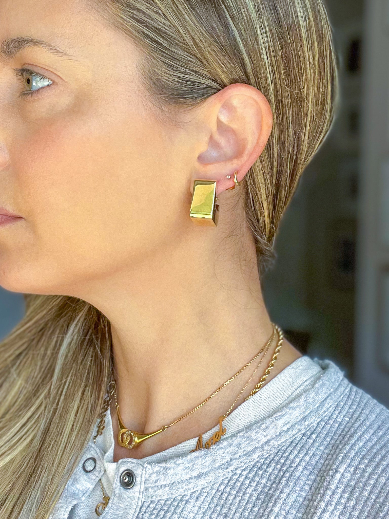 Insane, super large, chunky, vintage, squared earrings - Straight from the 70s! These bad boys are hollow, so they are light on the ear but show very large! These earrings are just incredible!! There is one small discoloration on the bottom of one of the earrings - see photo.
