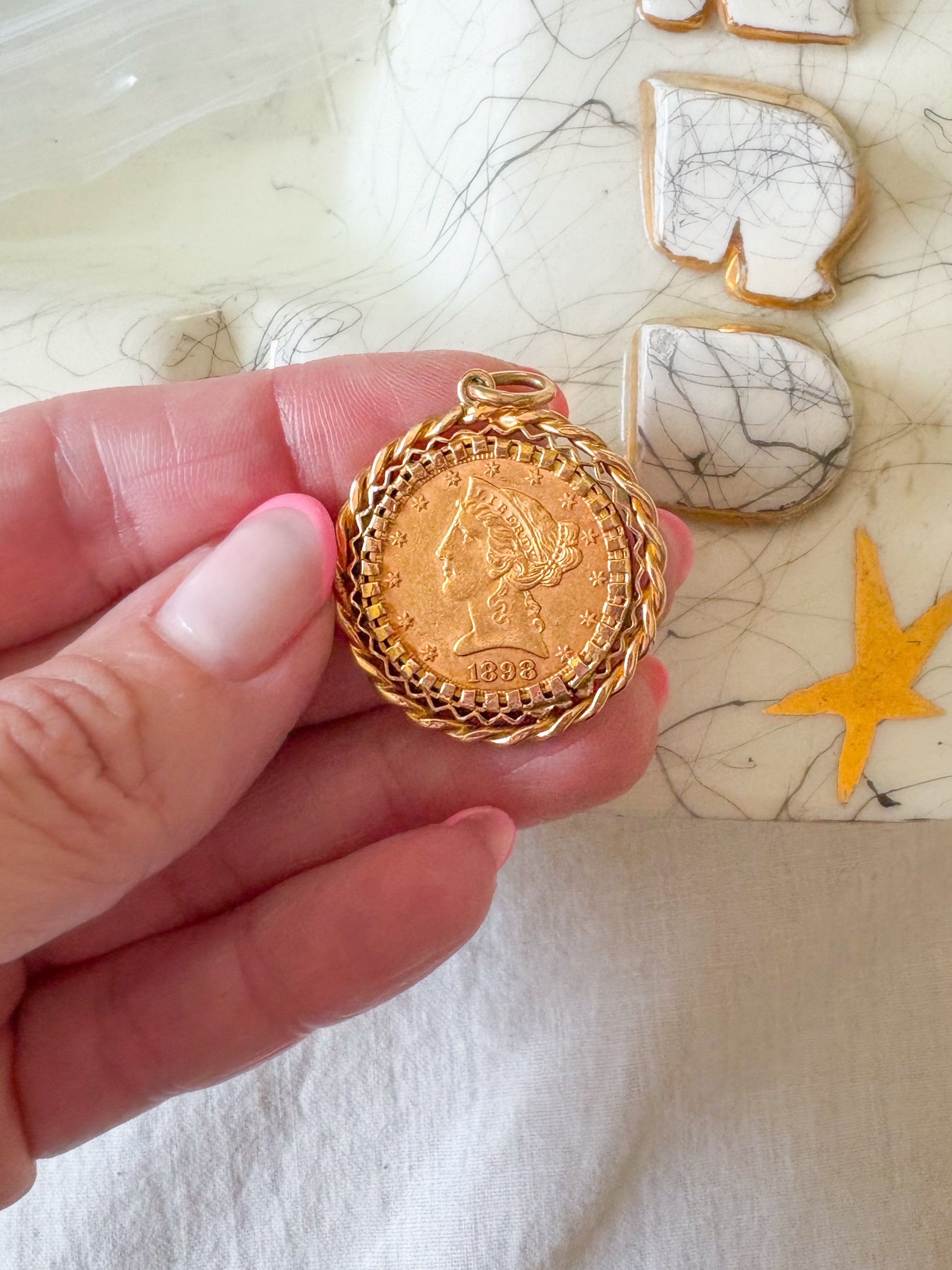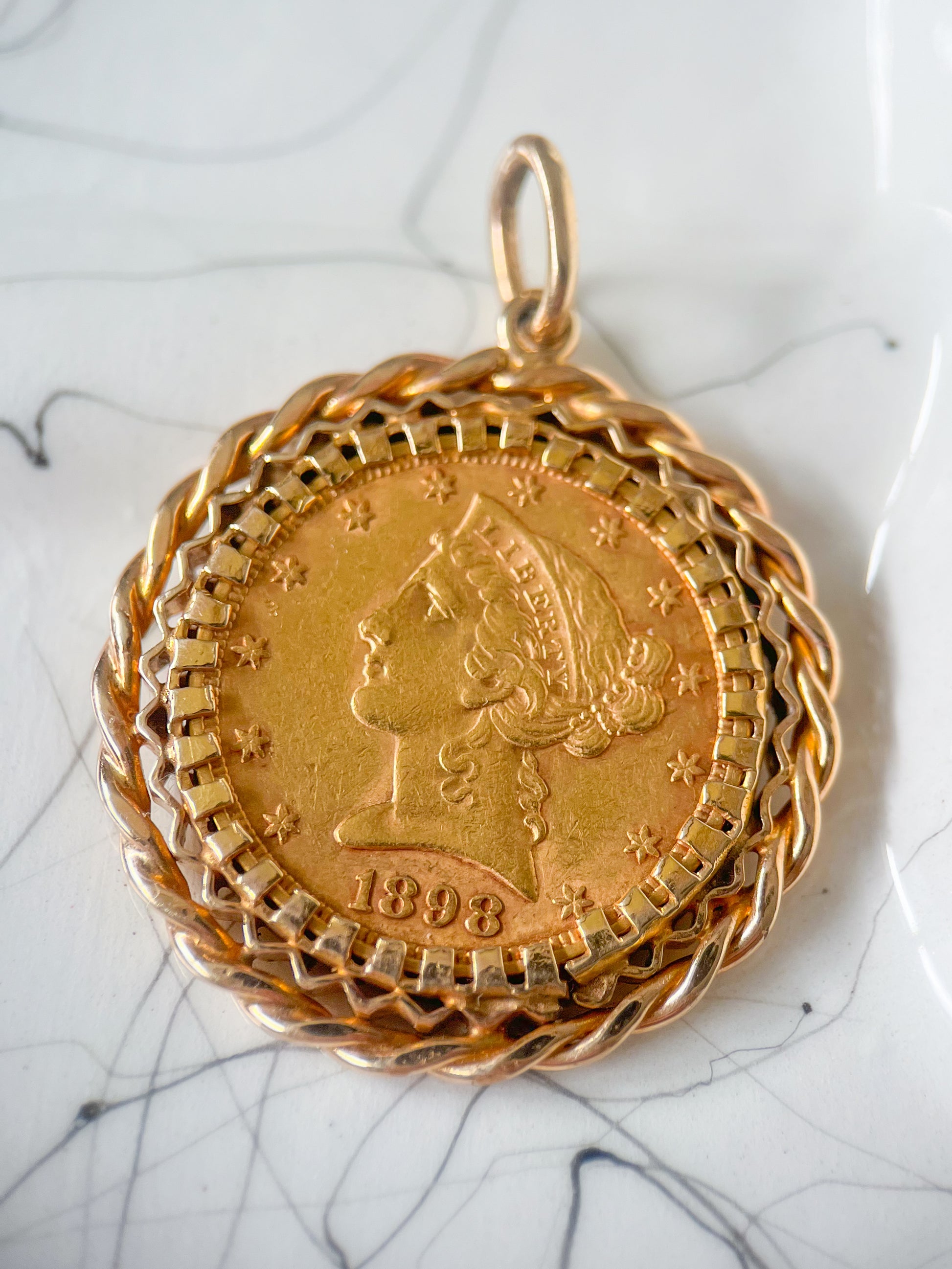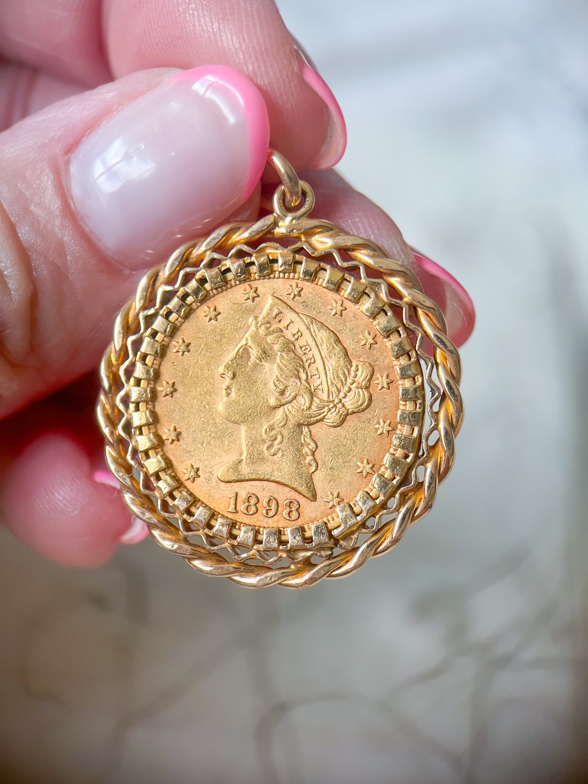 Absolutely stunning, vintage gold coin. This 5 dollar liberty head coin is dated 1898 and is made of 21k yellow gold. The decorative rope frame is 14k yellow gold. Chain not included.