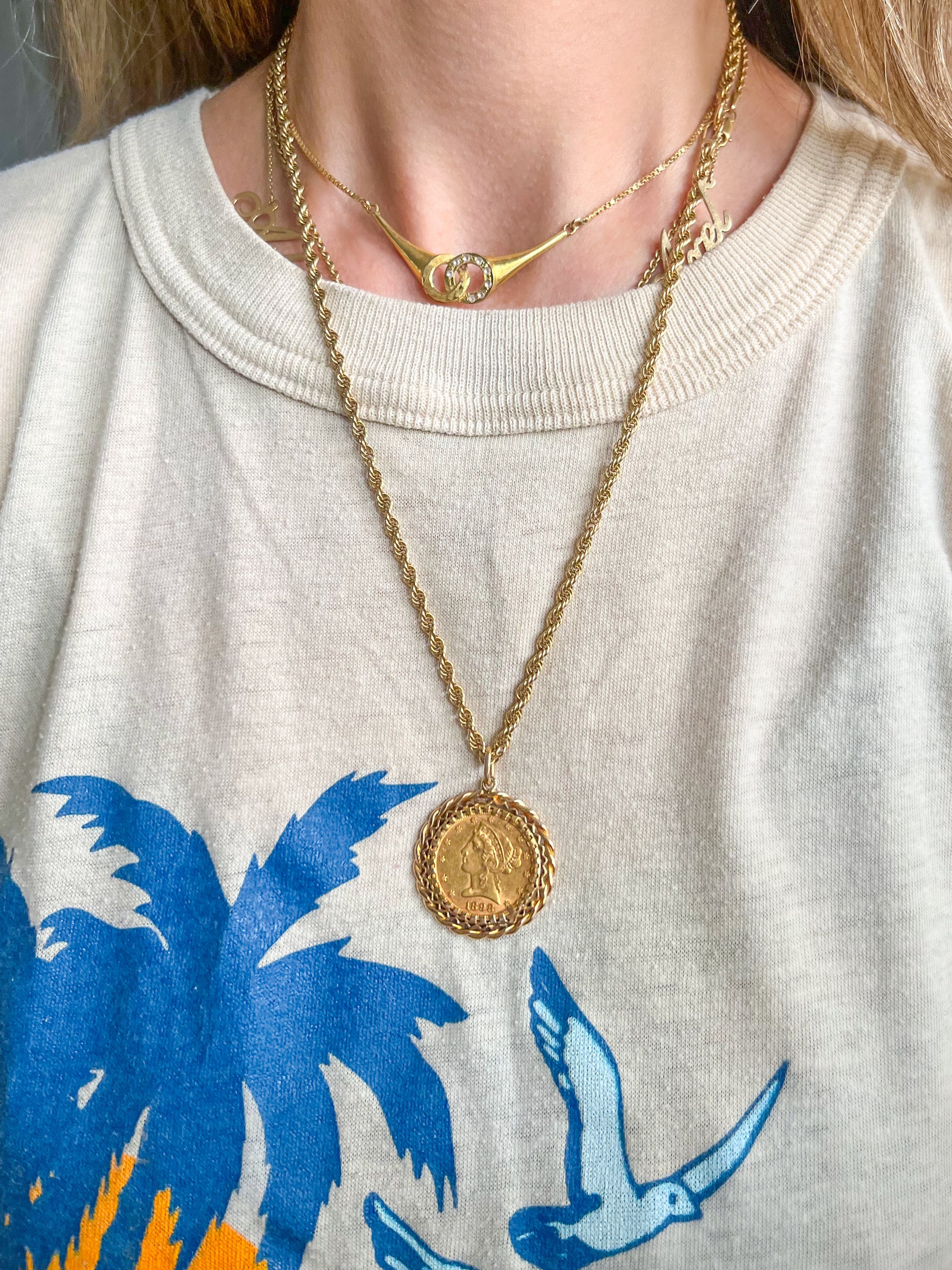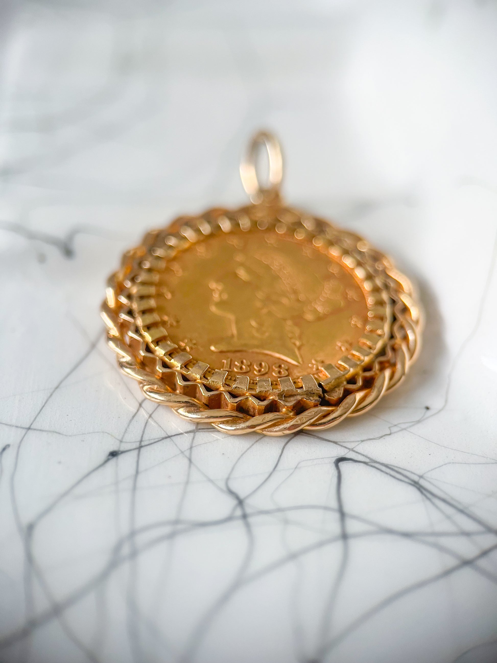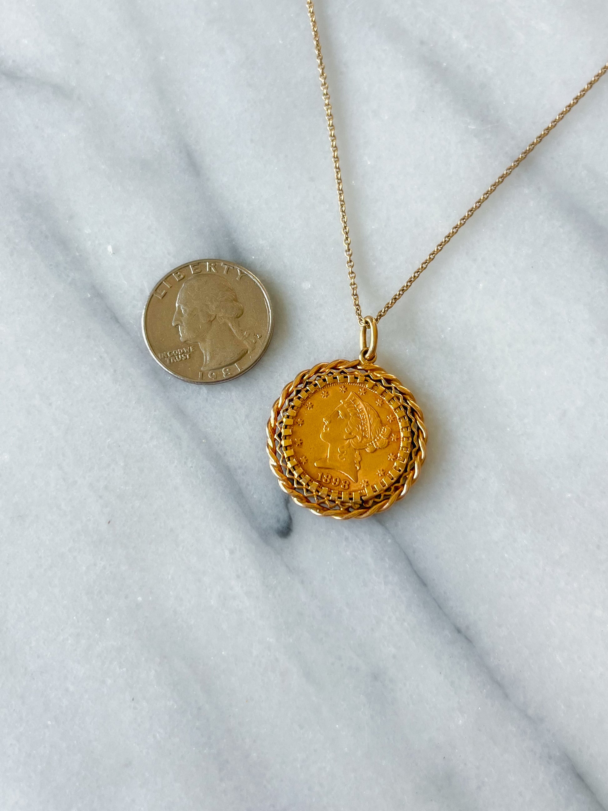 Absolutely stunning, vintage gold coin. This 5 dollar liberty head coin is dated 1898 and is made of 21k yellow gold. The decorative rope frame is 14k yellow gold. Chain not included.